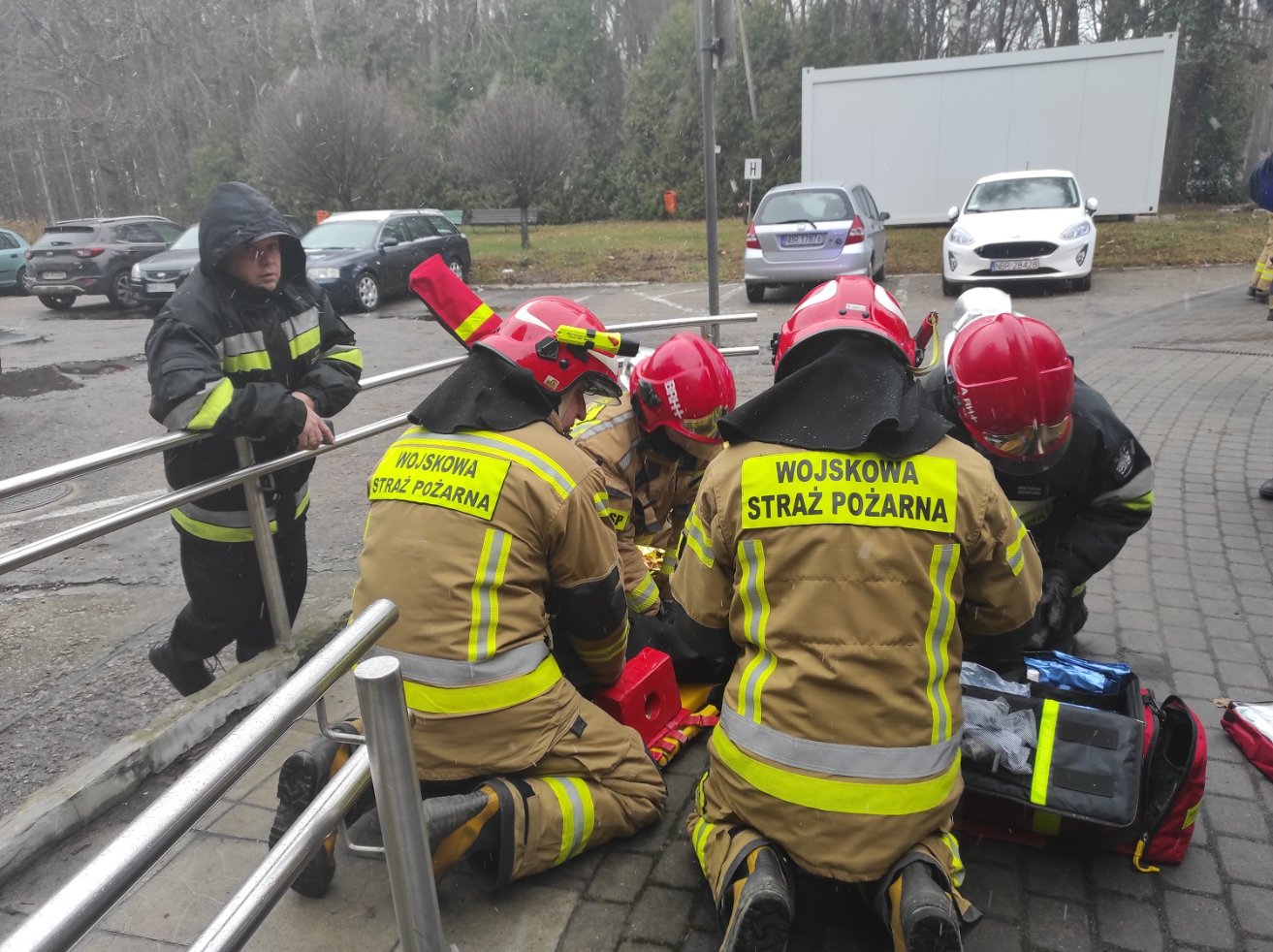 Trud pracy w sprzęcie ochrony układu oddechowego po kilku minutach przyniósł oczekiwany efekt w postaci ewakuacji rannych pracowników kotłowni na zewnątrz. Wobec rannych do czasu przyjazdu załogi ZRM strażacy wdrożyli procedury medyczne.