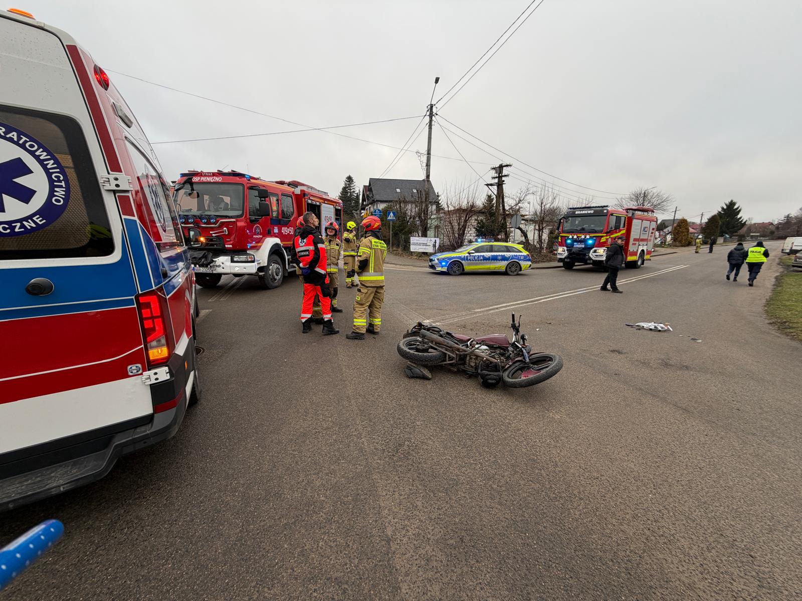 Do pierwszego zdarzenia doszło w Pieniężnie na skrzyżowaniu ulic Generalskiej i Królewieckiej zderzyły się motorower oraz samochód osobowy Peugeot. W wyniku zderzenia obrażeń doznał kierujący jednośladem. Poszkodowany został przetransportowany do szpitala w Elblągu. Osoby podróżujące samochodem nie odniosły obrażeń. Na miejscu wypadku pracowały służby ratunkowe. Interweniowali strażacy z Państwowej Straży Pożarnej w Braniewie oraz strażacy ochotnicy z jednostki OSP Pieniężno. Okoliczności zdarzenia wyjaśniali braniewscy policjanci.