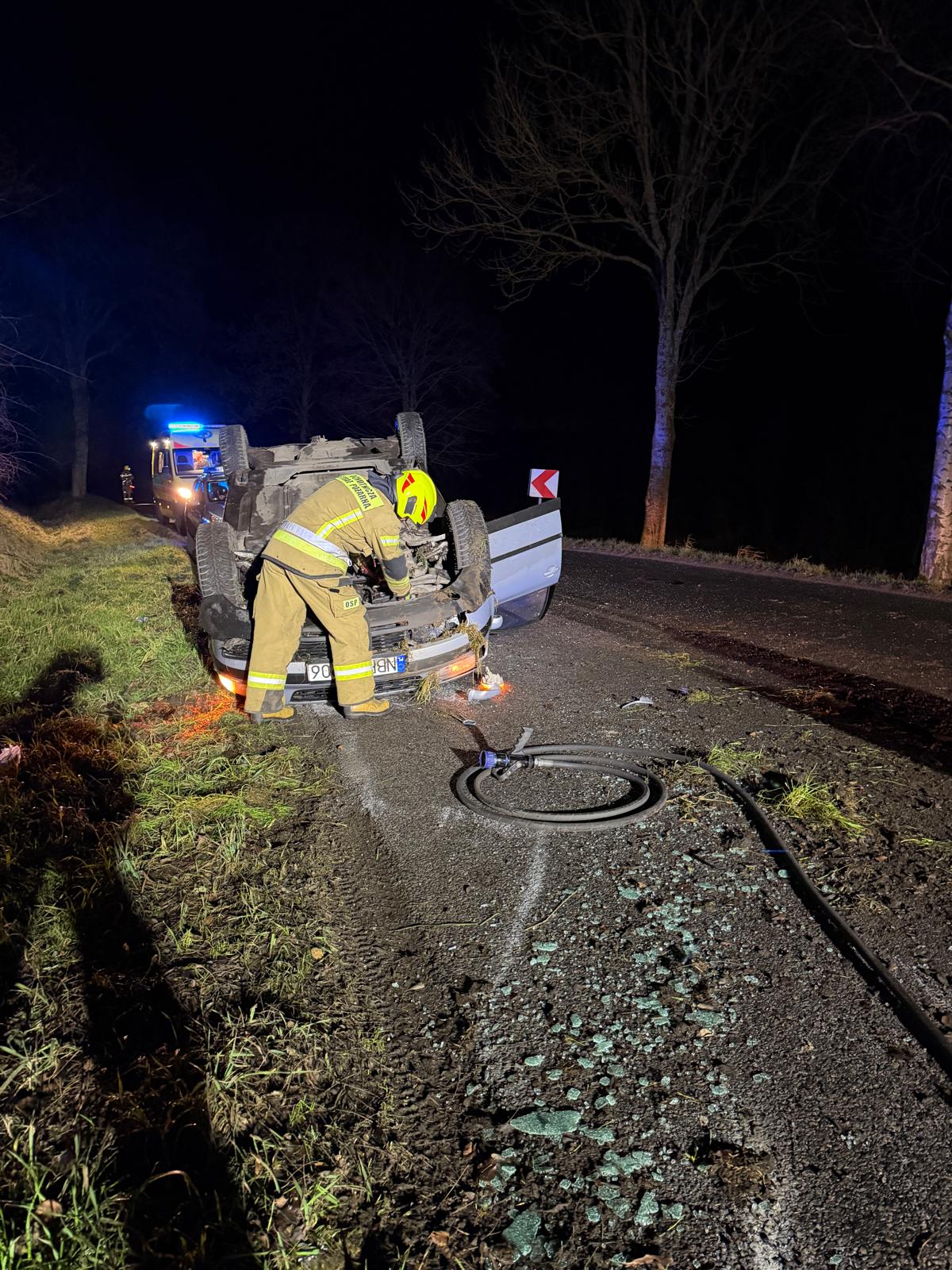 Kilka godzin później na drodze wojewódzkiej nr 507 (Pieniężno – Cieszęta) doszło do groźnie wyglądającego zdarzenia drogowego. Na łuku jezdni kierująca Volkswagenem Passatem straciła panowanie nad pojazdem, w wyniku czego samochód dachował. Kobieta podróżująca autem samodzielnie opuściła pojazd jeszcze przed przybyciem służb ratunkowych. Kierująca nie wymagała hospitalizacji. Miejsce zdarzenia zostało zabezpieczone przez strażaków ochotników z OSP Pieniężno.