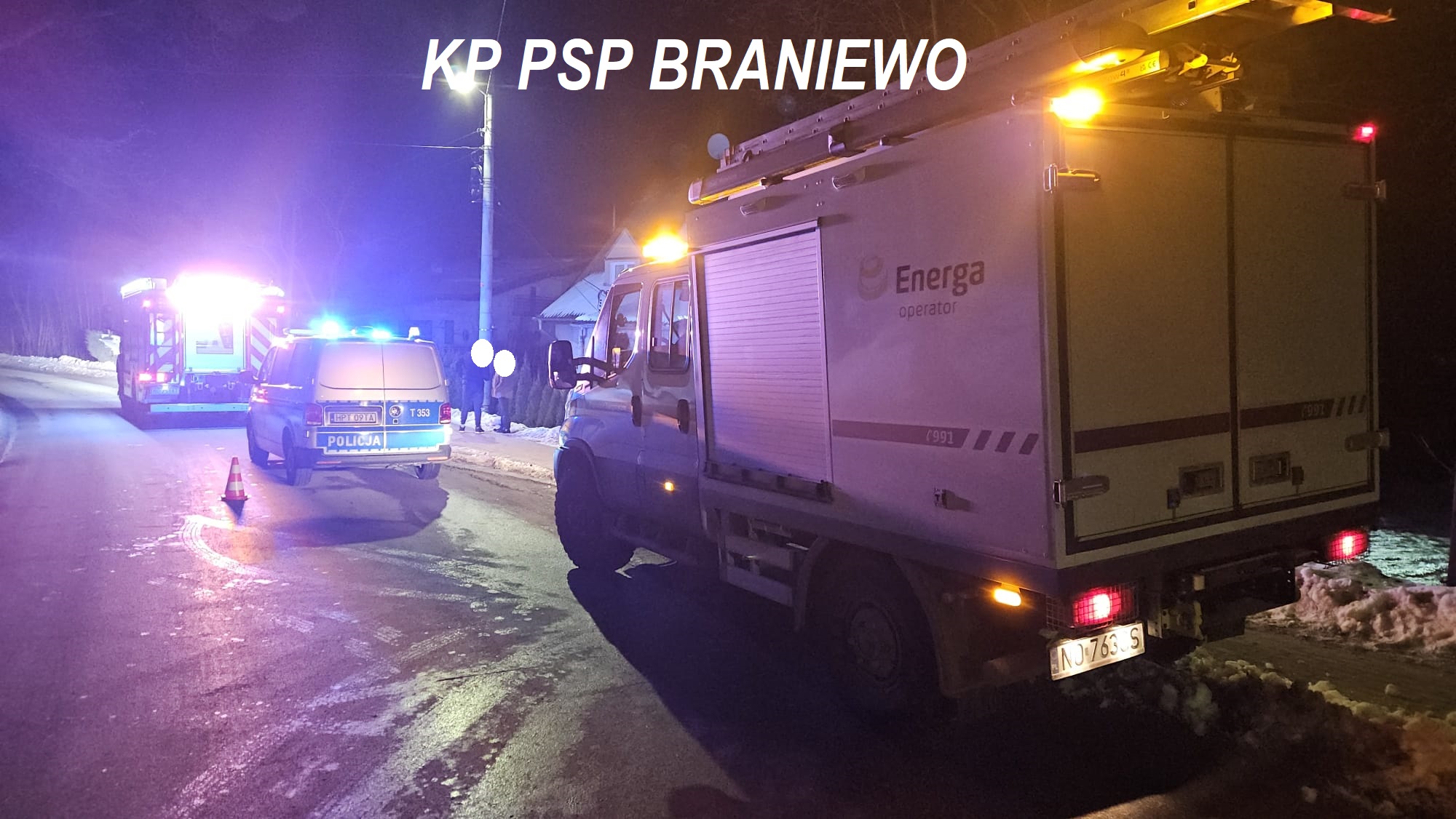 Na miejscu zdarzenia oprócz strażaków PSP i policjantów, obecni byli pracownicy pogotowia energetycznego, którzy zabezpieczyli uszkodzony słup i przewody elektryczne.