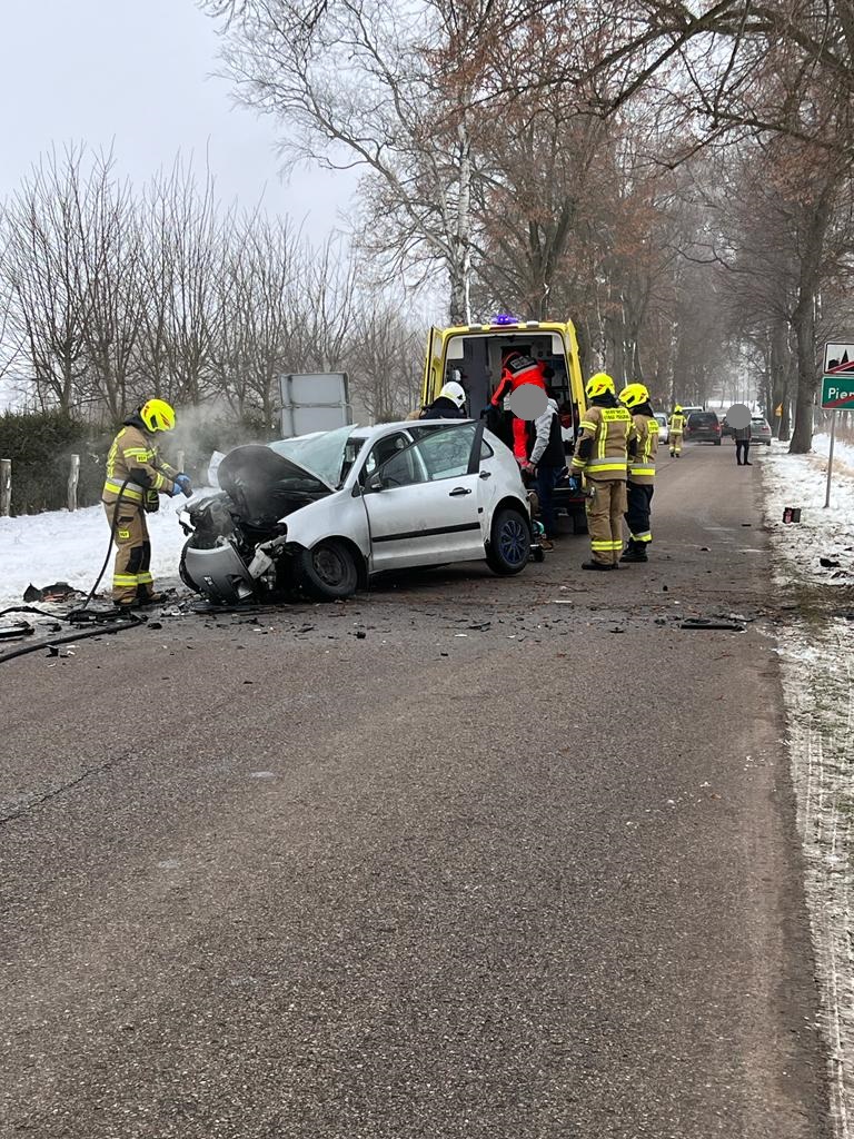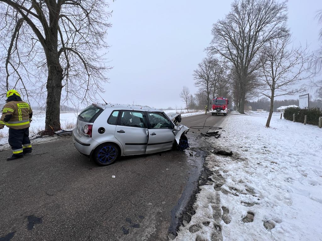 26 stycznia br. (czwartek) kilka minut po godzinie 11:00 kierujący pojazdem osobowym marki volkswagen polo uderzył czołowo w przydrożne drzewo. Do zdarzenia doszło na drodze powiatowej w Pieniężnie. Auto po uderzeniu w drzewo zatrzymało się na pasie drogi. Wewnątrz rozbitego pojazdu znajdował się ranny kierowca. Strażacy ochotnicy z jednostki OSP Pieniężno wspólnie z ratownikami medycznymi z Pieniężna ewakuowali poszkodowanego na noszach z rozbitego pojazdu. Ranny mężczyzna został przeniesiony do pojazdu ZRM z Pieniężna. Na czas prowadzenia działań ruch na drodze powiatowej został zablokowany.