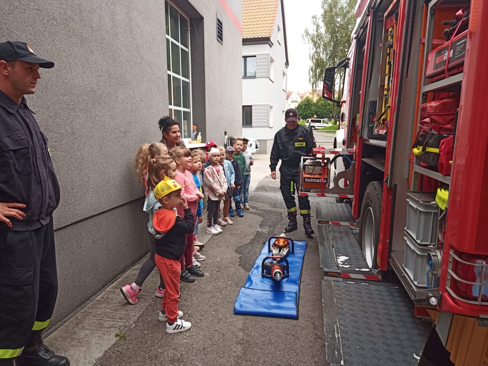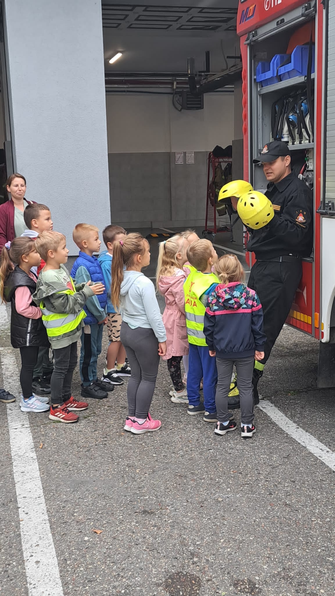 Tradycyjnie największe zainteresowanie dzieci wzbudziły wozy strażackie. Przez chwilę wszyscy uczestnicy wycieczki mogli poczuć się jak strażacy, przymierzając hełmy strażackie.