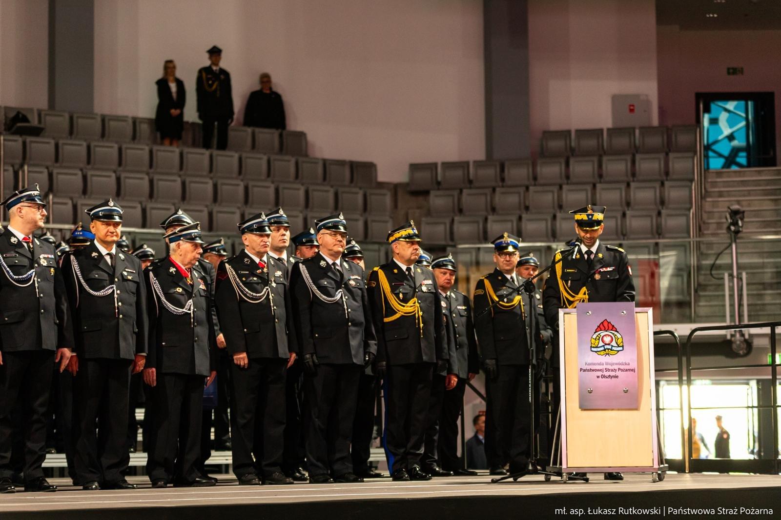 Następnie w Hali Widowiskowo-Sportowej „Urania” w Olsztynie odbył się uroczysty apel, podczas którego odbyła się ceremonia odznaczeń i wyróżnień dla strażaków Państwowej Straży Pożarnej i Ochotniczych Straży Pożarnych, pracowników cywilnych PSP i przedstawicieli instytucji współpracujących, którzy swoim zaangażowaniem zasłużyli się dla ochrony przeciwpożarowej.