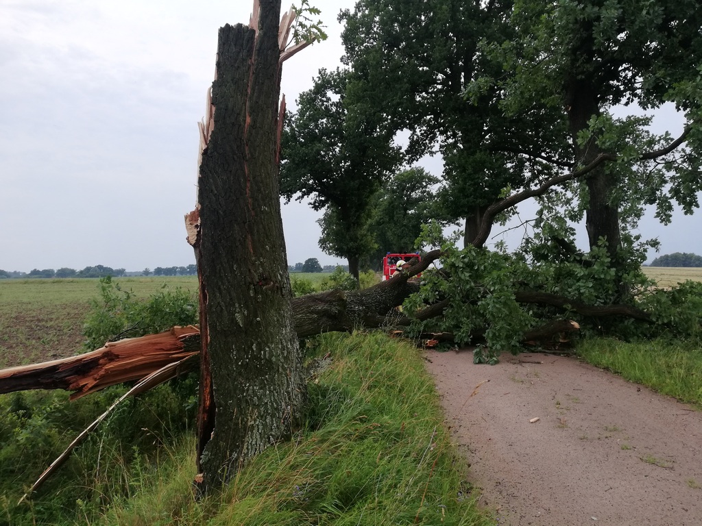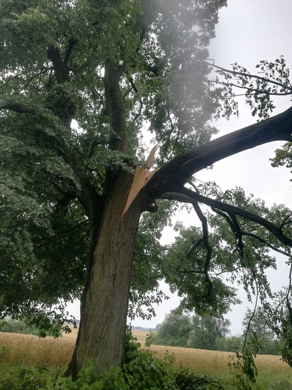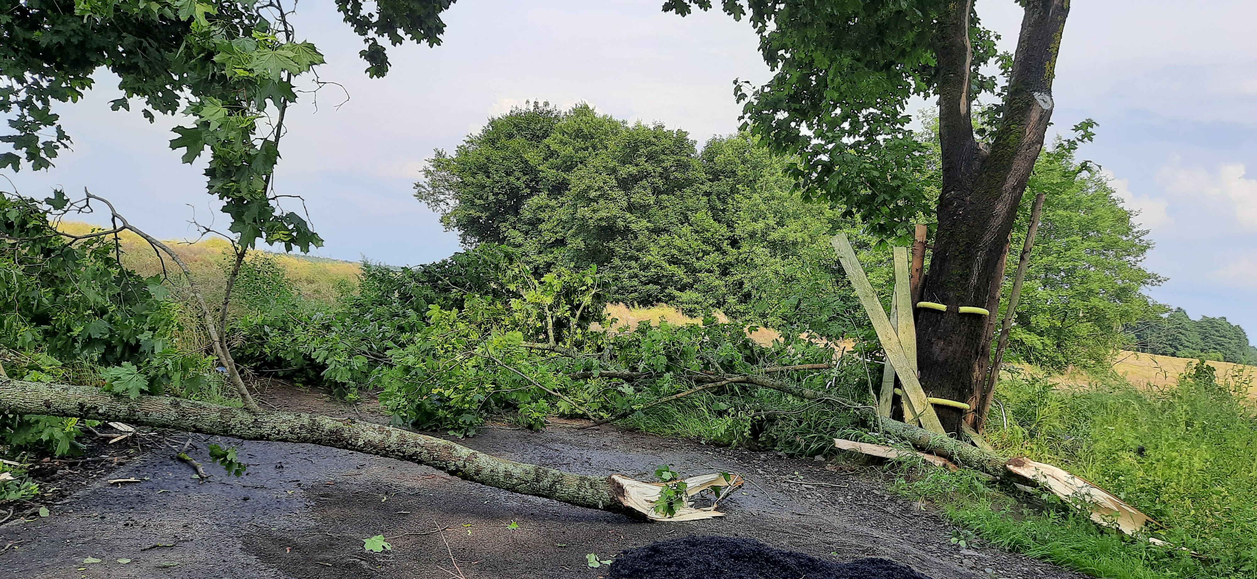 W poniedziałek (12 lipca), od godzin popołudniowych, strażacy interweniowali kilka razy podczas usuwania skutków silnego wiatru. Wiatr z łatwością łamał konary drzew, połamane drzewa utrudniały ruch na drogach.