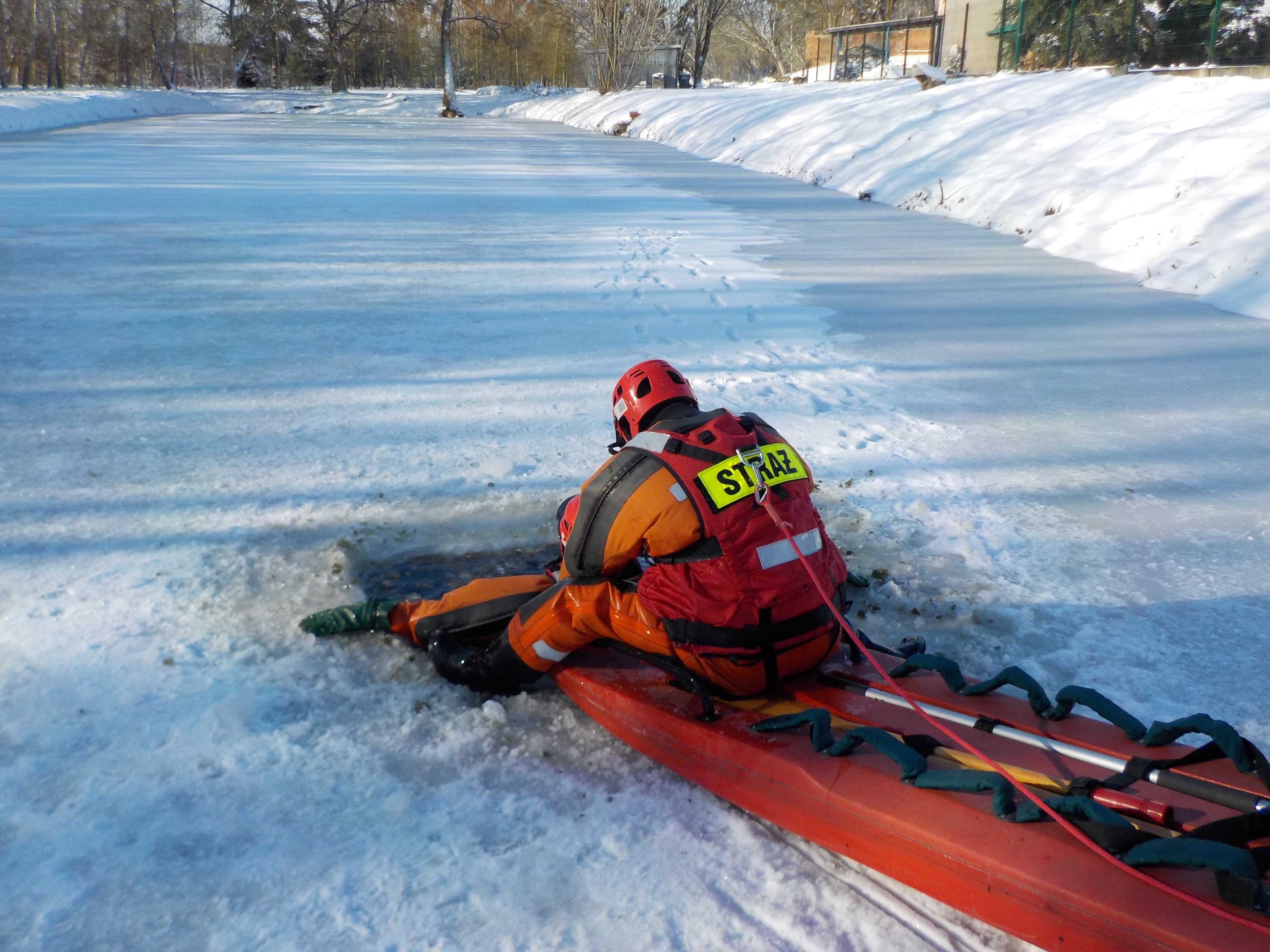 Strażacy doskonalili swoje umiejętności z zakresu działań prowadzonych na lodzie, obejmujące przede wszystkim ewakuację osoby z przerębla pod którą załamał się lód. W trakcie symulowanego załamania się lodu pod człowiekiem strażacy ćwiczyli posługiwanie się specjalistycznym sprzętem do ratownictwa lodowego, ewakuację osoby poszkodowanej oraz asekurację ratowników. W tym celu wykorzystano zarówno taki sprzęt jak: sanie lodowe, pas ratowniczy typu „węgorz” czy drabiny, ale także inne przedmioty, które każdy może wykorzystać do niezwłocznego wydobycia poszkodowanej osoby. Ratownicy z Grupy Prewencyjnej WOPR województwa kujawsko- pomorskiego wykonali pokaz ratowania poszkodowanego przez specjalnie wyszkolonego psa ratowniczego, który dostarczył linę osobie uwięzionej w przeręblu.