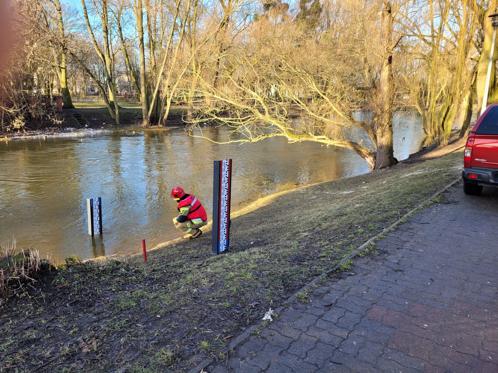 W związku z niebezpieczeństwem wystąpienia nasilenia roztopów zgromadzonej masy śnieżnej – a w konsekwencji możliwością wystąpienia lokalnych podtopień - 27 lutego 2021r. brodniccy strażacy przeprowadzili monitoring stanu poziomu wody w rzece Drwęca oraz kontrolę grobli wzdłuż rzeki na terenie miasta Brodnica. Aktualnie stan poziomu wody w rzece Drwęca wynosi 155 cm przy stanie ostrzegawczym wynoszącym 230cm i alarmowym 260cm.