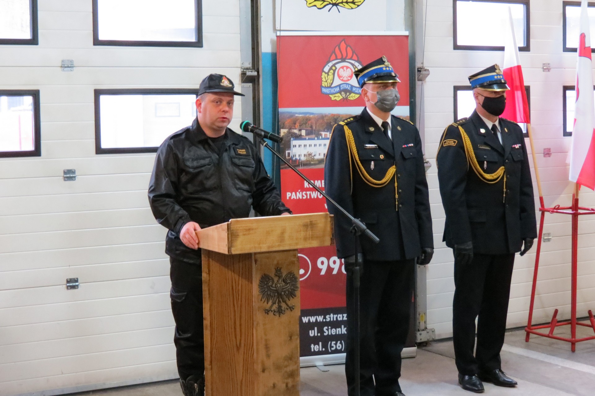 2 grudnia 2021 r. w siedzibie Komedy Powiatowej Państwowej Straży Pożarnej w Brodnicy odbyła się uroczystość przekazania w użytkowanie nowego samochodu pożarniczego typu ciężkiego do działań gaśniczych SCANIA GCBA 5/32.