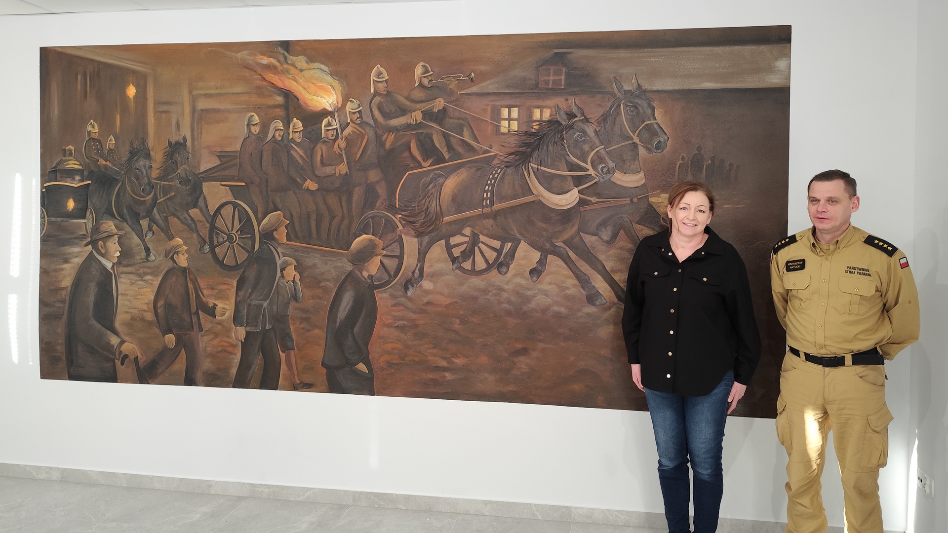 Wyzwanie przed jakim stanęła pani Maria nie było łatwe, ale dzięki wyjątkowym umiejętnościom i ogromowi włożonej pracy, wykonanej w ekspresowym czasie nasz obraz prezentuje się cudownie, zdobiąc salę szkoleniową JRG i pokazując kawałek historii pożarnictwa.