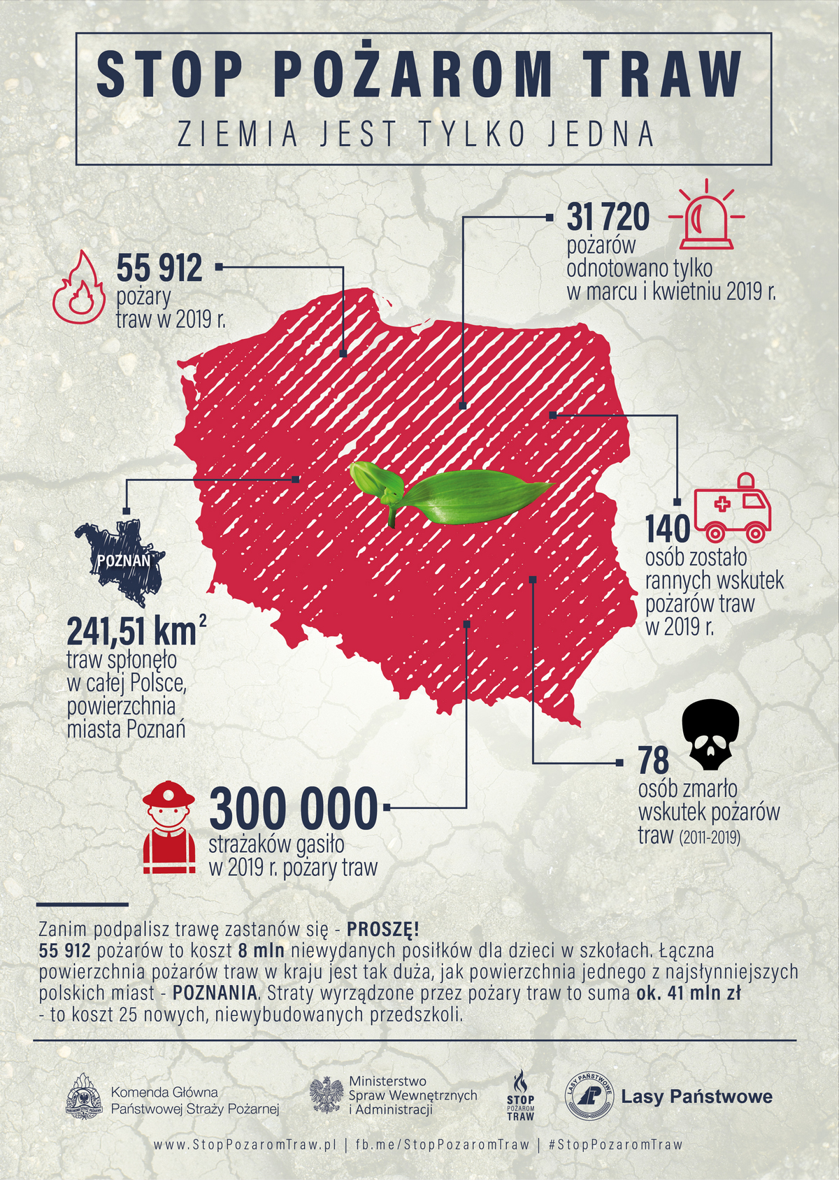 Już od wielu lat przełom zimy, wiosny oraz przedwiośnie to okresy, w których wyraźnie wzrasta liczba pożarów łąk i nieużytków. Wiele osób wypala trawy i nieużytki rolne, tłumacząc swoje postępowanie chęcią użyźniania gleby. Od pokoleń wśród wielu ludzi panuje bowiem przekonanie, że spalenie trawy spowoduje szybszy i bujniejszy jej odrost, a tym samym przyniesie korzyści ekonomiczne. Jest to jednak całkowicie błędne myślenie. Rzeczywistość wskazuje, że wypalanie traw prowadzi do nieodwracalnych, niekorzystnych zmian w środowisku naturalnym – ziemia wyjaławia się, zahamowany zostaje bardzo pożyteczny, naturalny rozkład resztek roślinnych oraz asymilacja azotu z powietrza. Do atmosfery przedostaje się szereg związków chemicznych będących truciznami zarówno dla ludzi jak i zwierząt. Wypalanie traw jest również przyczyną wielu pożarów, które niejednokrotnie prowadzą niestety także do wypadków śmiertelnych. Rocznie w tego rodzaju zdarzeniach śmierć ponosi kilkanaście osób.