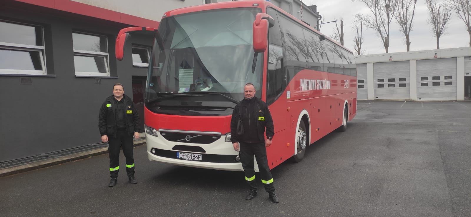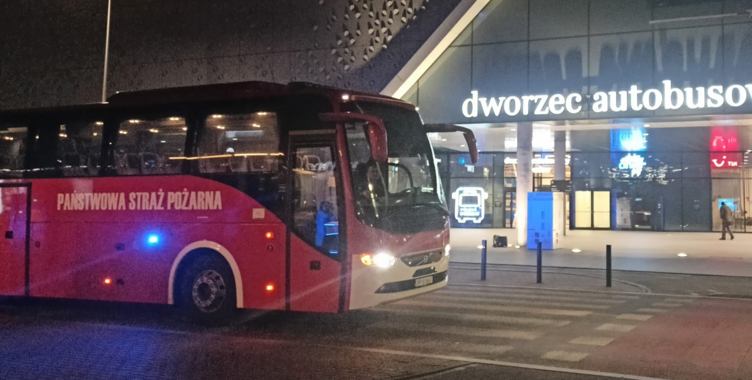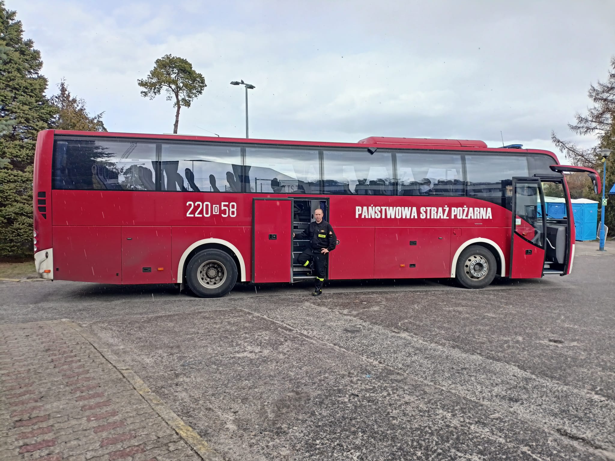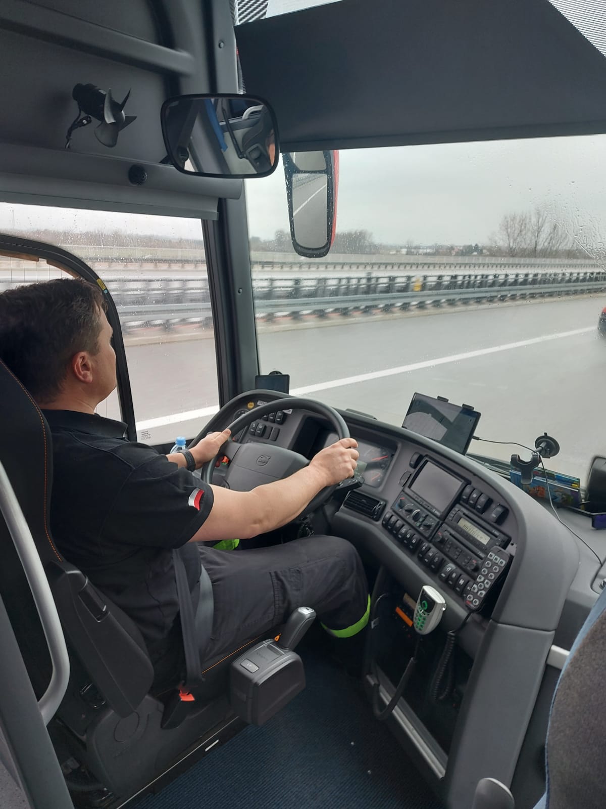 Transporty uchodźców z Ukrainy odbywają się autobusem będącym na wyposażeniu Komendy Wojewódzkiej PSP w Opolu.