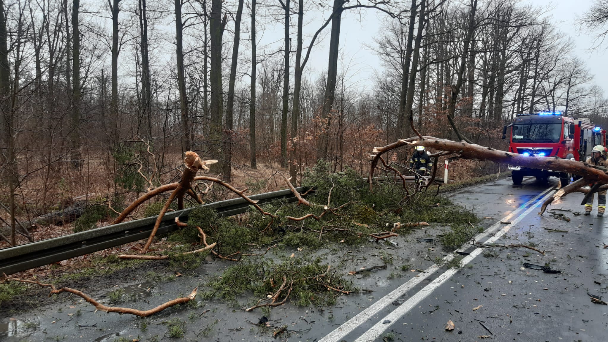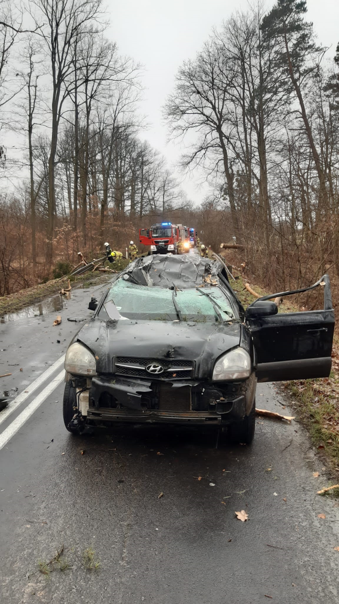 W dniu 17 stycznia o godzinie 12:50 do Stanowiska Kierowania Komendanta Powiatowego Państwowej Straży Pożarnej w Brzegu wpłynęło zgłoszenie o drzewie, które spadło na dach przejeżdżającego samochodu osobowego. Do zdarzenia doszło na drodze wojewódzkiej nr. 457 w pobliżu miejscowości Kościerzyce.
