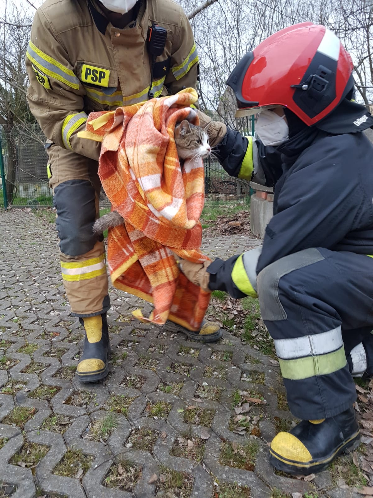 - wejściu ratownika, który owinął rannego kota kocem oraz wydostał ze studzienki,