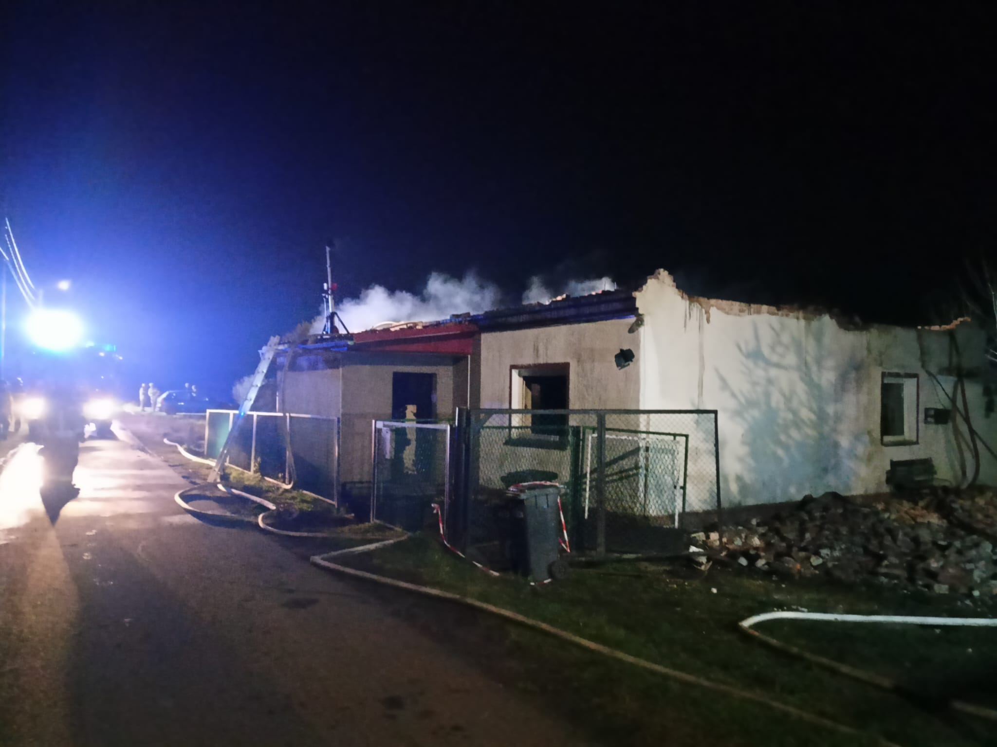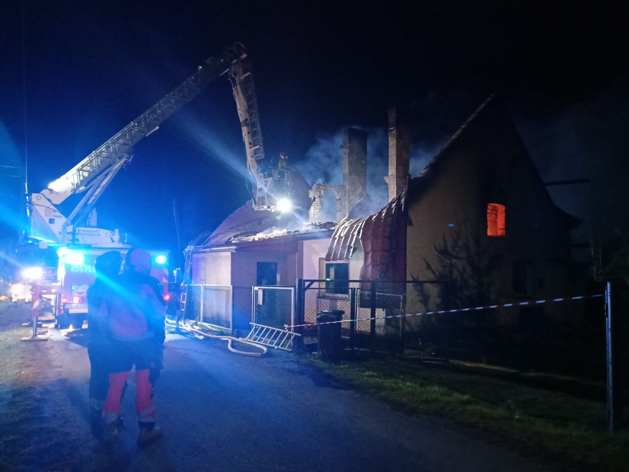 Po przybyciu na miejsce zdarzenia w wyniku przeprowadzonego rozpoznania wstępnego stwierdzono, że budynek jednorodzinny jest całkowicie objęty pożarem, poszycie dachu zawaliło się na pierwszą kondygnację. Brak informacji o osobach poszkodowanych.
