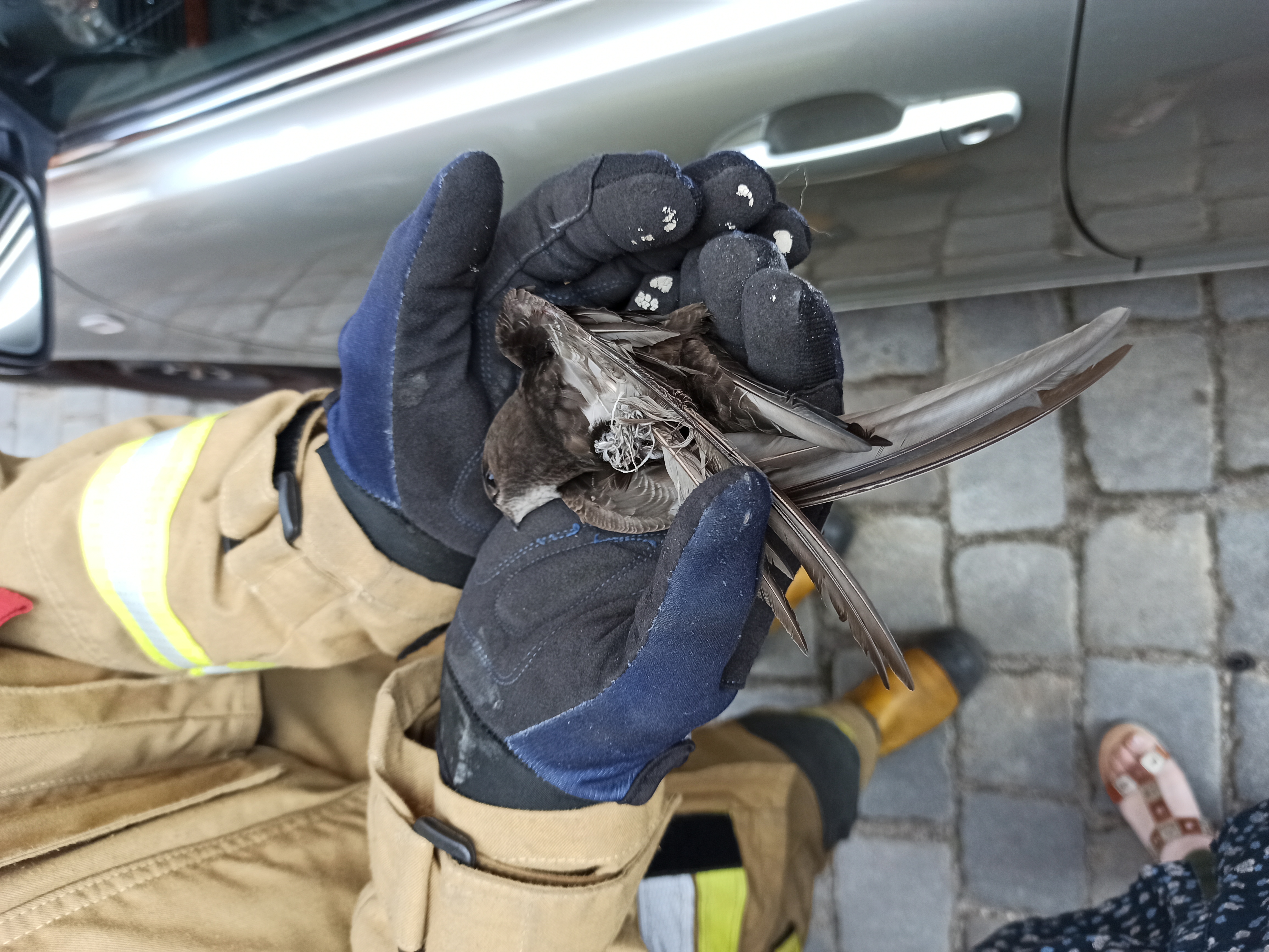 Po przybyciu na miejsce zdarzenia w wyniku przeprowadzonego rozpoznania wstępnego stwierdzono, że na zewnętrznej ścianie budynku wielorodzinnego na wysokości ok. 10 m znajduje się uwięziony ptak (jerzyk).