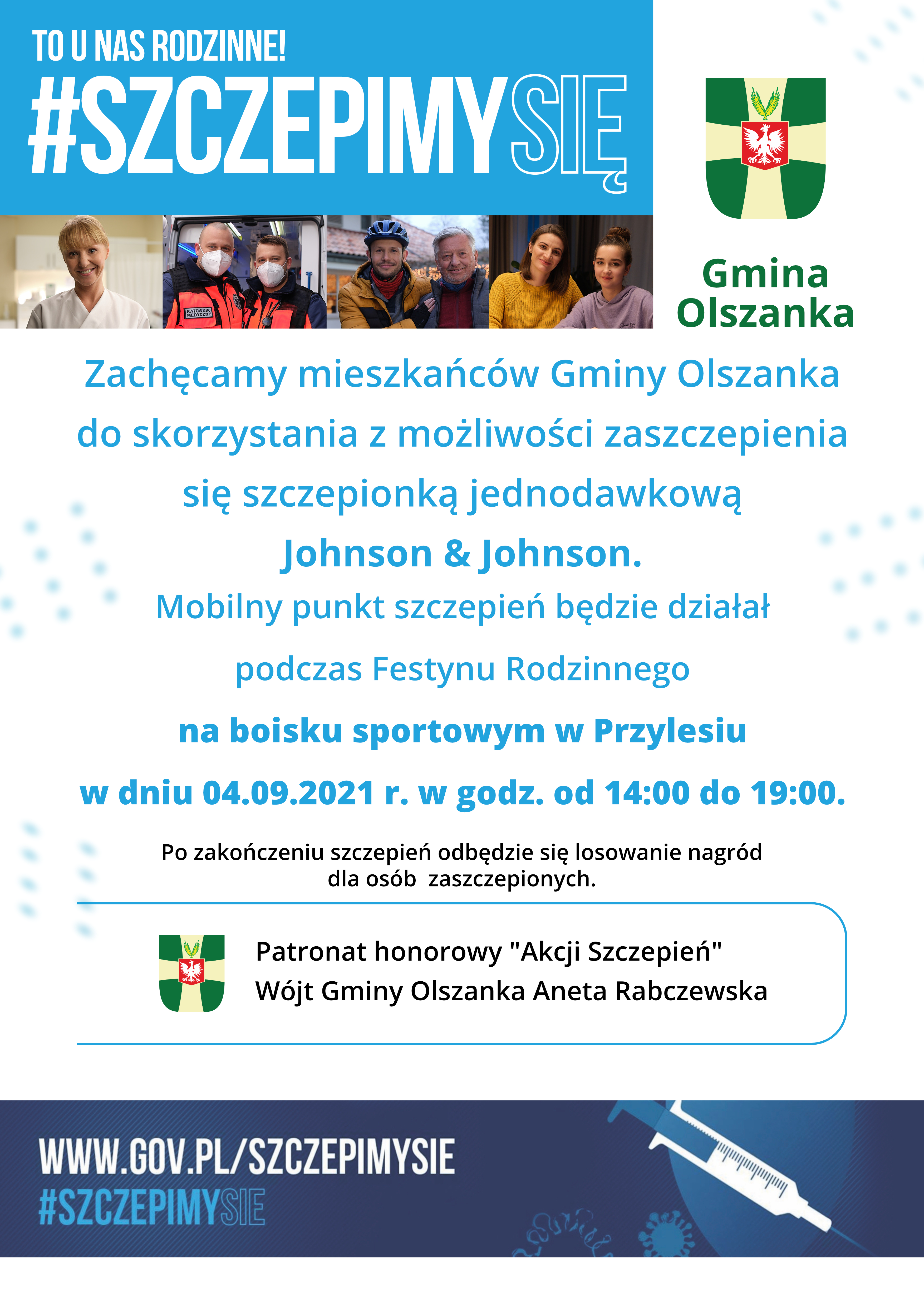 Zachęcamy mieszkańców Gminy Olszanka do skorzystania z możliwości zaszczepienia się szczepionką jednodawkową Johnson & Johnson. Mobilny punkt szczepień będzie działał podczas Festynu Rodzinnego na boisku sportowym w Przylesiu w dniu 04.09.2021 r. w godz. od 14:00 do 19:00.
