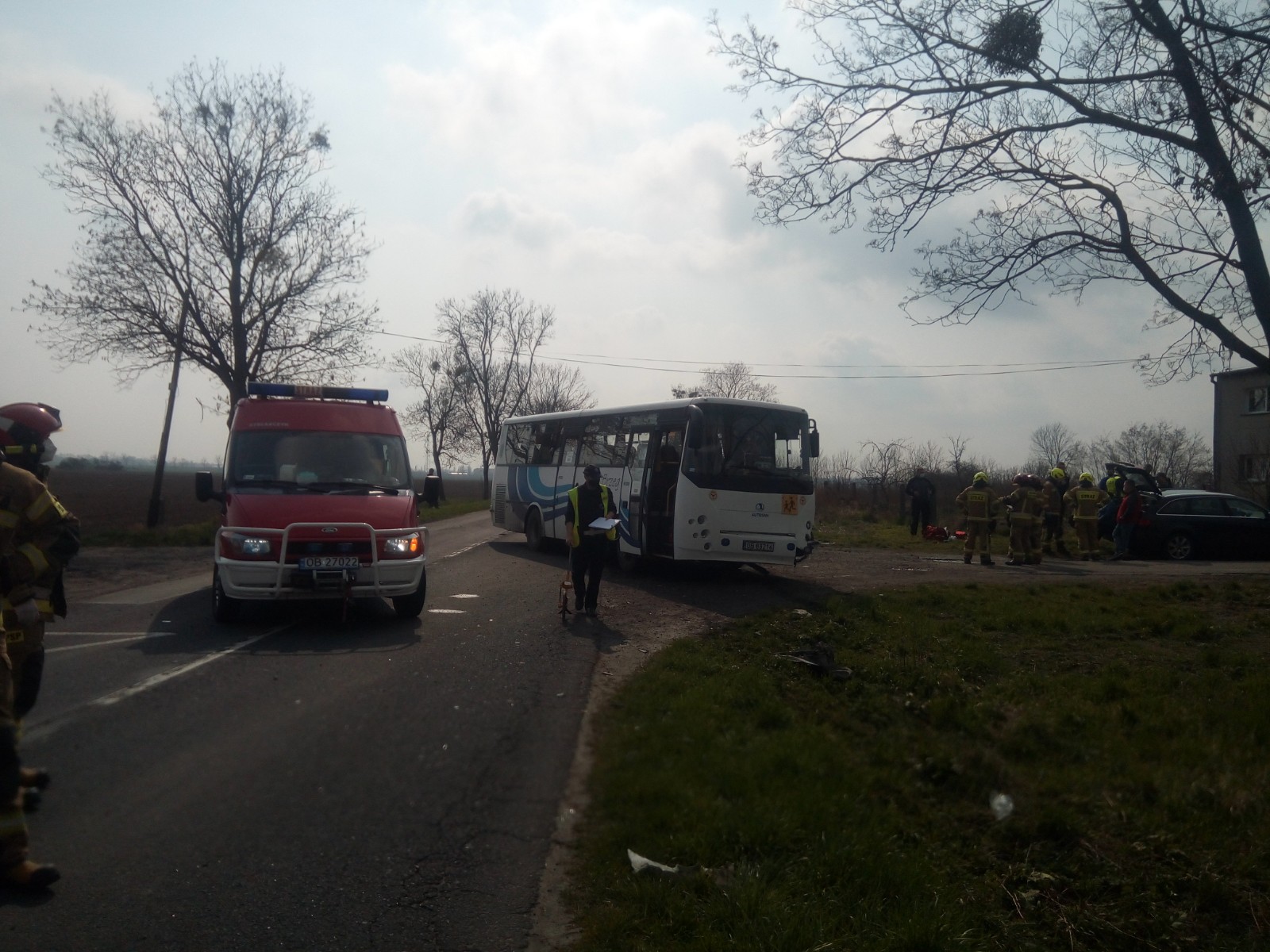 Po przybyciu na miejsce zdarzenia w wyniku przeprowadzonego rozpoznania wstępnego stwierdzono, że samochód osobowy Audi zderzył się z autobusem Autosan Tramp. W zdarzeniu brało udział 7 osób - kierowca Audi, kierowca autobusu wraz z 5 pasażerami (4 dzieci oraz opiekunka), wszyscy opuścili pojazdy o własnych siłach przed przybyciem na miejsce zastępów straży pożarnej.