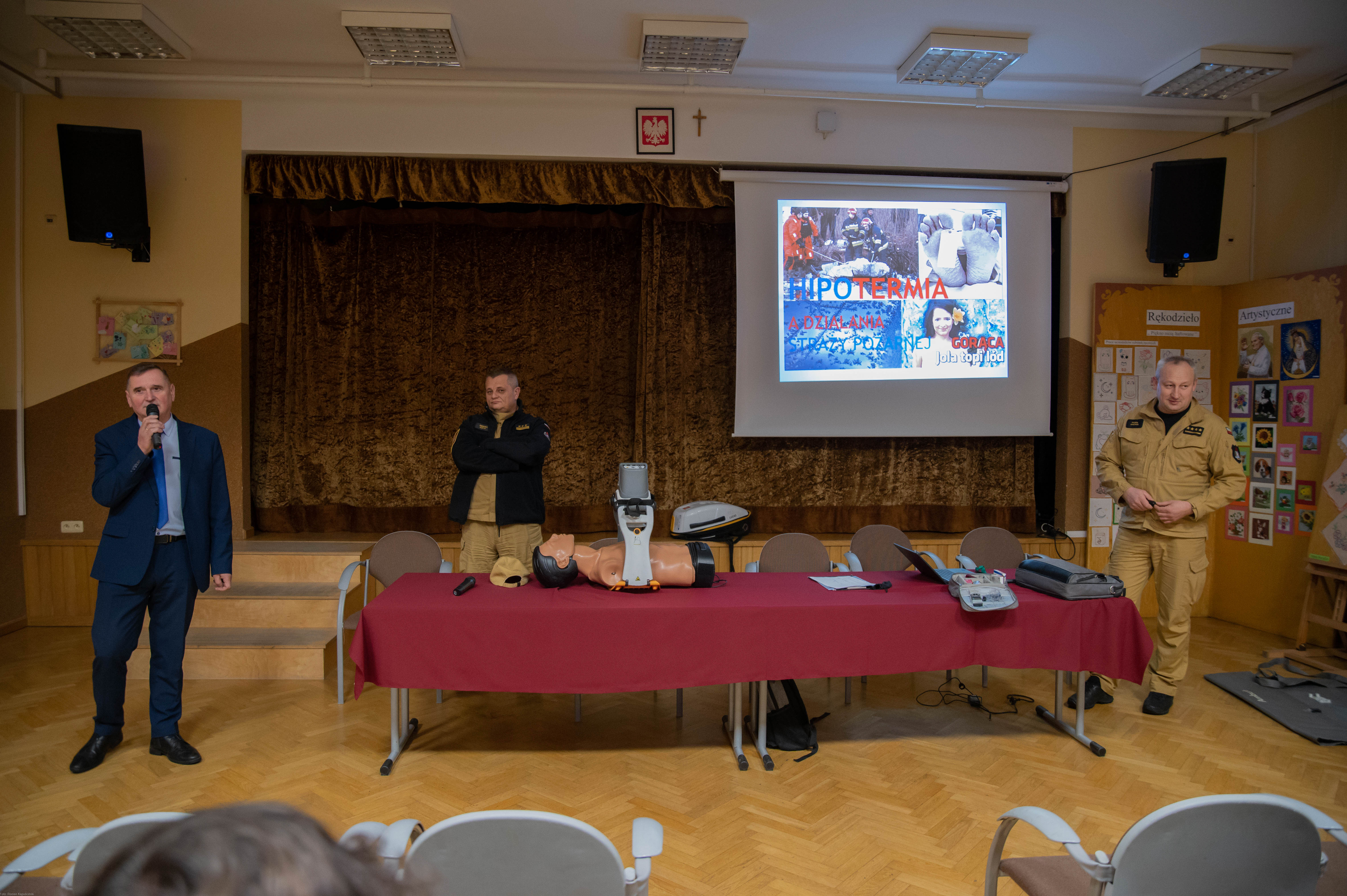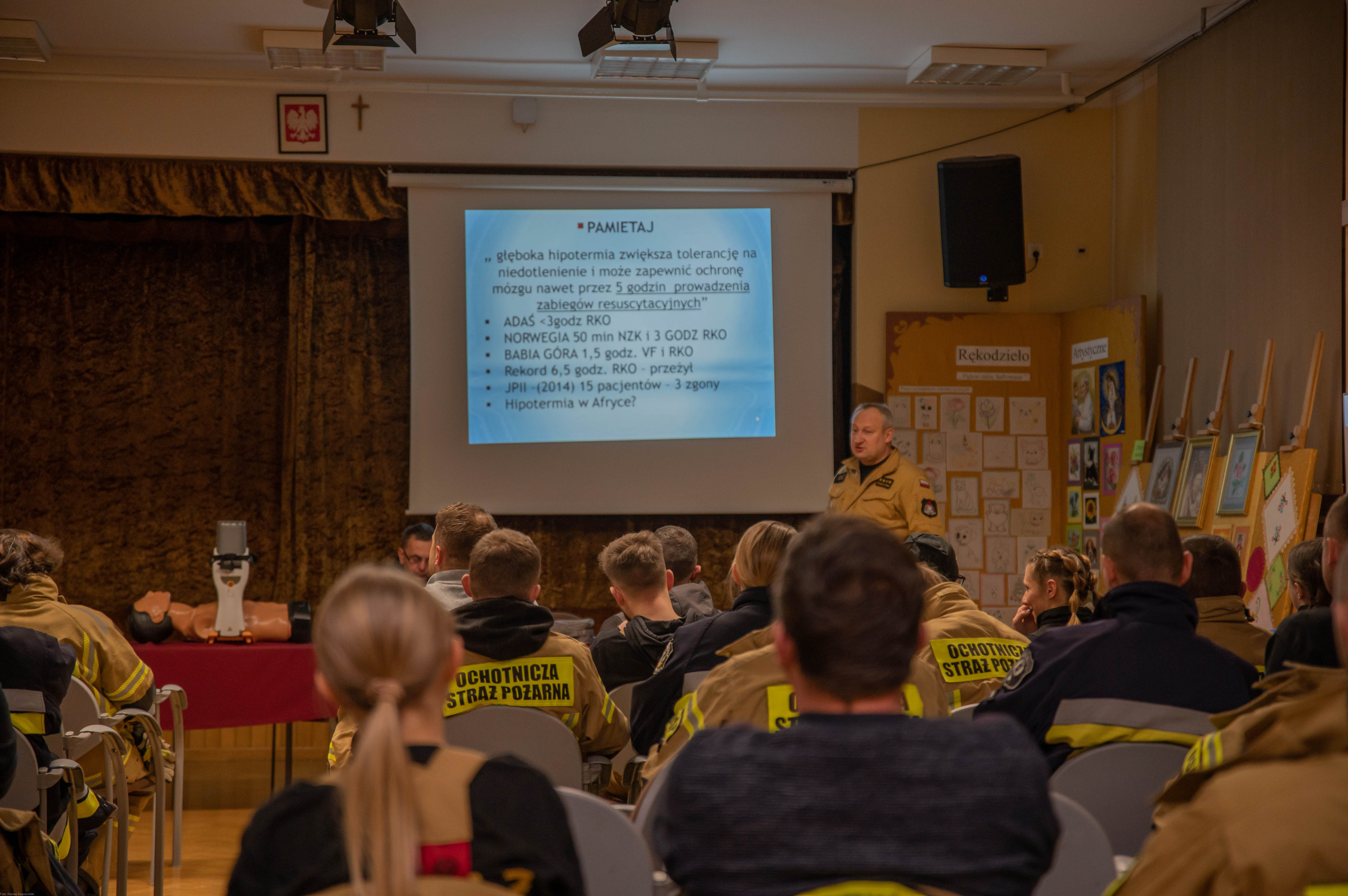 Szkolnie rozpoczęło się wykładem na temat hipotermii i postepowania z poszkodowanym wg. zasad Kwalifikowanej Pierwszej Pomocy. Kolejnym etapem były zajęcia praktyczne które polegały na odnalezieniu poszkodowanego w terenie trudno dostępnym, który doznał urazu nogi i wezwał pomoc. Po odnalezieniu należało go ewakuować do miejsca gdzie stacjonawał Zespół Ratownictwa Medycznego.