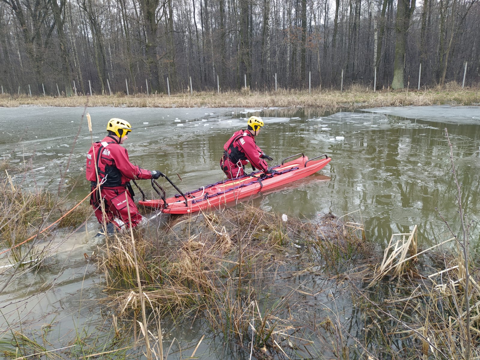 Strażacy przećwiczyli techniki ratowania osób tonących w wyniku załamania się tafli lodu na zbiorniku wodnym, zasady bezpieczeństwa pracy na zamarzniętych akwenach, ewakuację osób tonących z zastosowaniem sprzętu ratowniczego i technik ratowniczych.