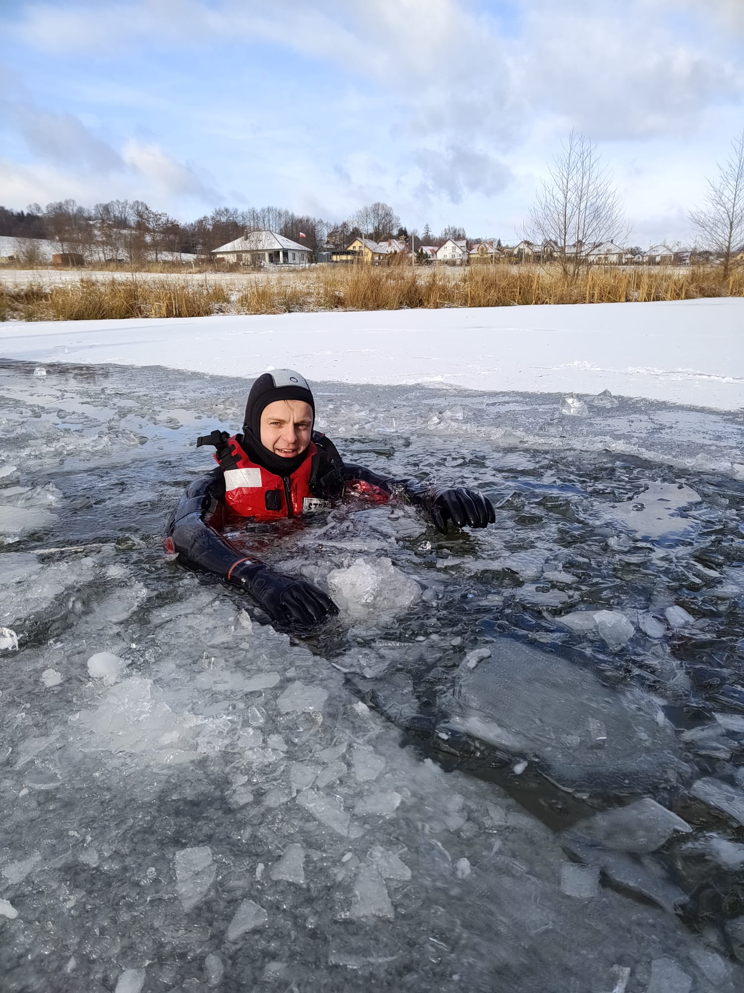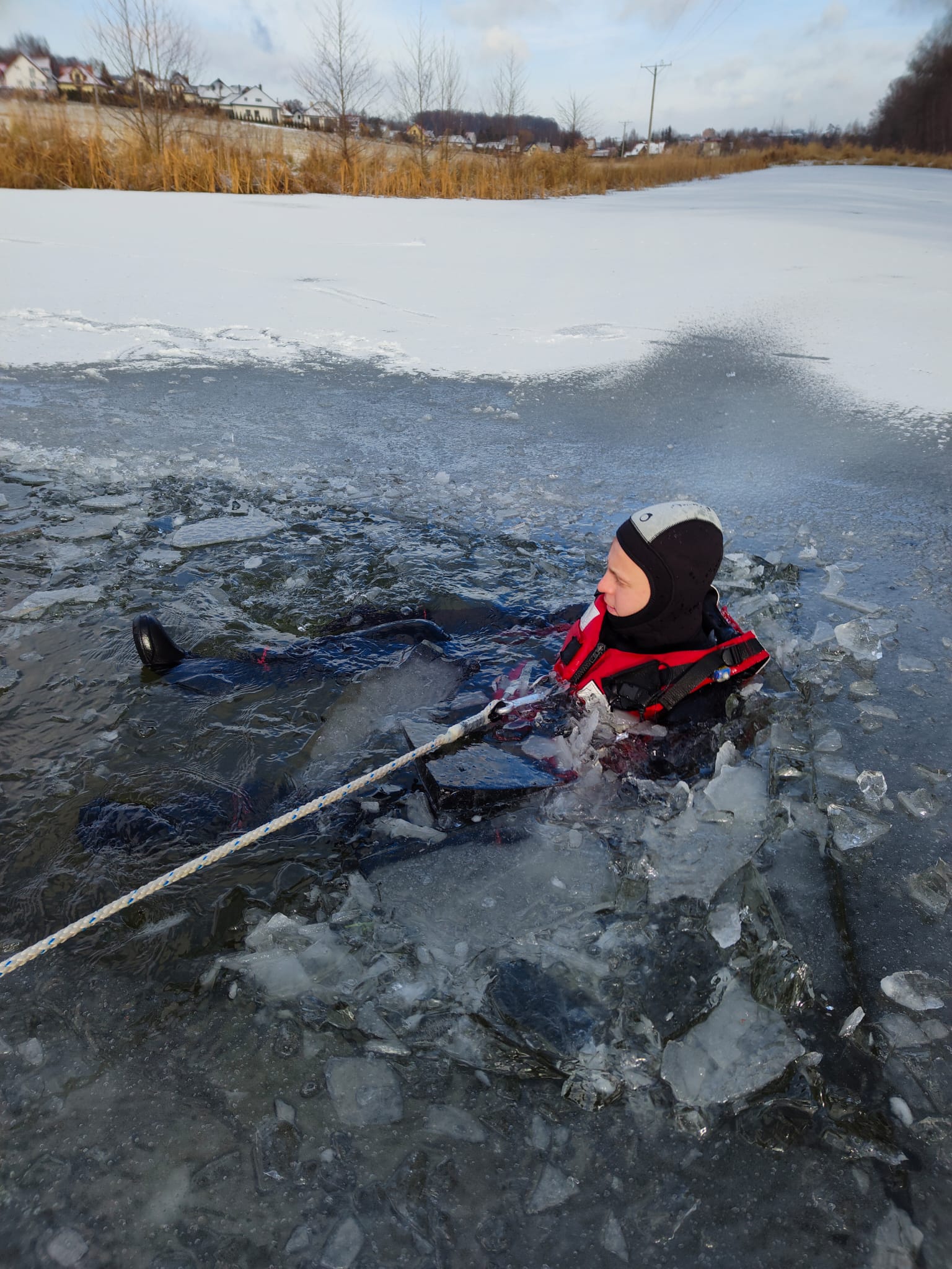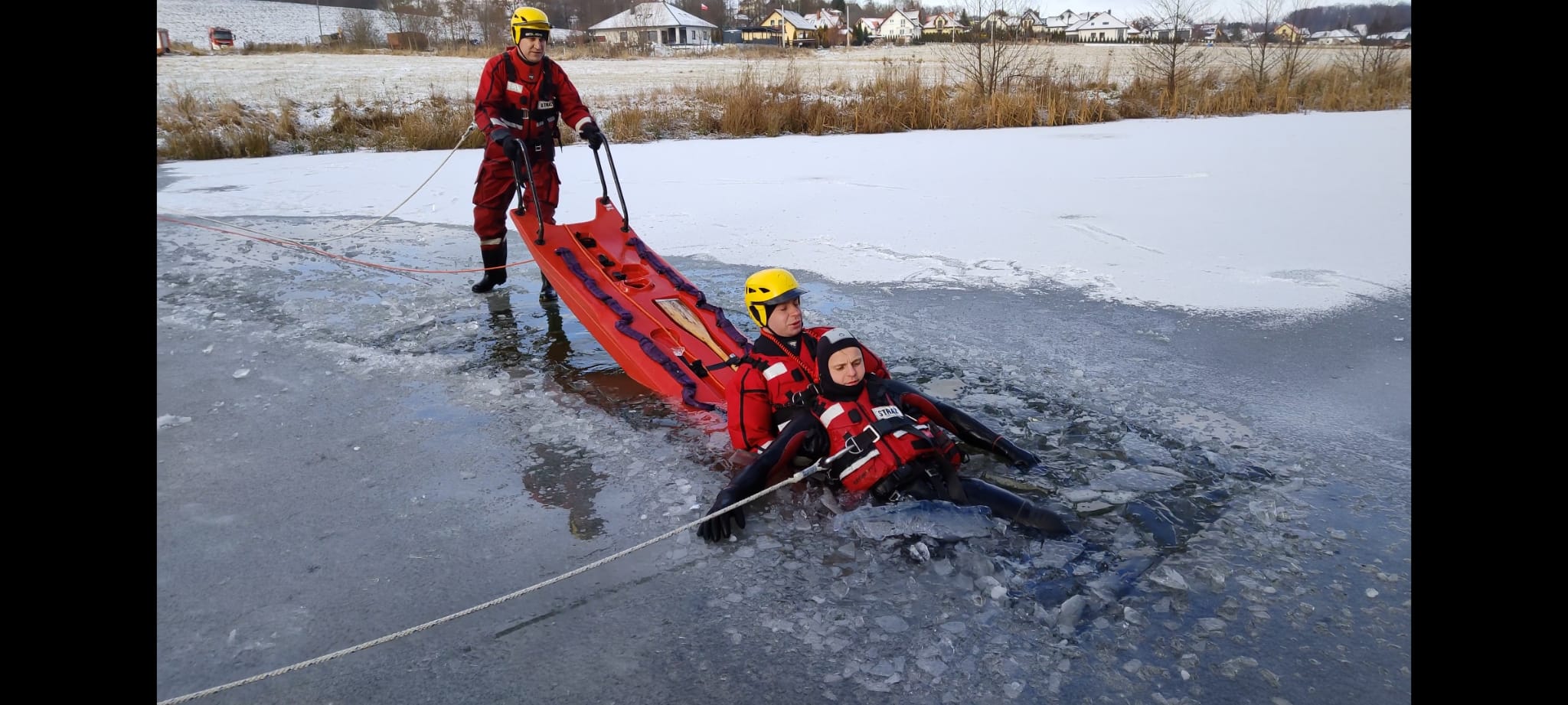 Strażacy ćwiczyli techniki ratowania osób tonących w wyniku załamania się tafli lodu na zbiorniku wodnym, zasady bezpieczeństwa pracy na zamarzniętych akwenach, ewakuację osób tonących z zastosowaniem sprzętu ratowniczego i technik ratowniczych.