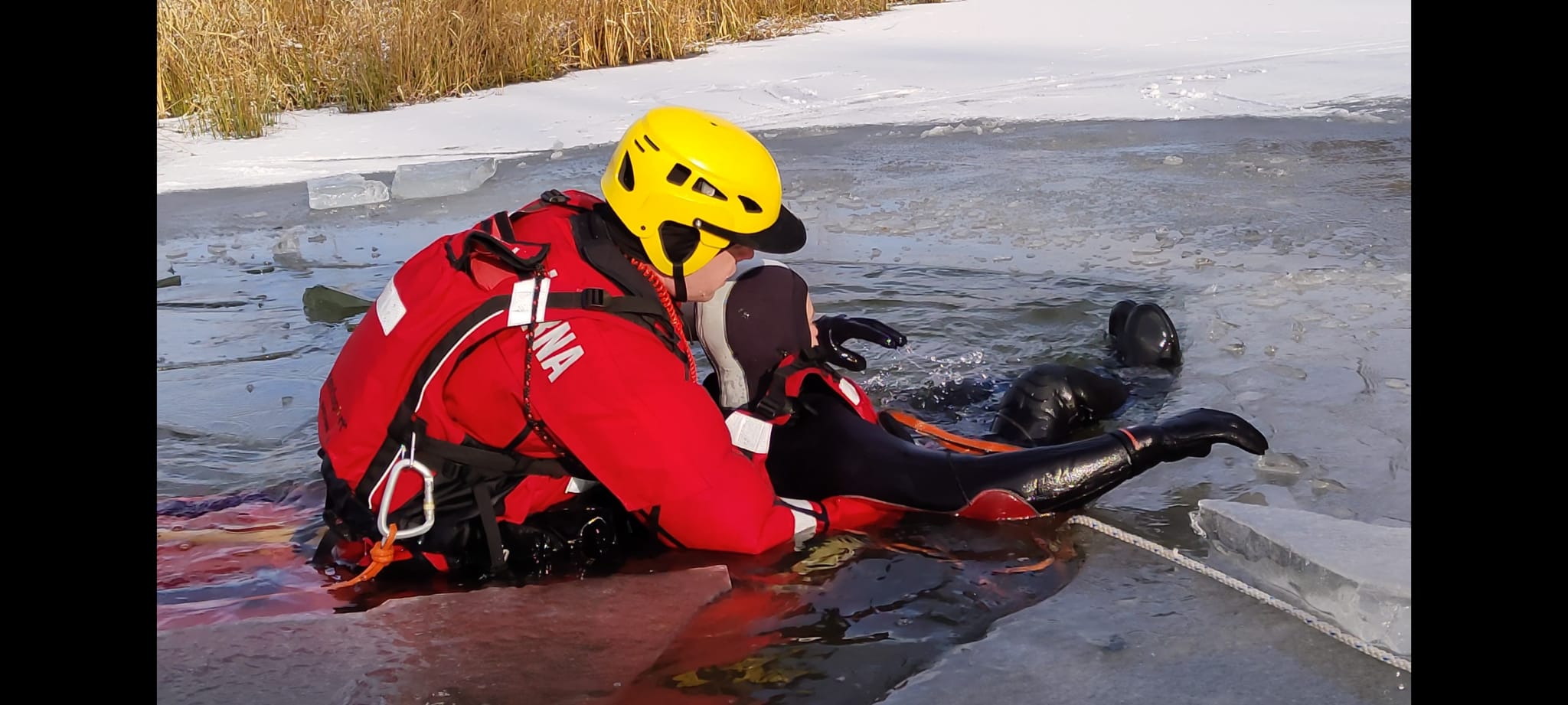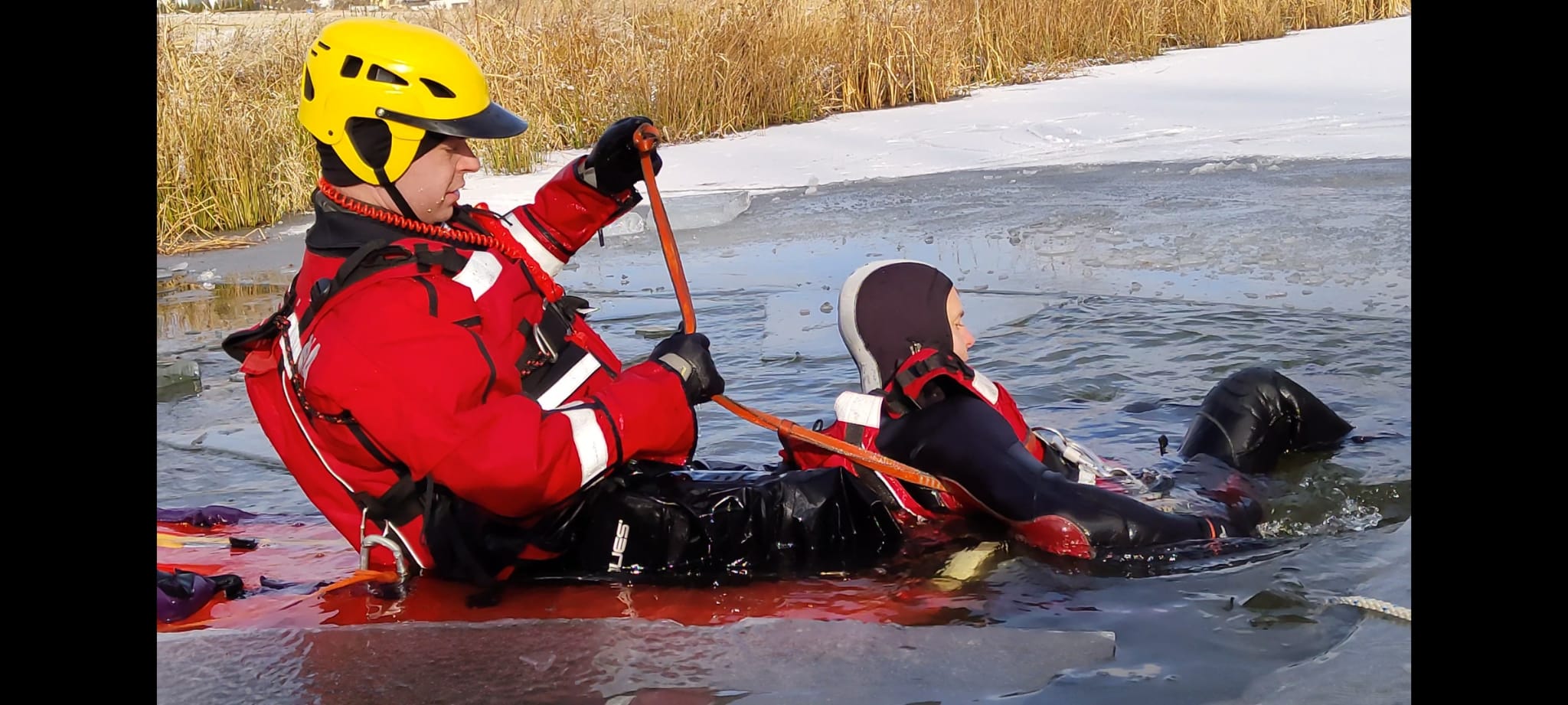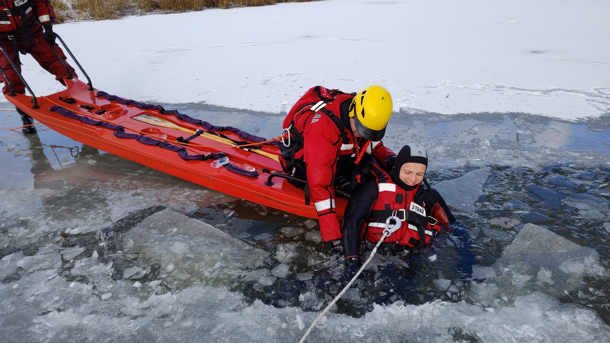 Strażacy ćwiczyli techniki ratowania osób tonących w wyniku załamania się tafli lodu na zbiorniku wodnym, zasady bezpieczeństwa pracy na zamarzniętych akwenach, ewakuację osób tonących z zastosowaniem sprzętu ratowniczego i technik ratowniczych.