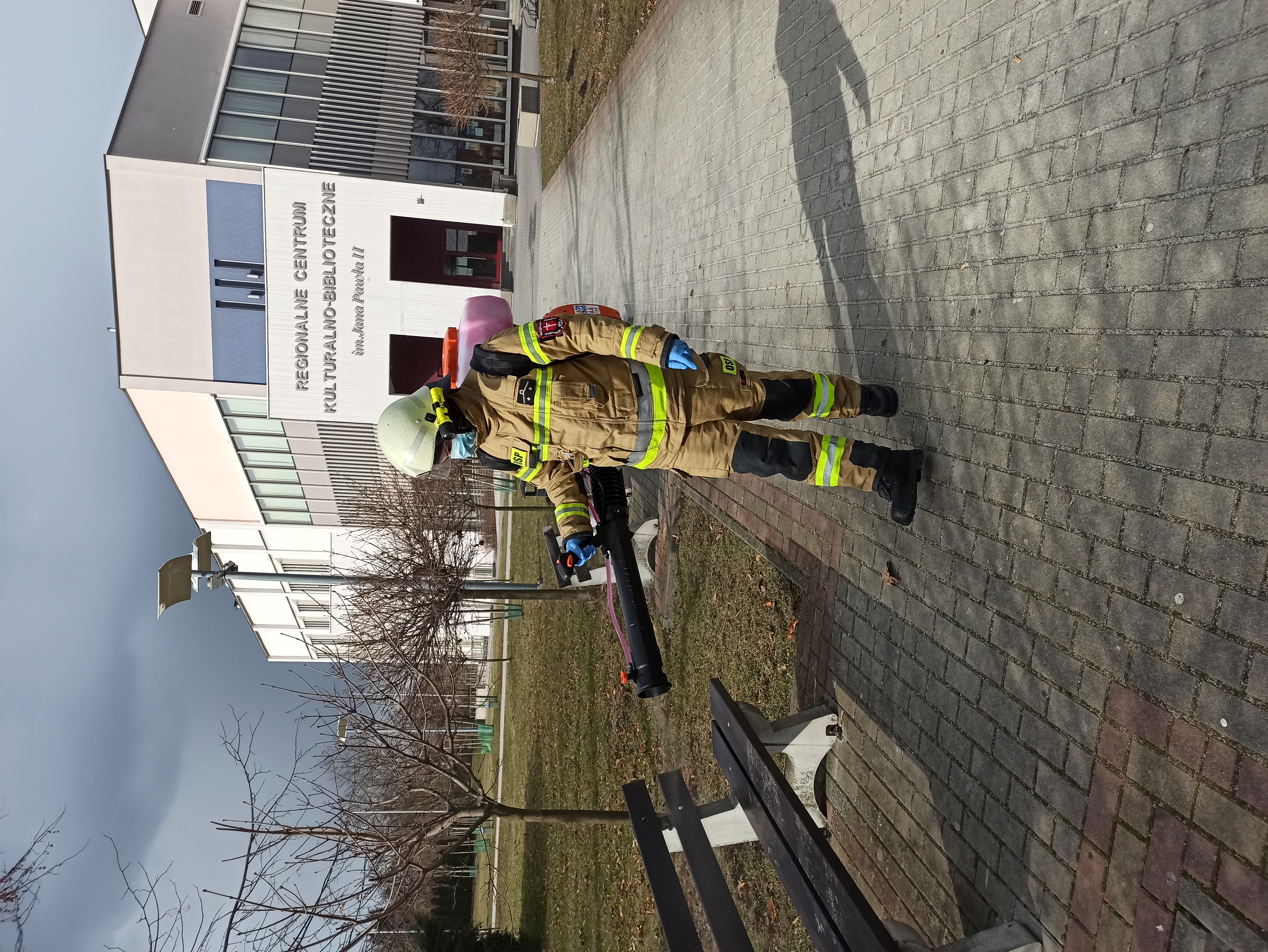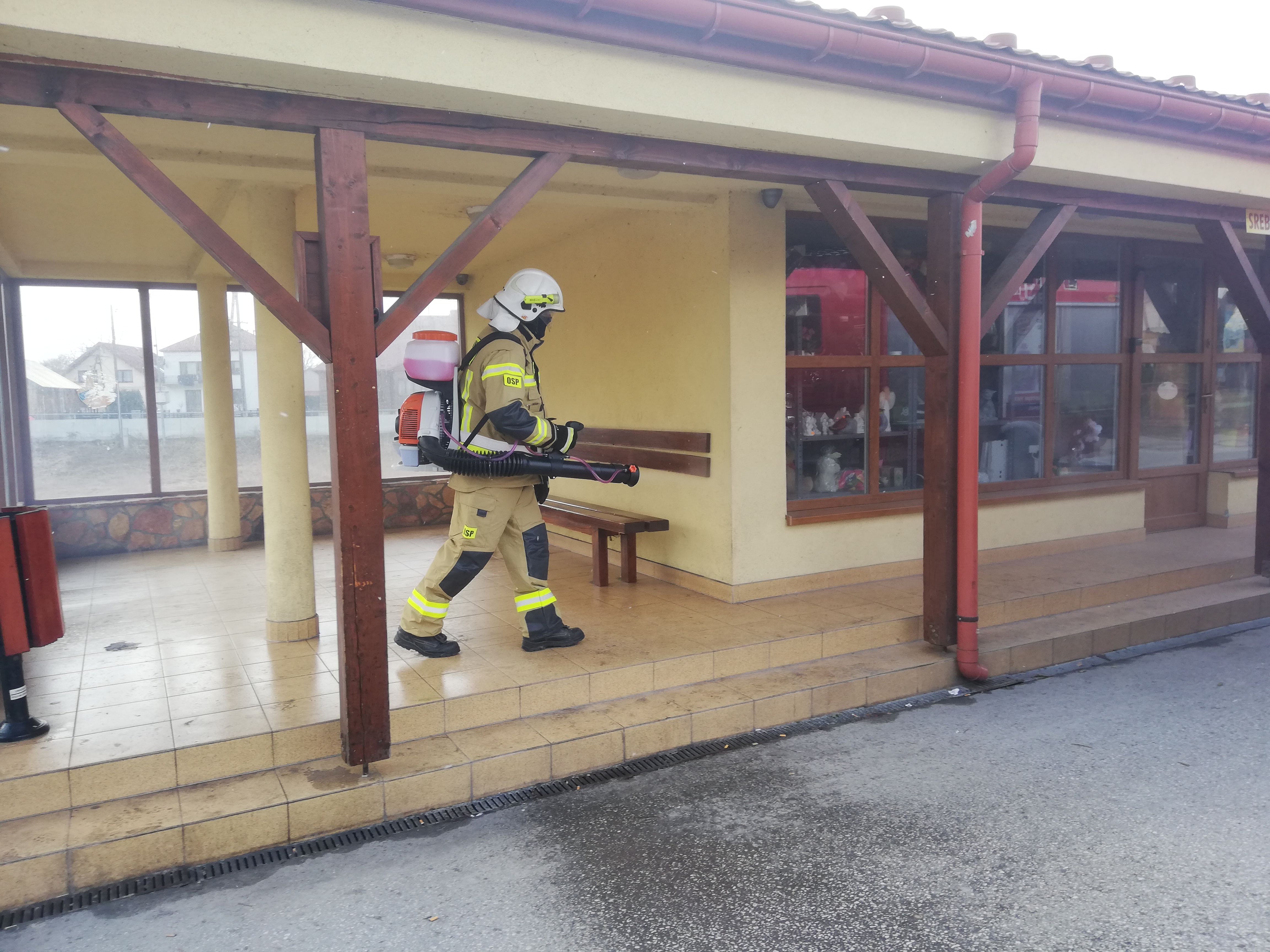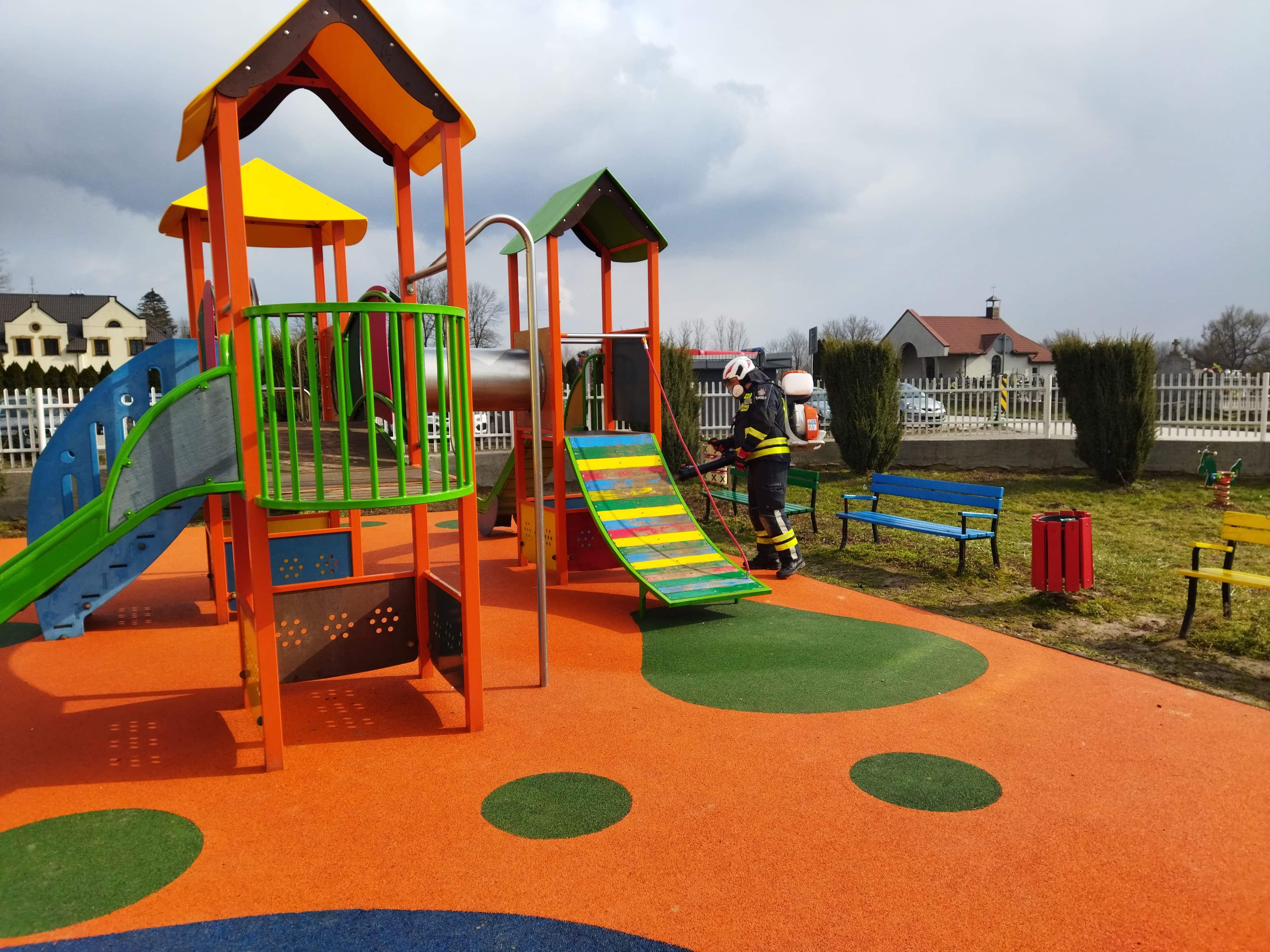 Druhowie ochotniczych straży pożarnych realizując działania pomocowe związane z zapobieganiem, przeciwdziałaniem i zwalczaniem skutków rozprzestrzeniania się koronawirusa SARS-CoV-2, w ramach współpracy jednostek ochrony przeciwpożarowej z samorządami lokalnymi, w miniony weekend dokonywali dezynfekcji miejsc przestrzeni publicznej m.in. przystanki, place zabaw, siłownie plenerowe oraz wejścia do budynków użyteczności publicznej.