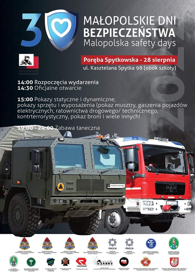Zapraszamy do udziału w III Małopolskich Dniach Bezpieczeństwa które odbędą się 28 sierpnia 2022 r. w Porębie Spytkowskiej przy ul. Kasztelana Spytka.