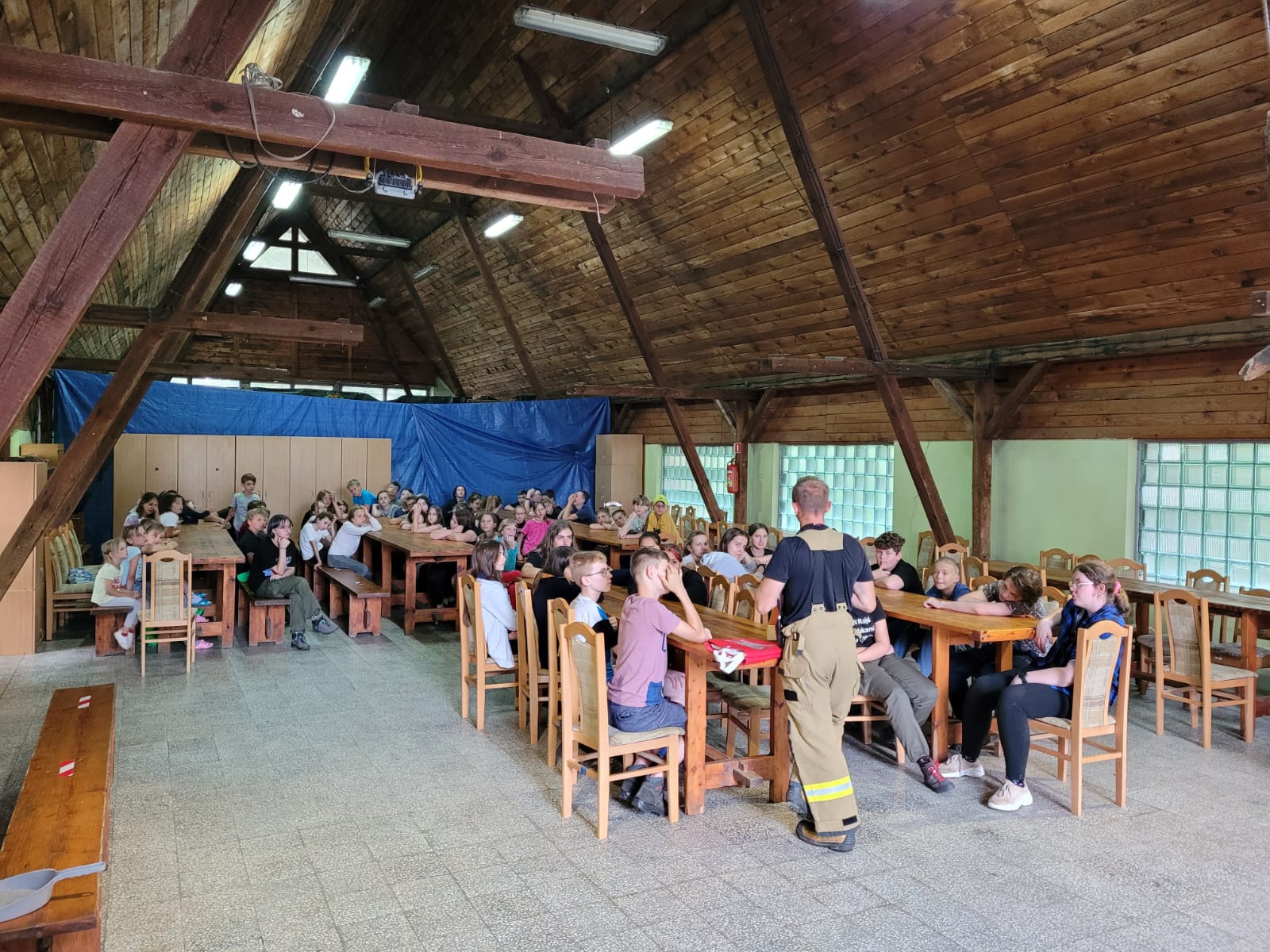 W czasie spotkania omówiono zasady bezpiecznego wypoczynku, przypomniano o sposobach alarmowania i korzystania z numerów alarmowych, używania podręcznego sprzętu gaśniczego, omówiono zasady zachowania się podczas powstania pożaru oraz warunki bezpiecznej ewakuacji na terenie obozu oraz postępowania w sytuacji wystąpienia zagrożeń.