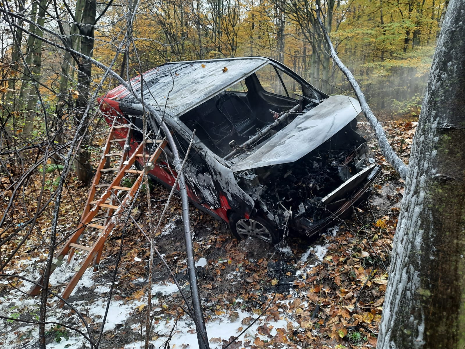 W dniu 02.11.2020 r. na drodze powiatowej w miejscowości Łysa Góra doszło do pożaru samochodu osobowego. Pojazd uległ całkowitemu spaleniu, kierujący opuścił go o własnych siłach. Działania straży polegały na ugaszeniu płonącego pojazdu przy pomocy dwóch prądów piany oraz stabilizacji przed osunięciem się ze skarpy . Po ugaszeniu pożaru samochód sprawdzono przy pomocy kamery termowizyjnej celem wykluczenia innych zarzewi ognia.