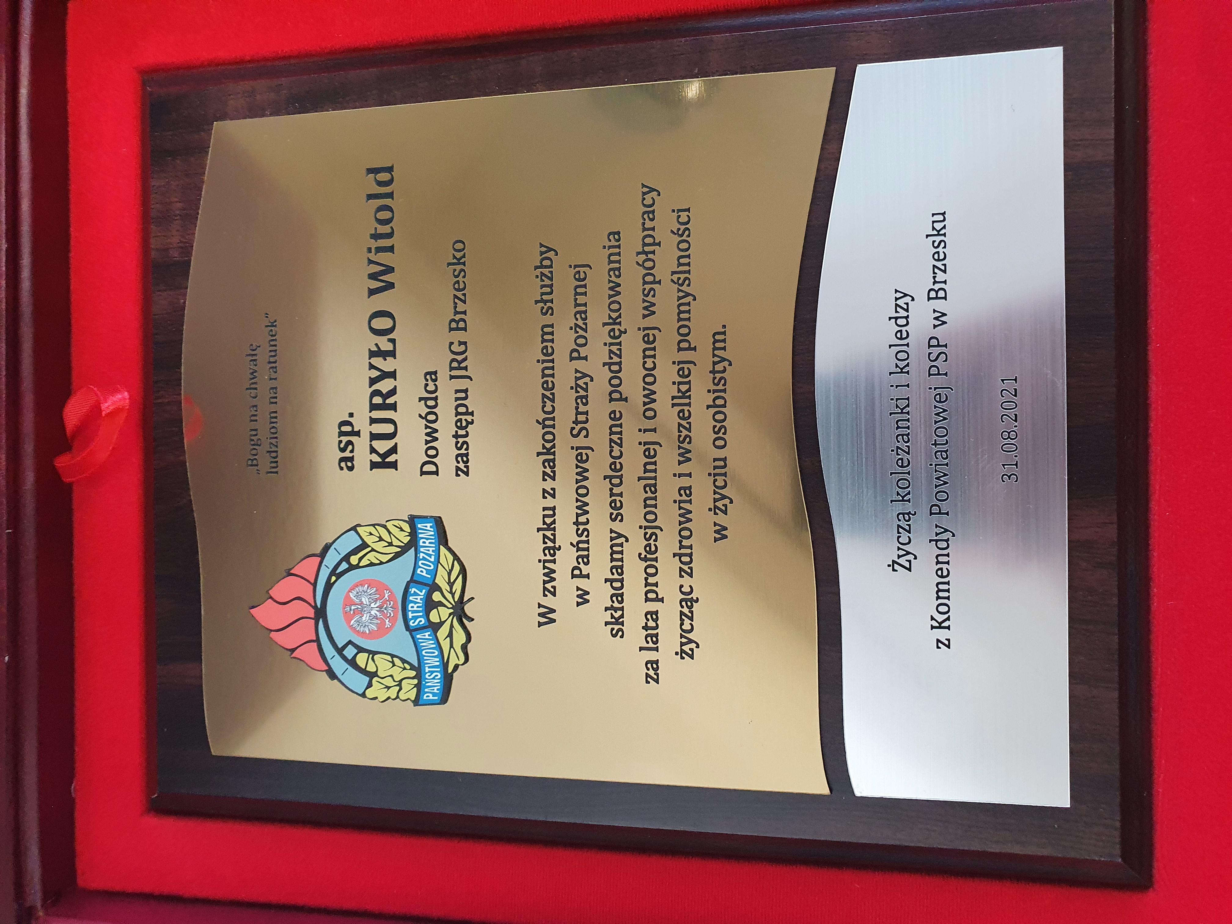31 sierpnia 2021 roku w siedzibie Komendy Powiatowej Państwowej Straży Pożarnej w Brzesku funkcjonariusze oraz pracownicy cywilni pożegnali odchodzących na zaopatrzenie emerytalne funkcjonariuszy mł. bryg. Władysława Świdra oraz asp. Witolda Kuryło.