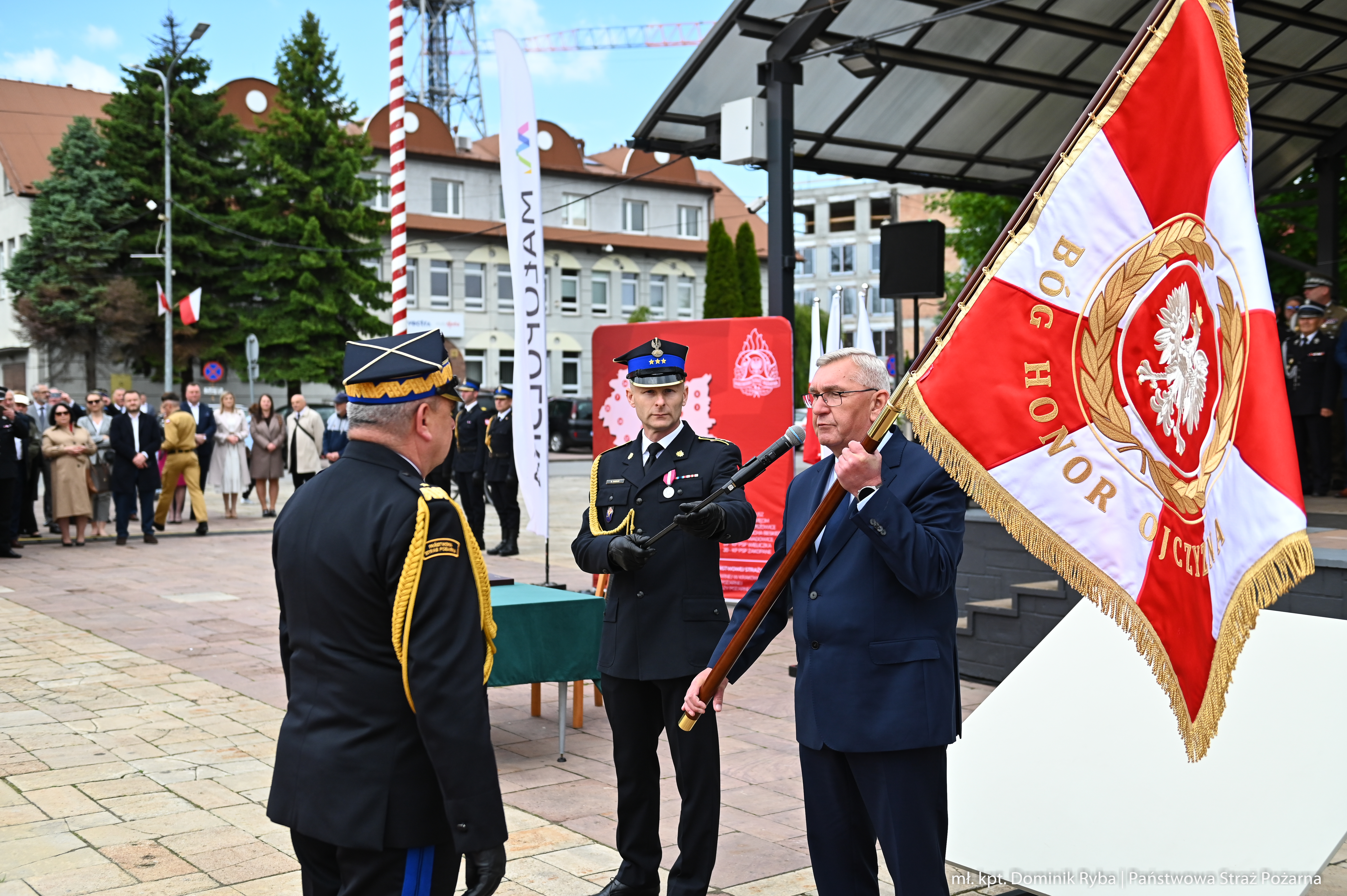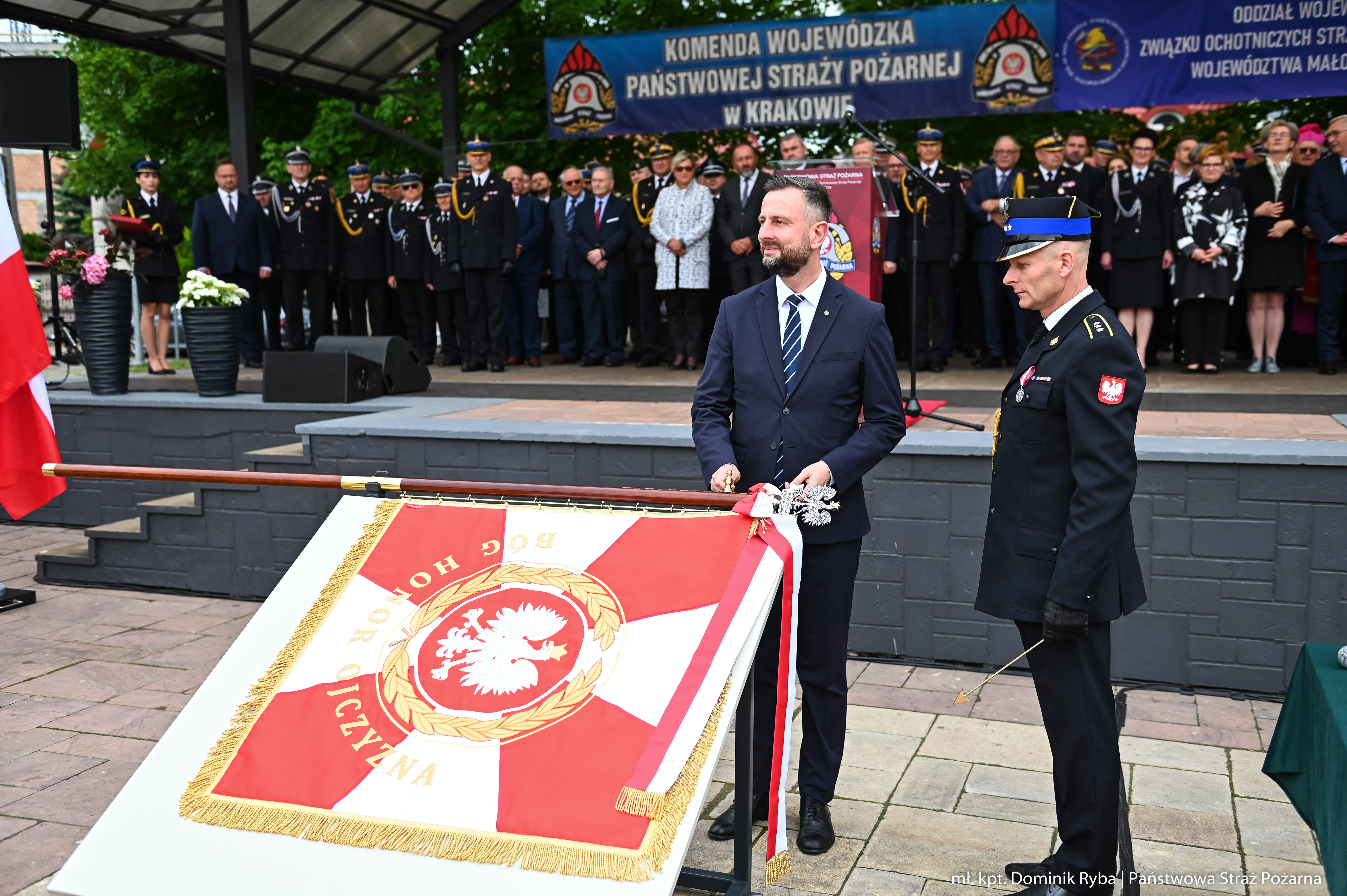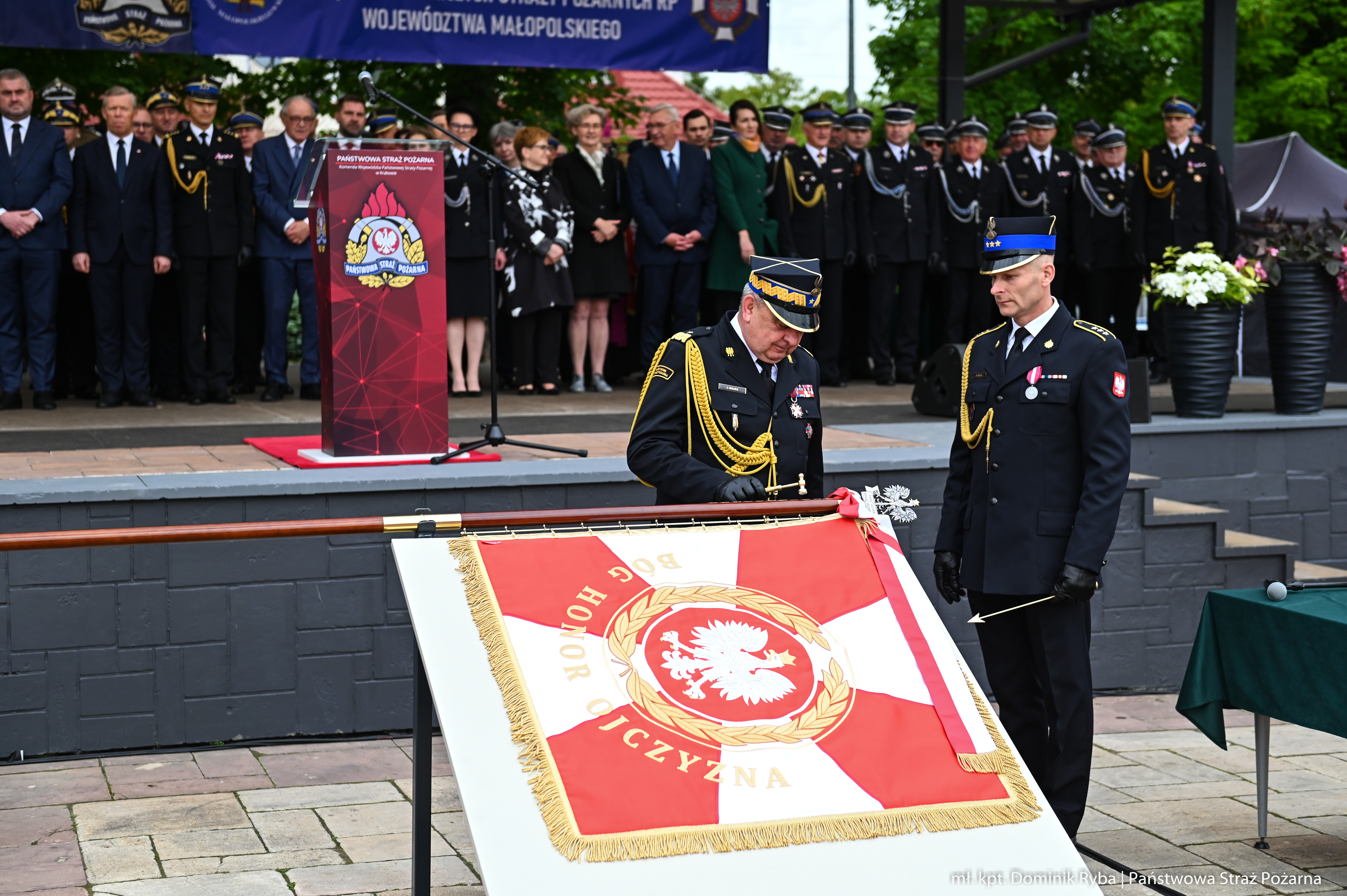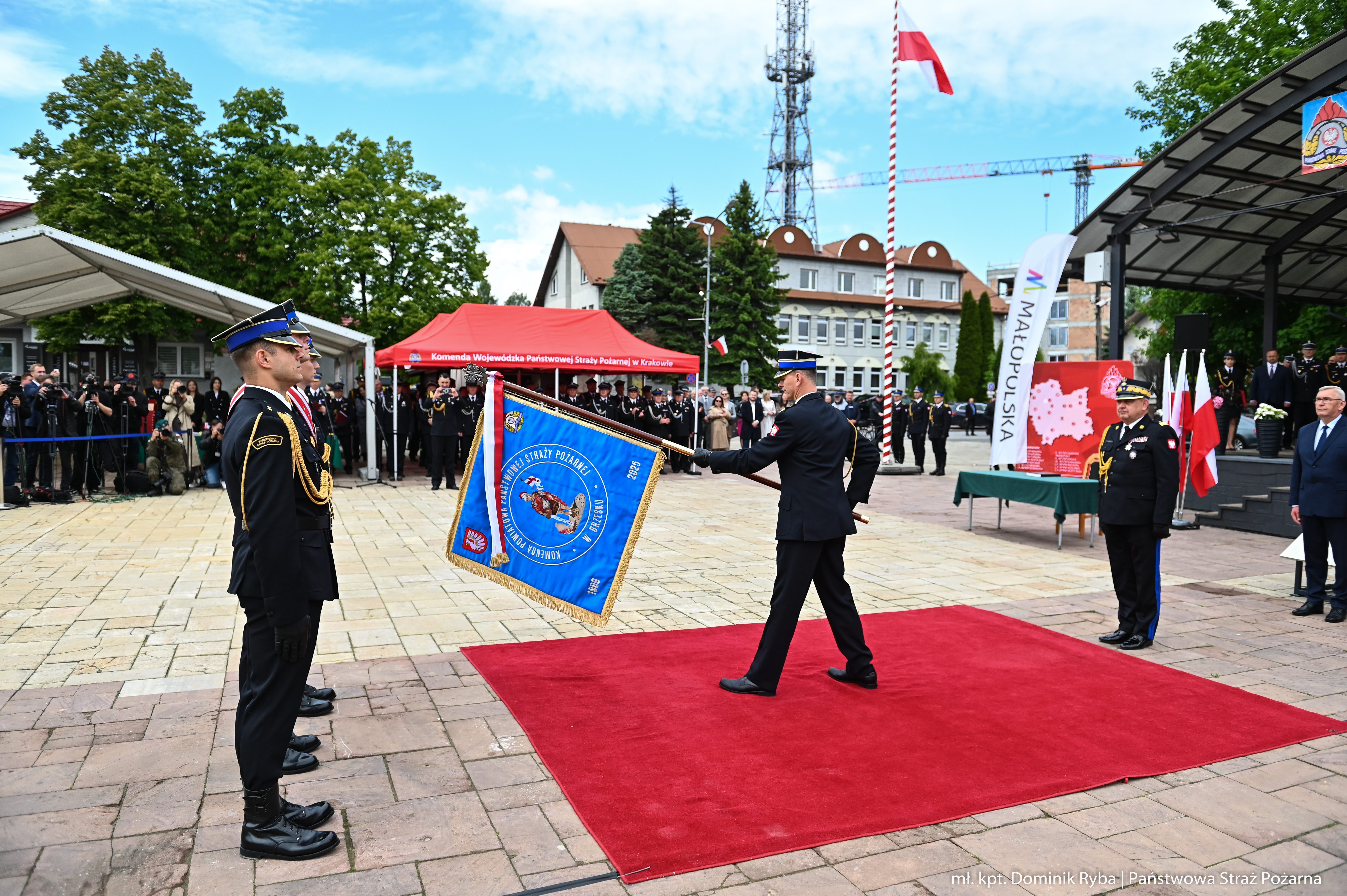 Głównym punktem ceremonii było przekazanie sztandaru Komendzie Powiatowej Państwowej Straży Pożarnej w Brzesku – symbolu honoru i wierności służbie. Następnie wręczono odznaczenia oraz awanse na wyższe stopnie służbowe.