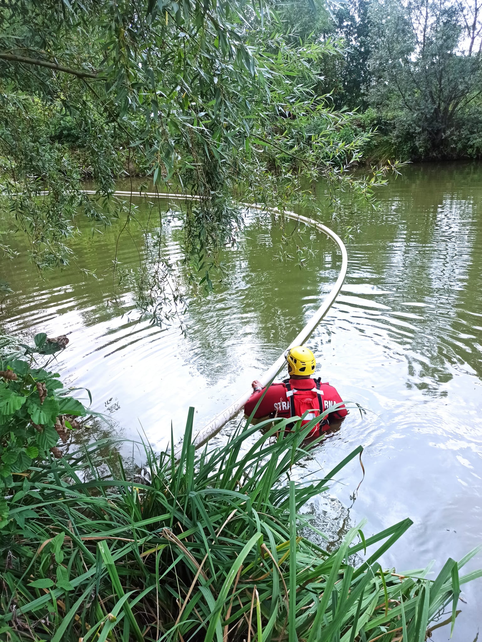 Po przeprowadzeniu rozpoznania stwierdzono, że podczas wykonywania manewru parkowania samochód osobowy stoczył się do zbiornika wodnego, przewracając się na dach. Kierowca opuścił pojazd przed przybyciem JOP samodzielnie. Działania straży polegały na zabezpieczeniu miejsca zdarzenia, wydobyciu pojazdu z wody w celu ograniczenia wycieku substancji ropopochodnych do stawu oraz ograniczenie rozprzestrzeniania się substancji ropopochodnych na powierzchni wody. Dodatkowo podczas działań używane były maty sorpcyjne w celu likwidacji zanieczyszczeń.