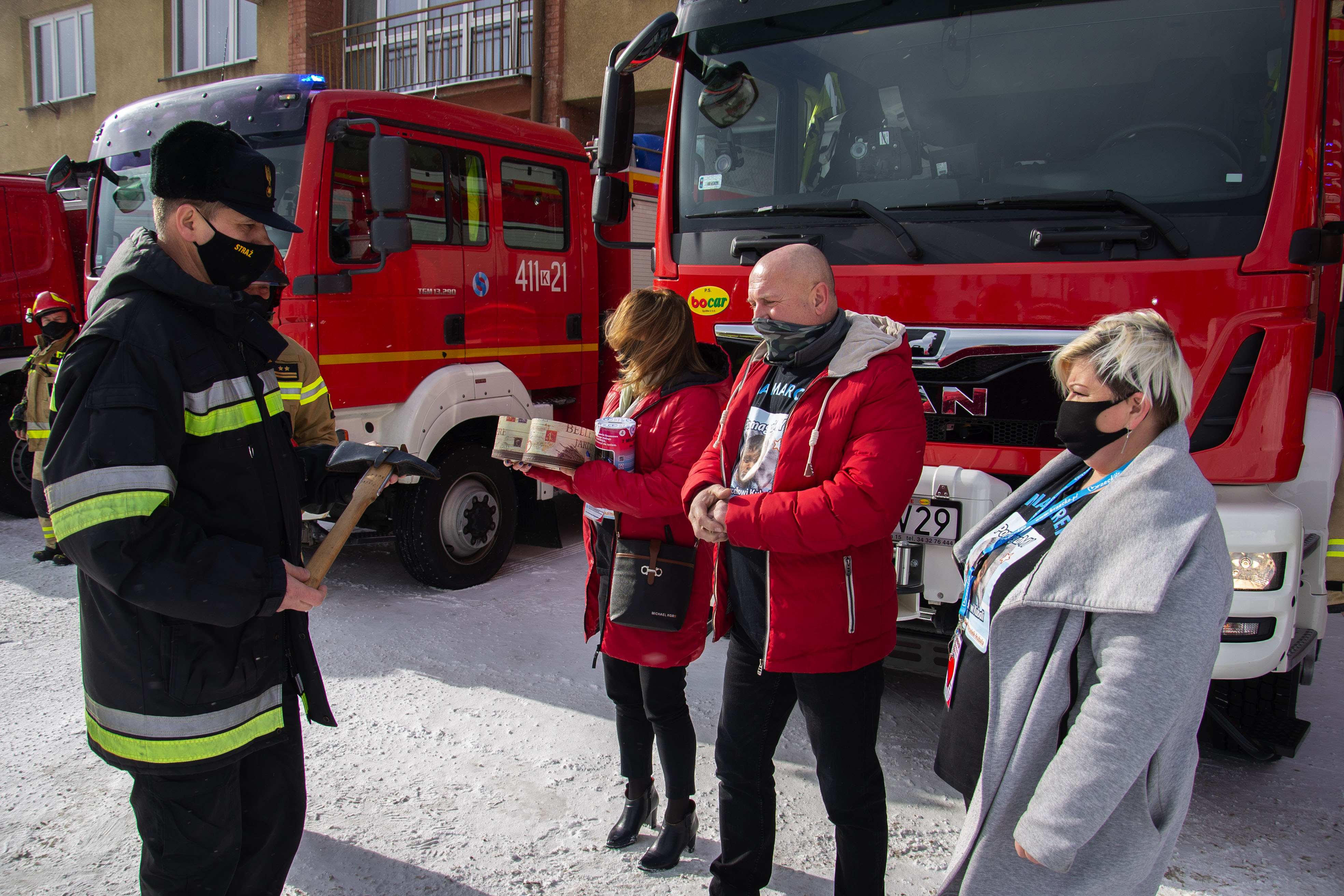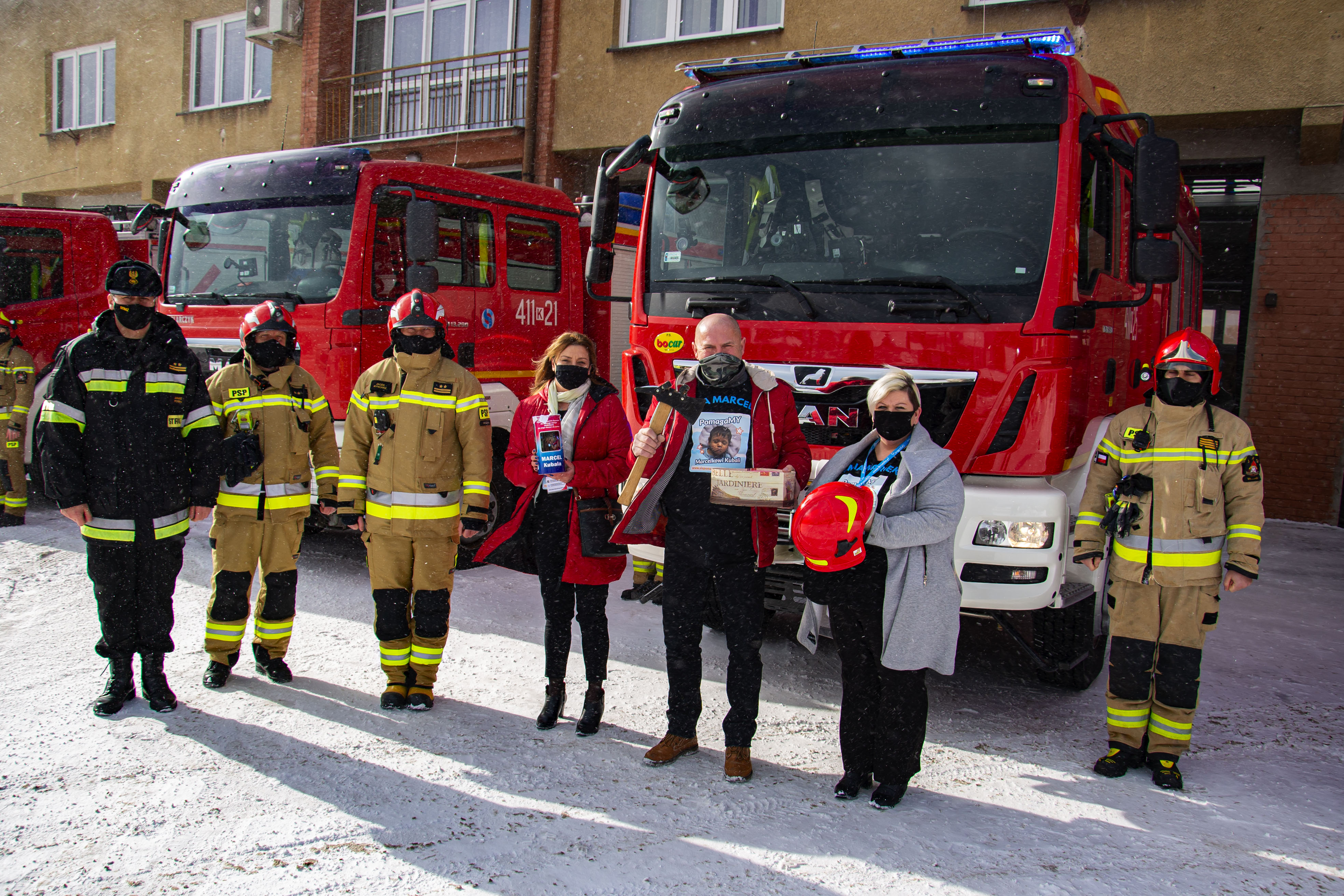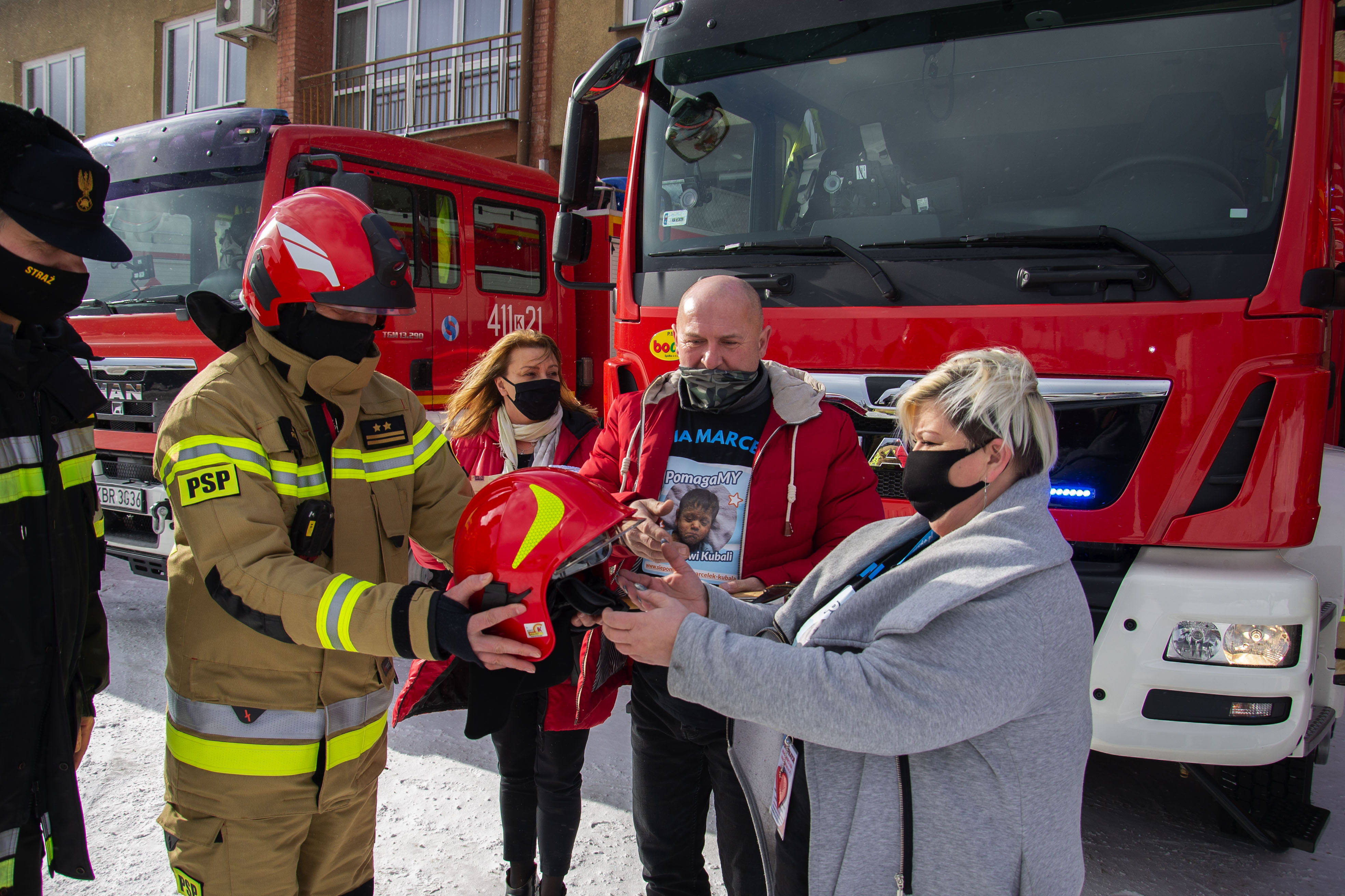 Strażacy z Komendy Powiatowej Państwowej Straży Pożarnej w Brzesku przekazali na licytację hełm strażacki oraz toporek.