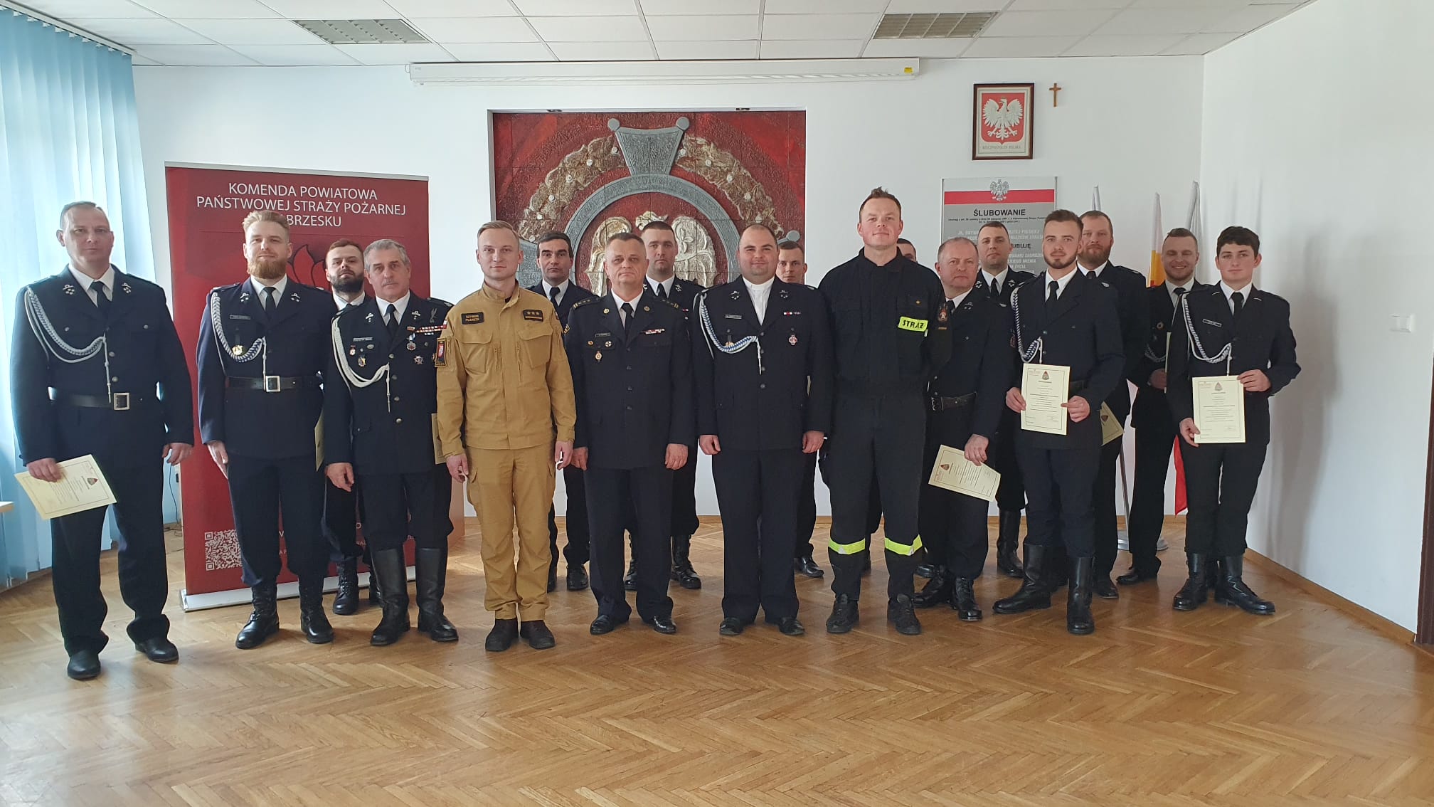 Od 15 do 16 kwietnia br. w Komendzie Powiatowej Państwowej Straży Pożarnej w Brzesku odbyło się szkolenie dowódców uroczystości OSP. Pierwszego dnia program szkolenia opracowany przez funkcjonariuszy Komendy obejmował tematy teoretyczne związane z aktualnymi regulaminami umundurowania, pocztów sztandarowych oraz wybrane elementy z ceremoniału pożarniczego OSP w tym zasady udziału w uroczystościach patriotyczno-religijnych. Drugiego dnia szkolenia omówiono i przećwiczono praktyczne aspekty przygotowań uroczystości w Ochotniczych Strażach Pożarnych, a także sprawdzono i skorygowano powszechne błędy dot. umundurowania, pocztów sztandarowych i flagowych. Ćwiczono także podstawowe elementy musztry i uroczystego apelu.