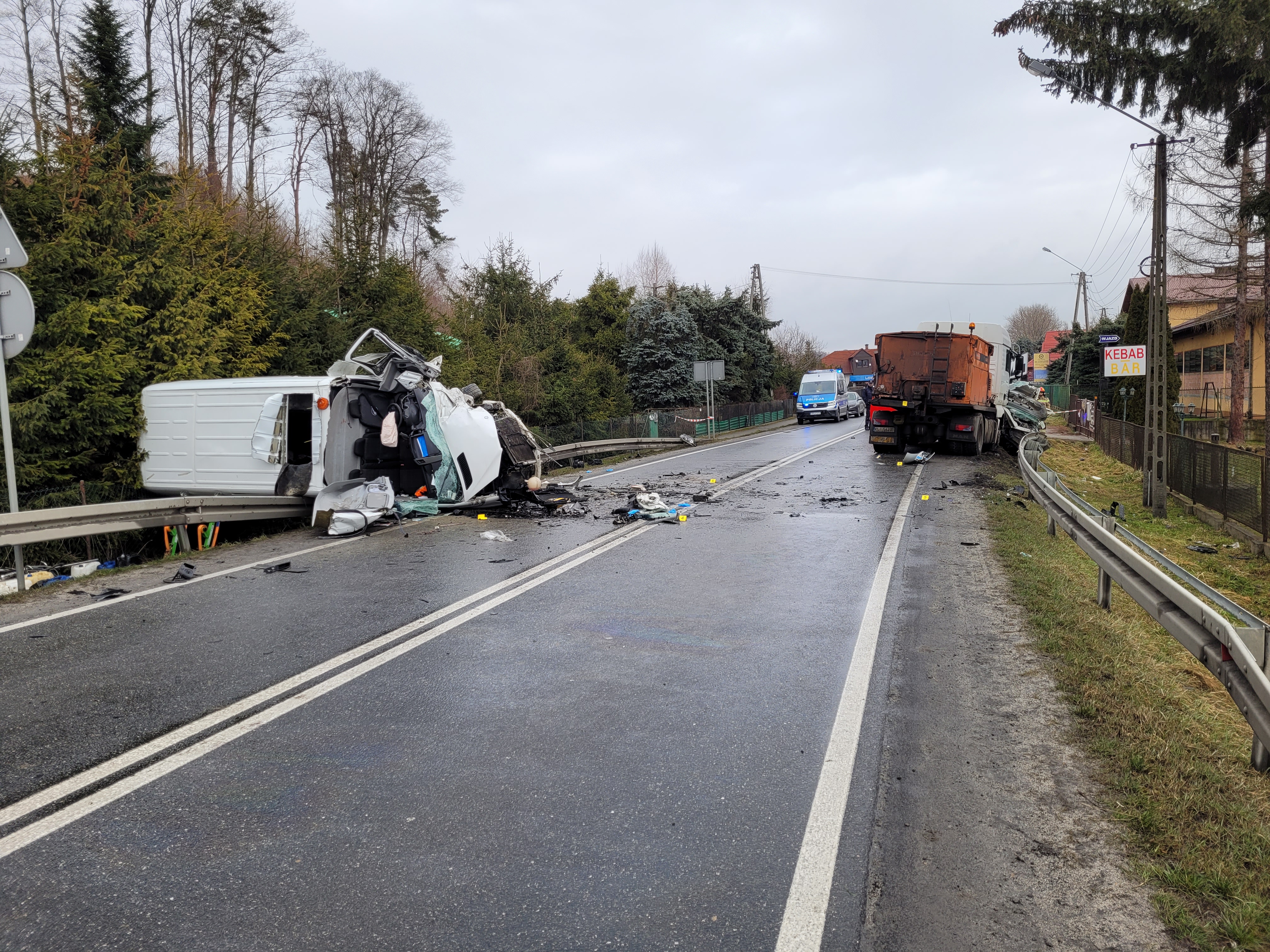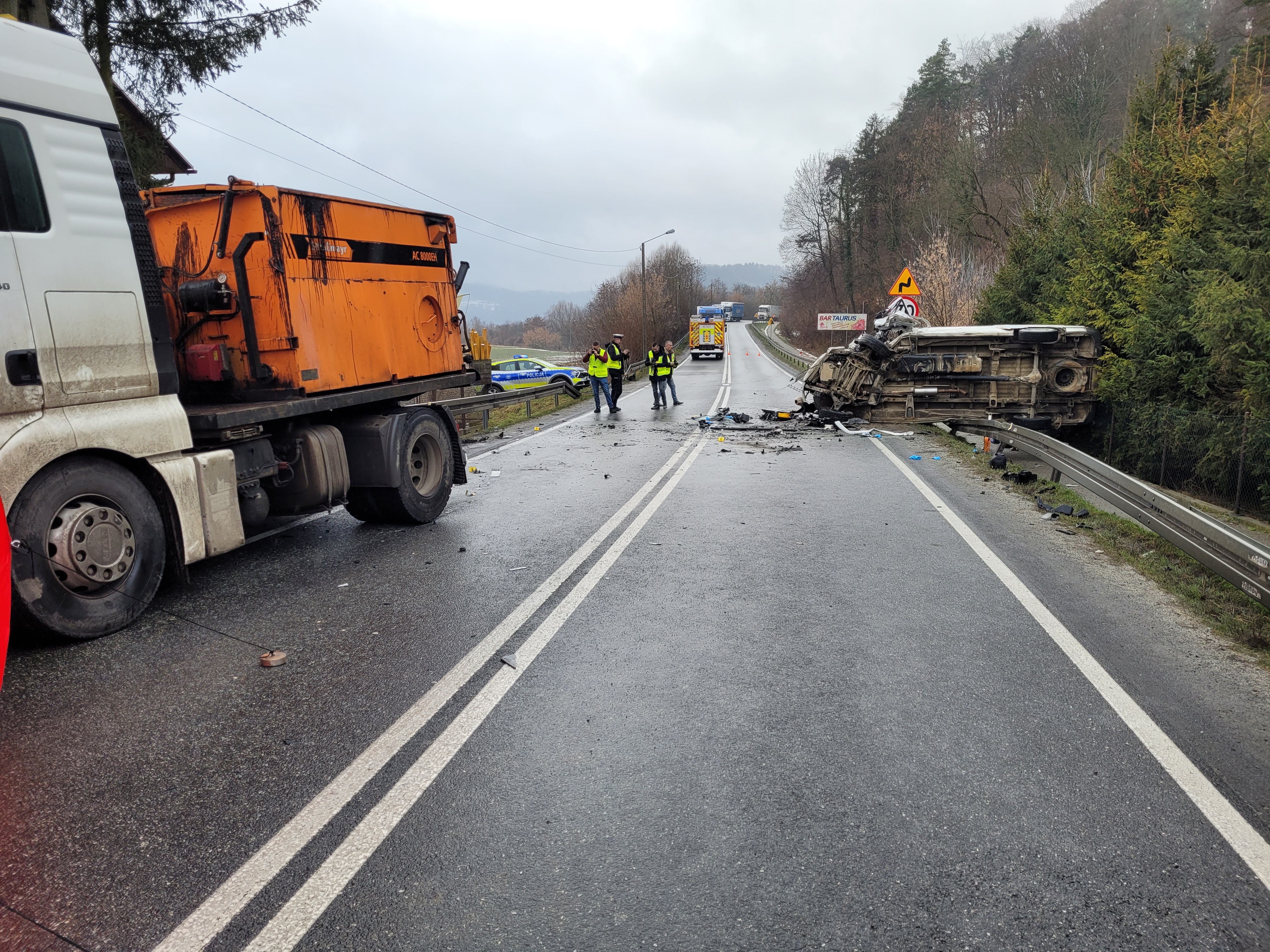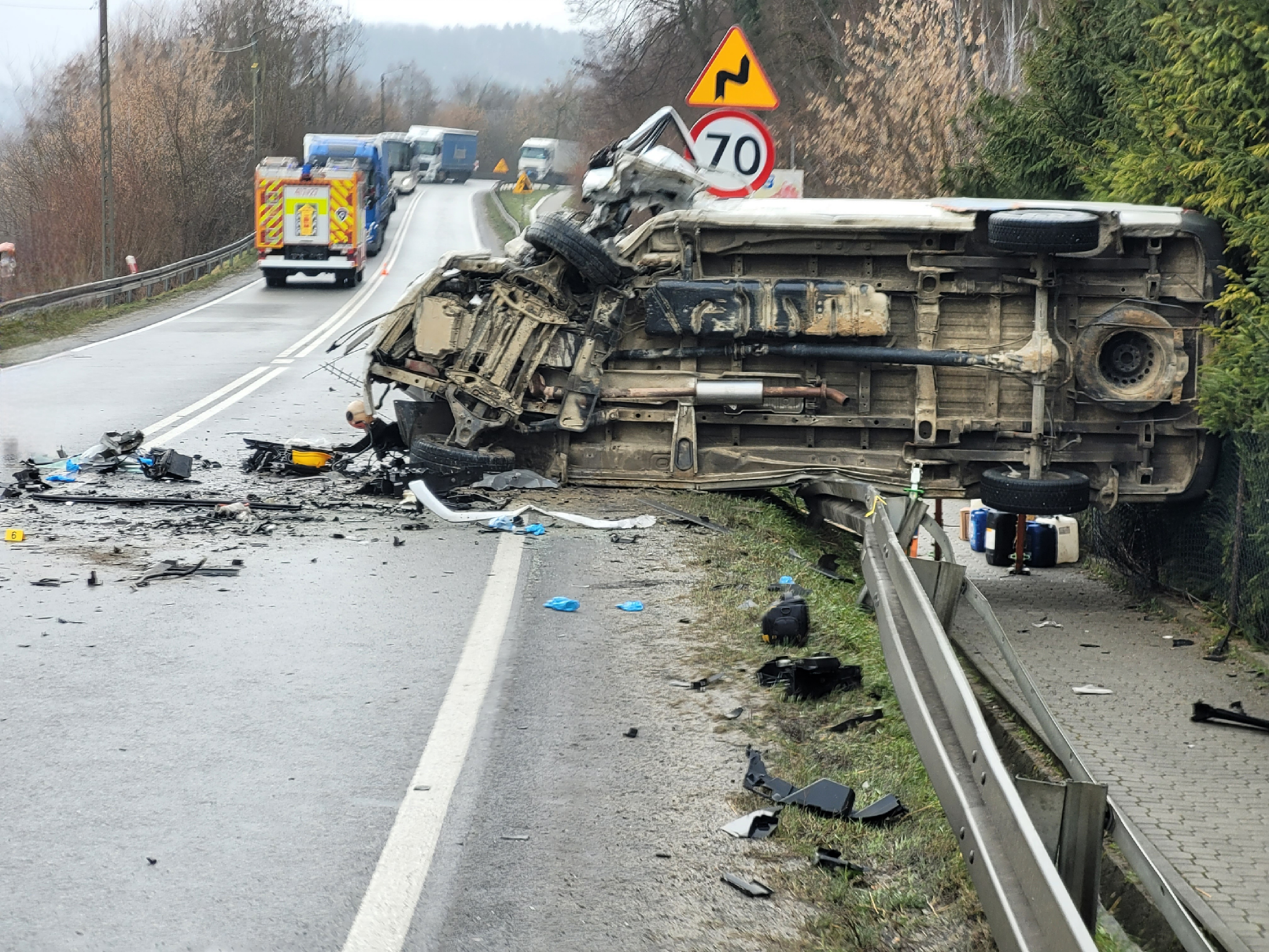W zdarzeniu uczestniczyły 3 samochody (dwa busy oraz samochód ciężarowy), w pojazdach łącznie podróżowało 10 osób. Na miejscu zdarzenia konieczna była stabilizacja pojazdu oraz użycie sprzętu hydraulicznego.