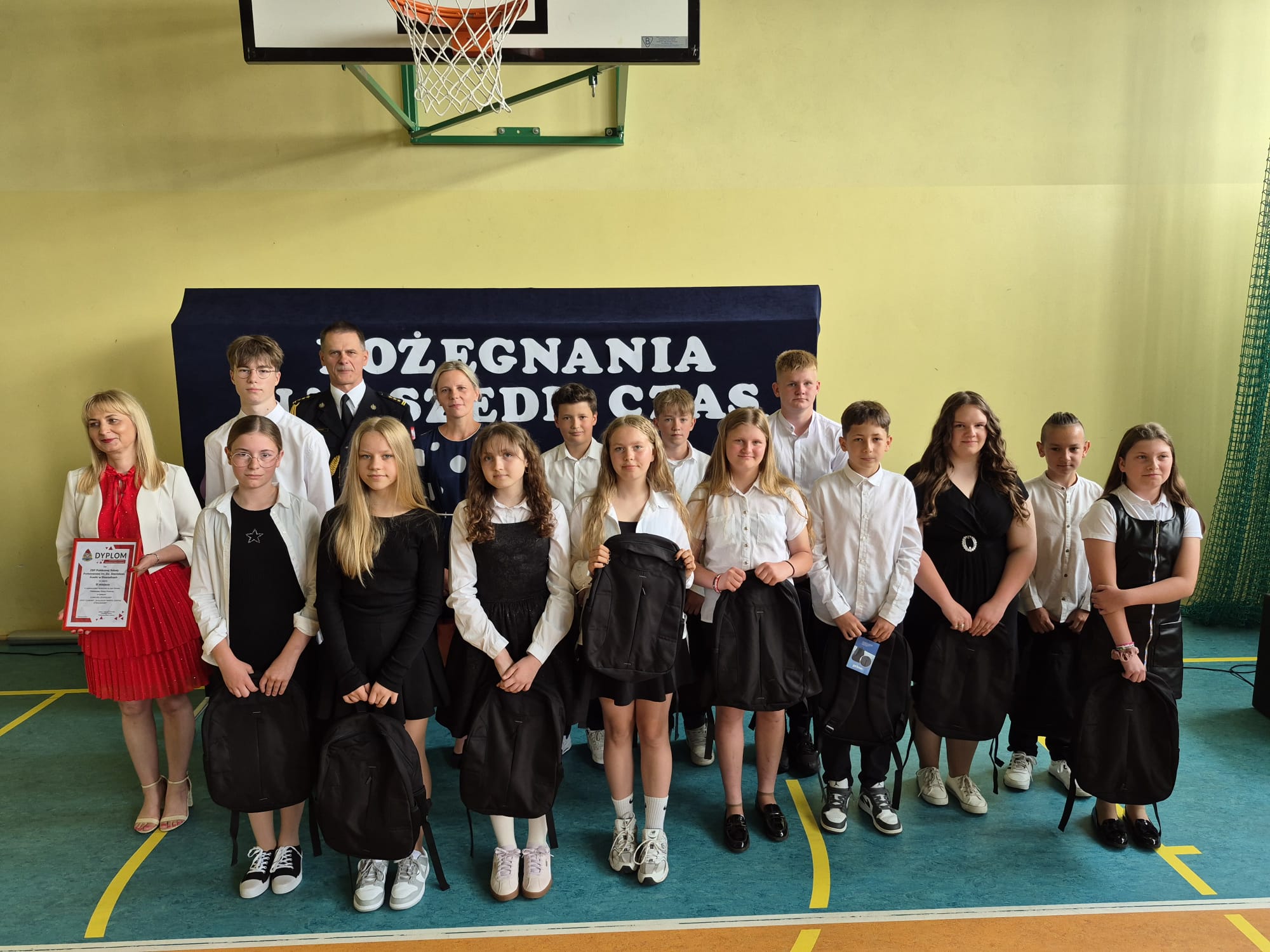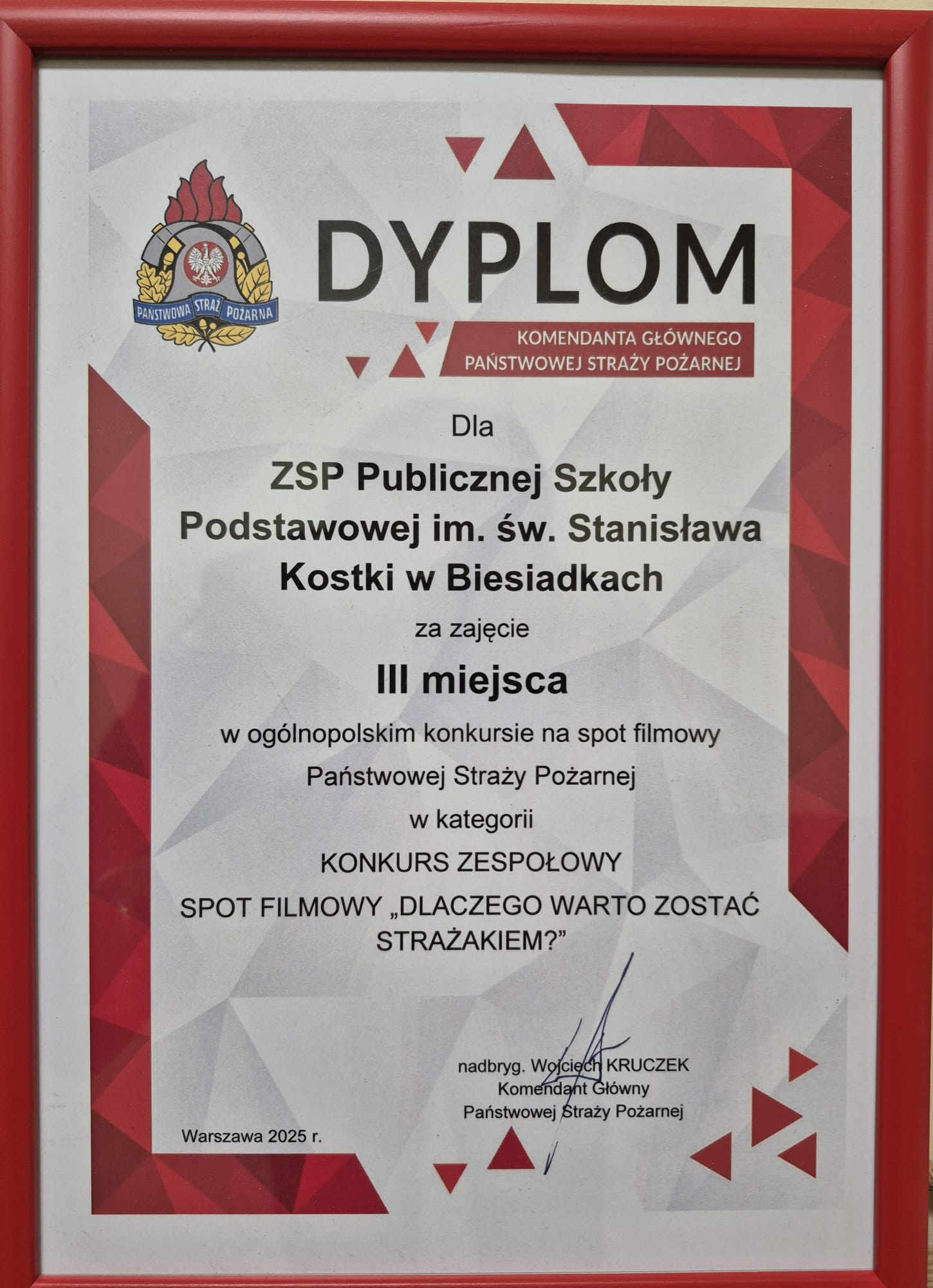 Podczas uroczystego apelu z okazji zakończenia roku szkolnego 2024/2025 w Zespole Szkolno-Przedszkolnym w Publicznej Szkole Podstawowej im. Św. Stanisława Kostki w Biesiadkach miało miejsce wręczenie nagród dla 14-osobowego zespołu oraz opiekuna p. Anny Korczyńskiej. Uczniowie reprezentujący klasę szóstą zajęli III miejsce w ogólnopolskim konkursie na spot filmowy w kategorii „DLACZEGO WARTO ZOSTAĆ STRAŻAKIEM”.