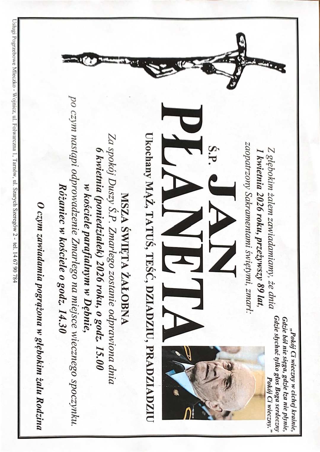 Z przykrością zawiadamiamy, że dnia 1 kwietnia 2026 roku, przeżywszy 89 lat zmarł st. ogn. w st. spocz. Jan Płaneta