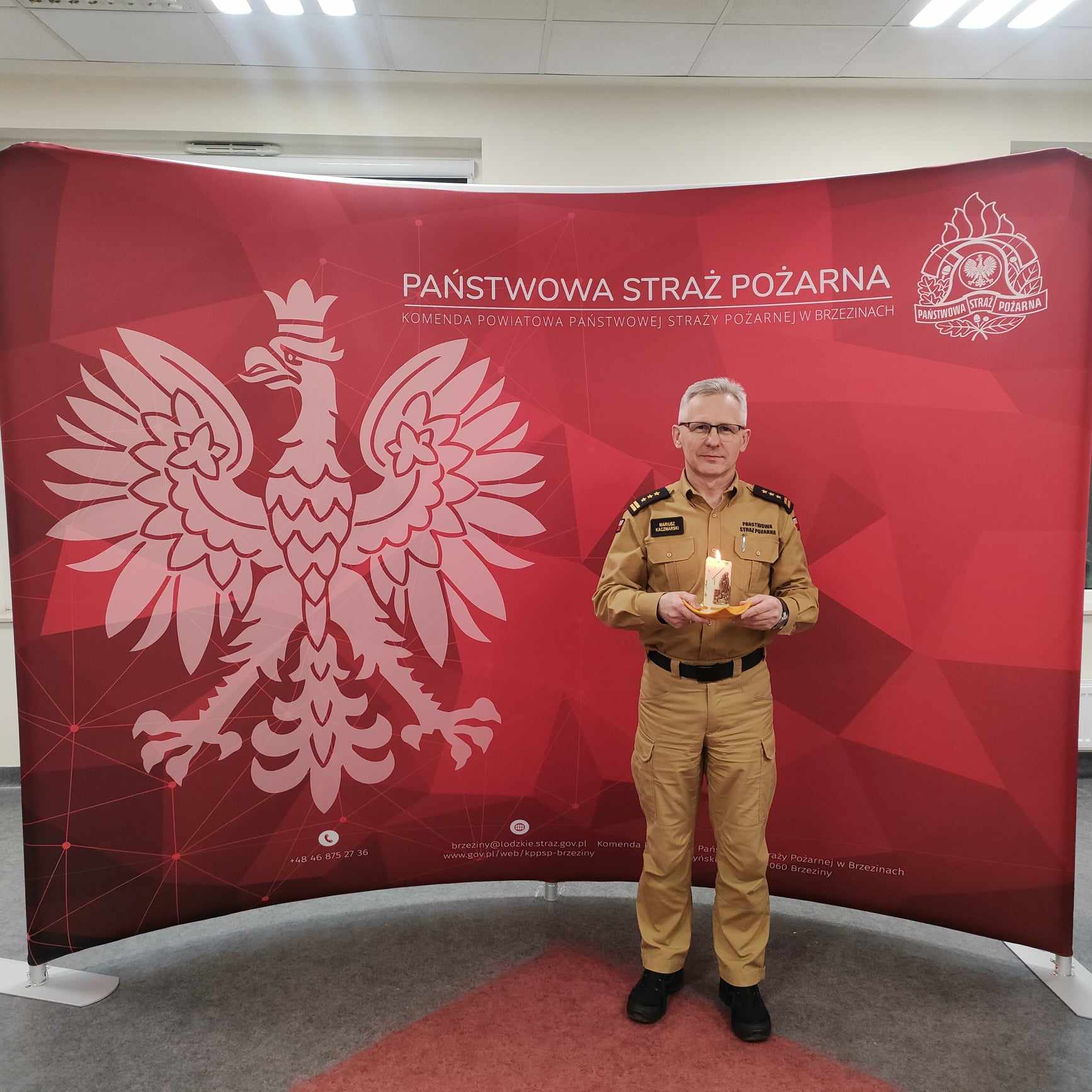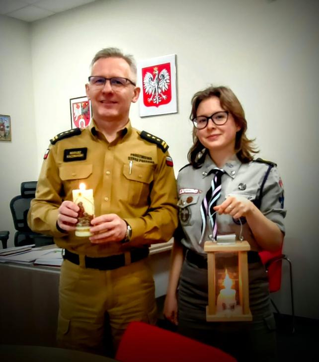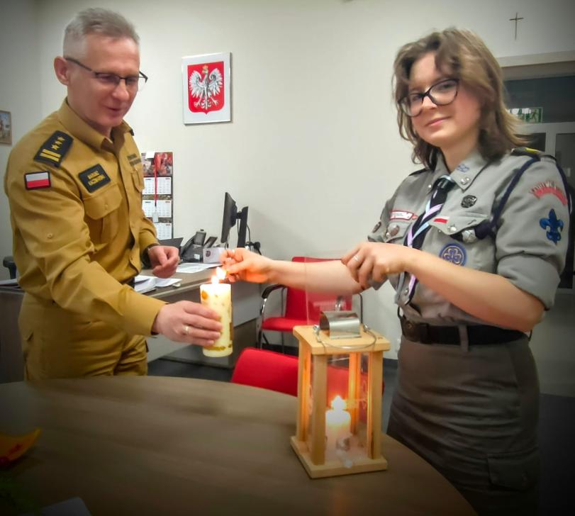 20 grudnia 2024 roku st. bryg. Mariusz Kaczmarski, komendant powiatowy PSP w Brzezinach odebrał z rąk brzezińskich harcerzy Betlejemskie Światło Pokoju, którego historia zaczyna się