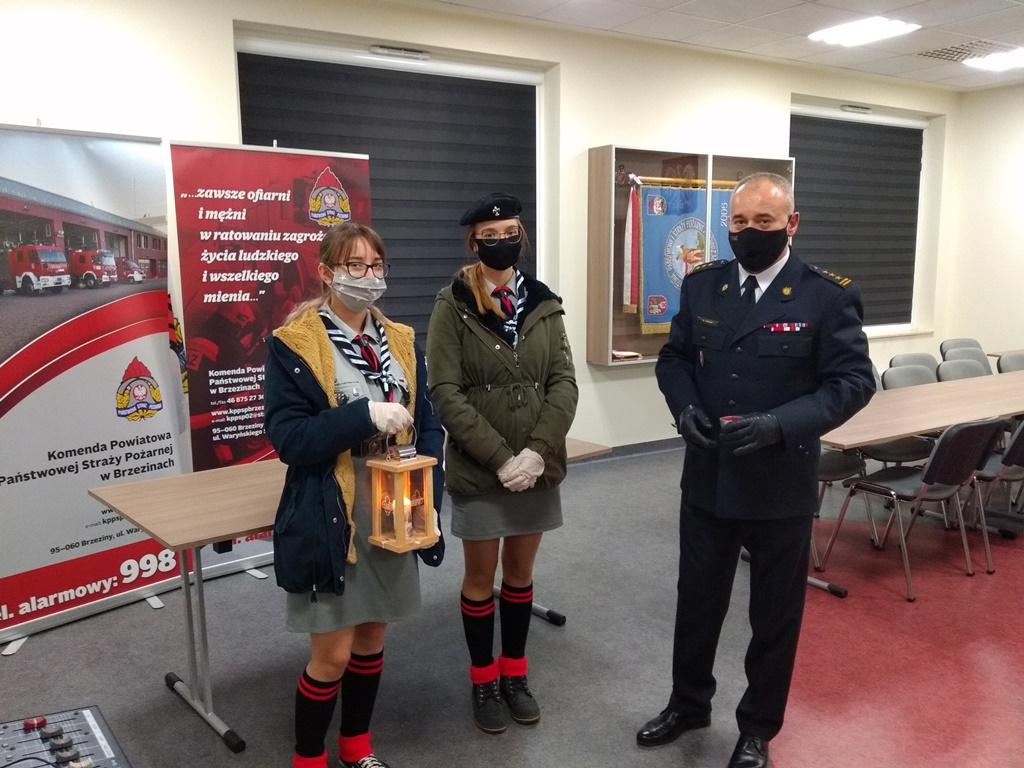 17 grudnia br. st. bryg. Dariusz Guzek, komendant powiatowy PSP w Brzezinach odebrał z rąk brzezińskich harcerzy Betlejemskie Światło Pokoju, którego historia zaczyna się w miejscu narodzenia Jezusa Chrystusa w Betlejem, gdzie w Grocie Narodzenia Pańskiego płonie wieczny ogień, od którego co roku odpala się jedną świeczkę, której płomień-znak pokoju, niesiony przez skautów z całej Europy, a wśród nich harcerki i harcerzy ZHP obiega cały świat.