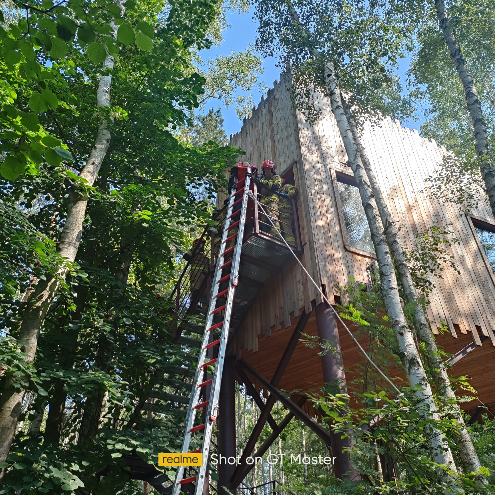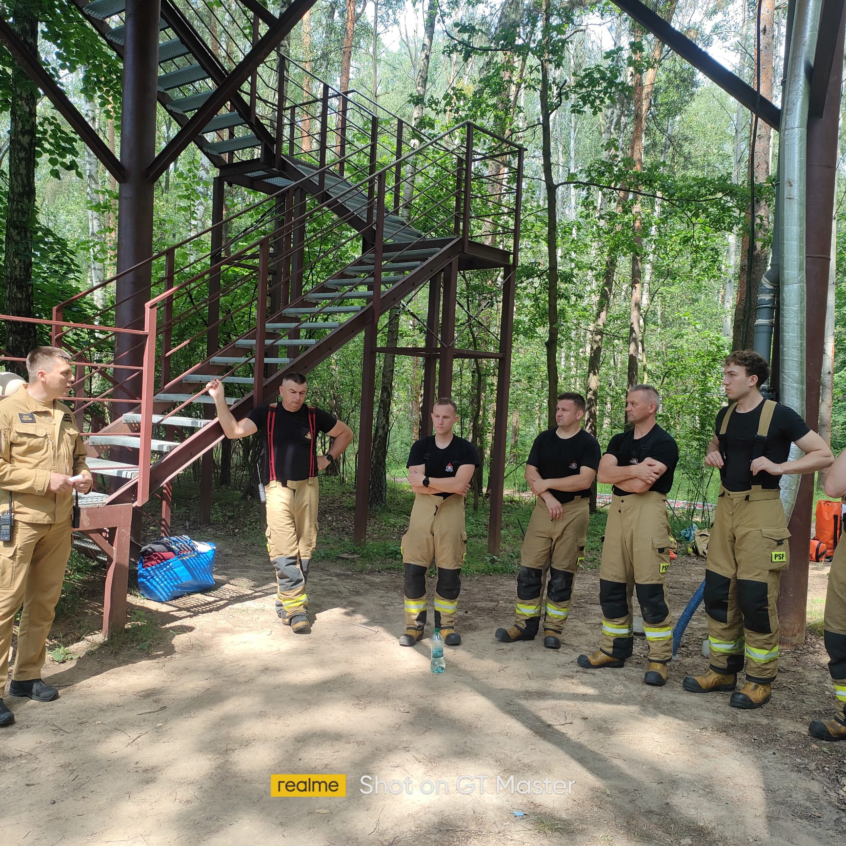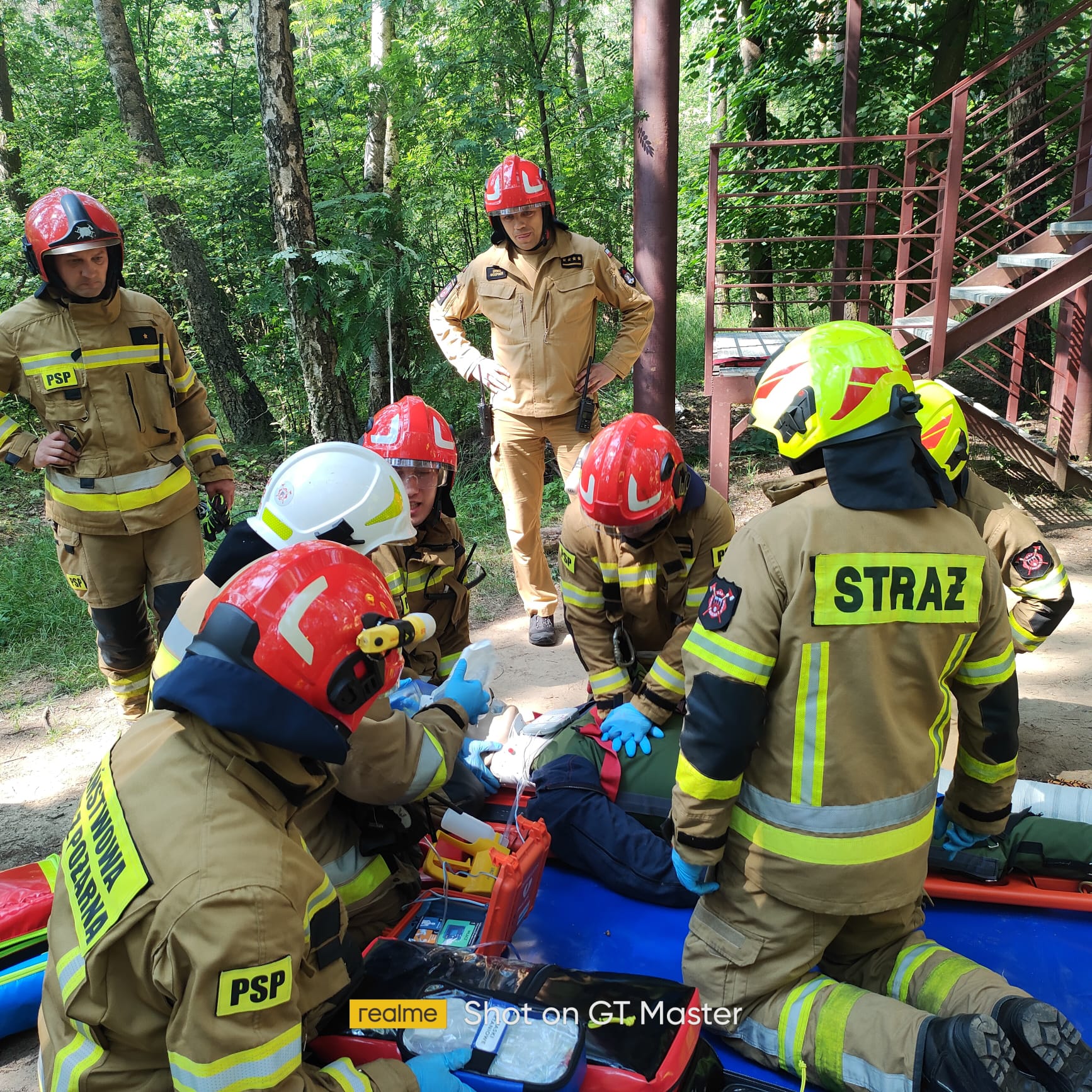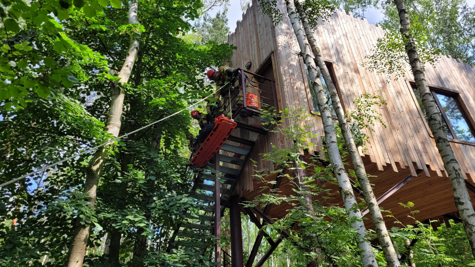 W dniach 16-18 czerwca 2025 roku w kompleksie rekreacyjno-wypoczynkowym Kraina Dzikiej Kaczki Bronowice 10, 95-060 Brzeziny miały miejsce ćwiczenia obiektowe, podczas których Jednostki Ochrony Przeciwpożarowej z ternu gminy Brzeziny doskonaliły swoje umiejętności na podstawie ułożonego scenariusza: „ Podczas wykonywania rutynowych prac konserwacyjnych w domku na drzewie, pracownik przystąpił do wymiany żarówki. W wyniku kontaktu z uszkodzoną instalacją elektryczną doszło do porażenia prądem, co spowodowało utratę równowagi i upadek z drabiny znajdującej się wewnątrz domku. Domek zlokalizowany jest na wysokości około siedmiu metrów nad poziomem gruntu. Poszkodowany jest przytomny, lecz uskarża się silny ból lewej kończyny dolnej oraz miednicy, nie jest w stanie się poruszać. Ze względu na bardzo wąskie i kręte schody prowadzące z domku na ziemię, ewakuacja poszkodowanego w sposób standardowy jest niemożliwa. Dodatkowym utrudnieniem jest brak możliwości dojazdu samochodu ratowniczo-gaśniczego w bezpośrednie sąsiedztwo miejsca zdarzenia, ponieważ obiekt znajduje się w zalesionym terenie z ograniczonym dostępem drogowym”.
