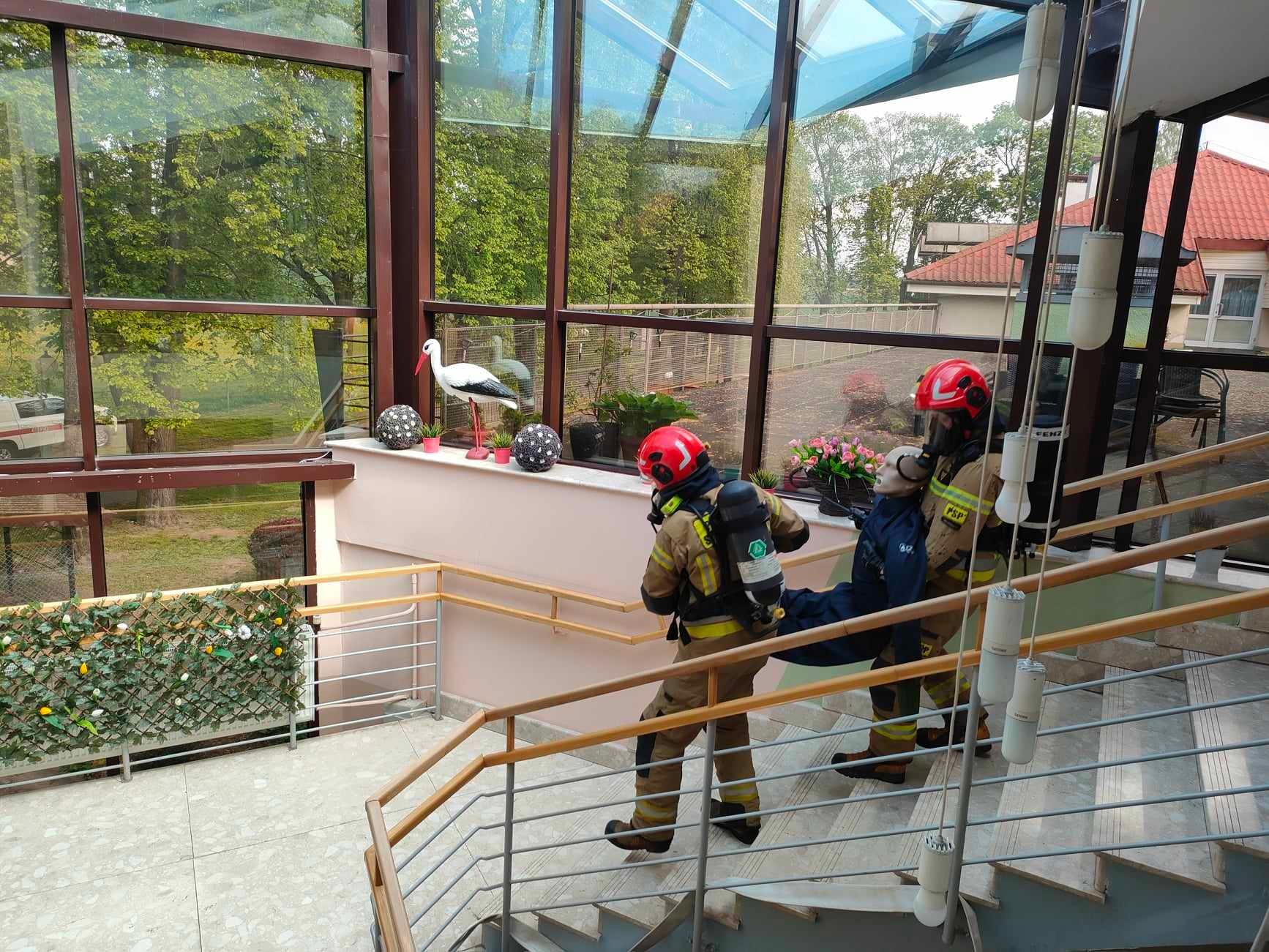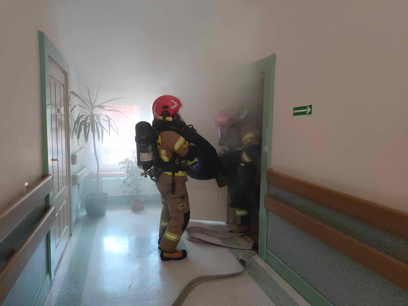 w którym przebywają osoby o ograniczonej zdolności poruszania się”. Celem ćwiczeń było poznanie specyfiki obiektu zakwalifikowanego do ZL II, rozpoznanie występujących zagrożeń w obiekcie oraz dróg pożarowych, sprawdzenie zachowania pensjonariuszy DPS podczas wystąpienia sytuacji zagrożenia pożarowego, sprawdzenie możliwości taktycznych sił