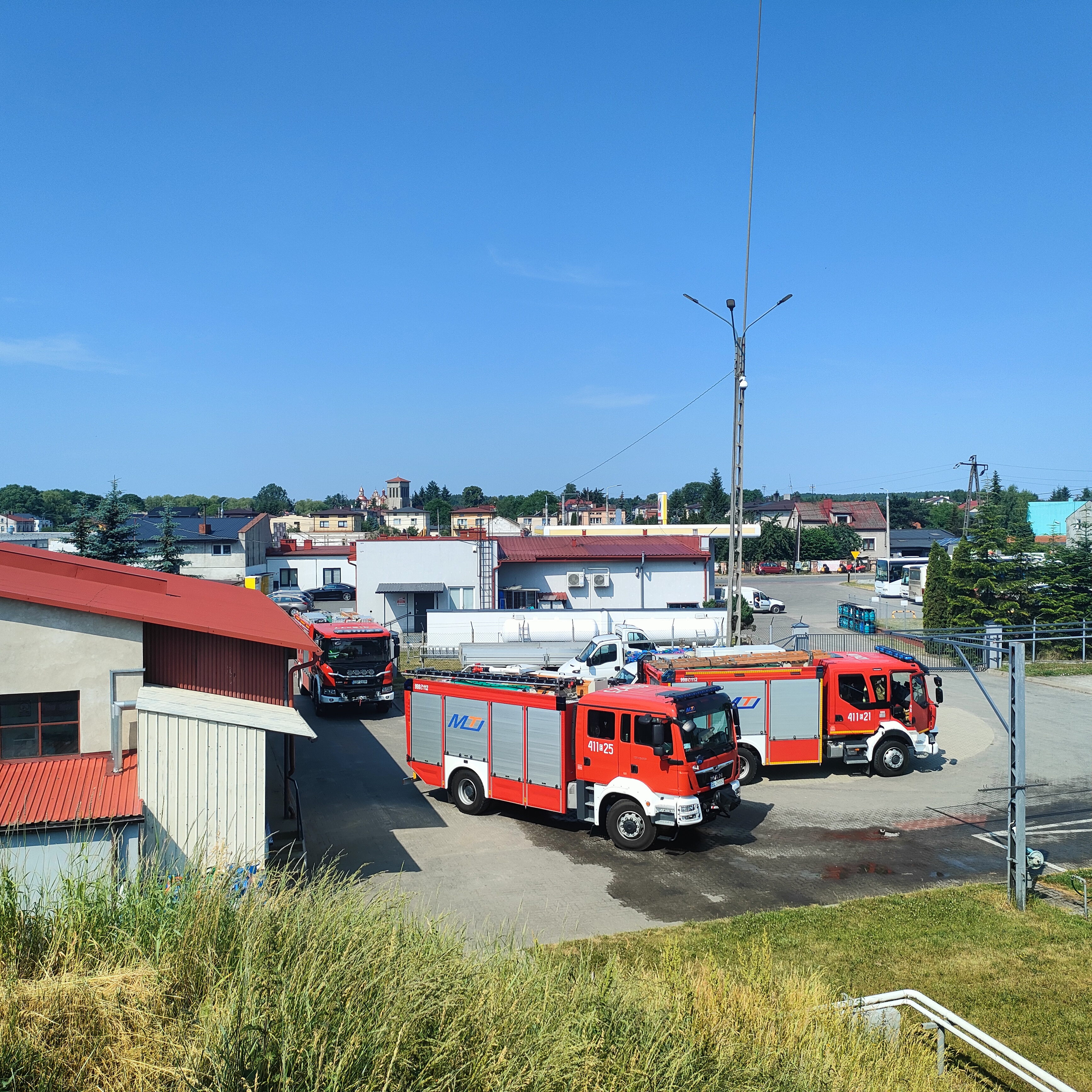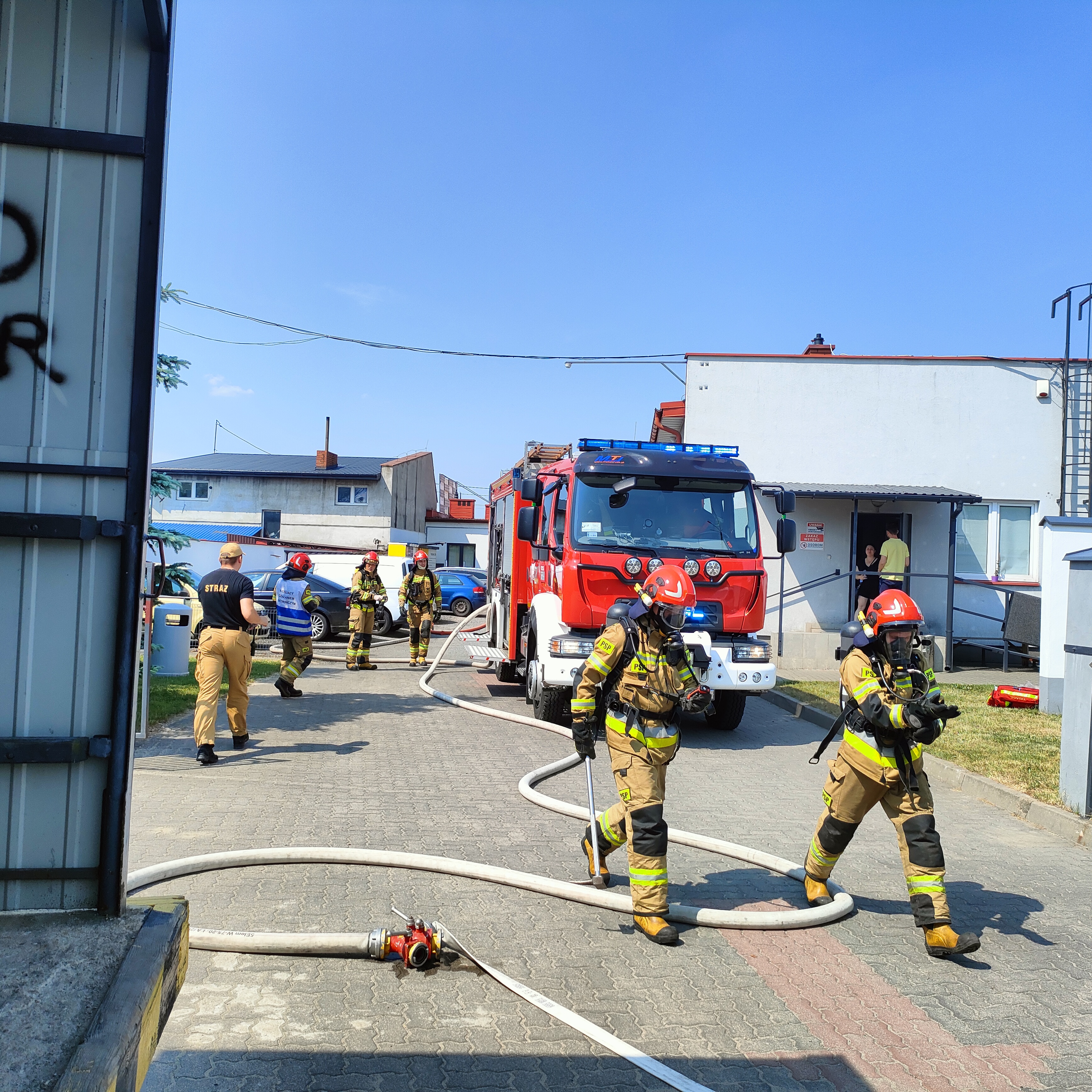 Na szczęście to epizod ćwiczeń, które zostały zaplanowane w dniach 20 – 22 czerwca 2023 roku w celu doskonalenia umiejętności w zakresie zabezpieczenia miejsca zdarzenia podczas działań ratowniczo – gaśniczych z obecnością gazu propan-butan, operowania prądami gaśniczymi w natarciu oraz obronie, udzielania KPP osobie poszkodowanej, wykorzystania urządzeń pomiarowych, ewakuacji osób ze strefy zagrożenia oraz współpracy jednostek OSP z JRG w czasie działań ratowniczo-gaśniczych.