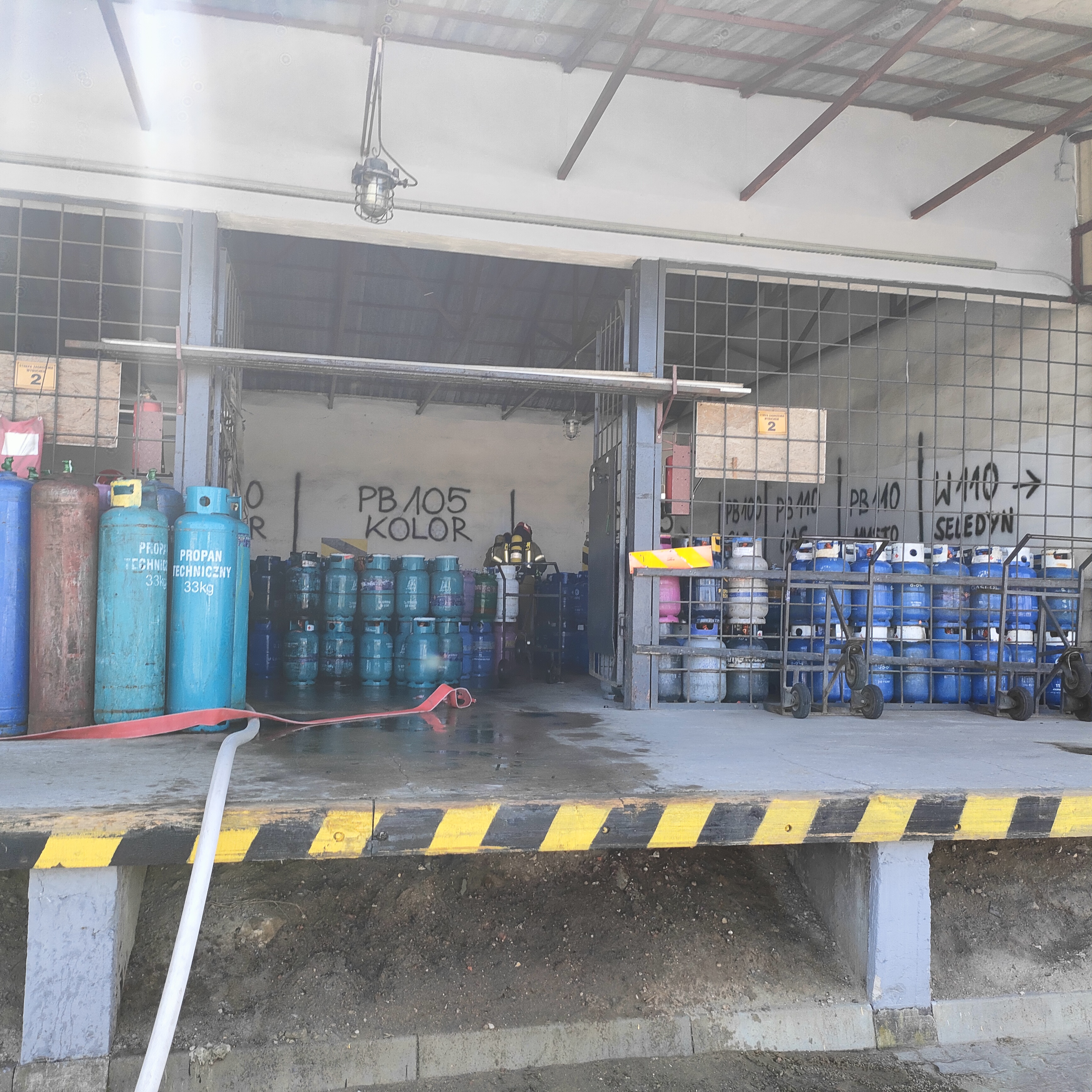 Na Stanowisko Kierowania Komendanta Powiatowego Państwowej Straży Pożarnej w Brzezinach wpływa informacja treści - w miejscowości Brzeziny przy ulicy Waryńskiego 8 w obiekcie rozlewni gazu płynnego (zakład zwiększonego ryzyka) doszło do wybuchu jednej z butli z gazem propan-butan. W wyniku wybuchu powstał pożar, którego promieniowanie cieplne oddziaływuje na inne butle znajdujące się w obiekcie oraz na uszkodzoną armaturę do tankowania. Wybuch spowodował, że jeden z pracowników został poszkodowany i znajduje się wewnątrz obiektu. Świadkowie zdarzenia twierdzą, że poszkodowany jest nieprzytomny, ale z obawy o własna życie nie ewakuowali go z budynku rozlewni. Istnieje prawdopodobieństwo, że w obiekcie może przebywać większa ilość osób poszkodowanych.