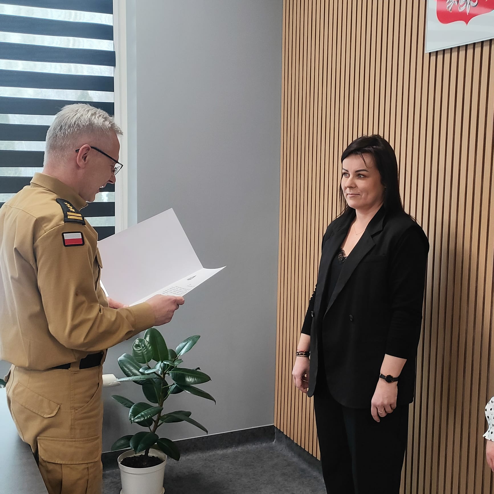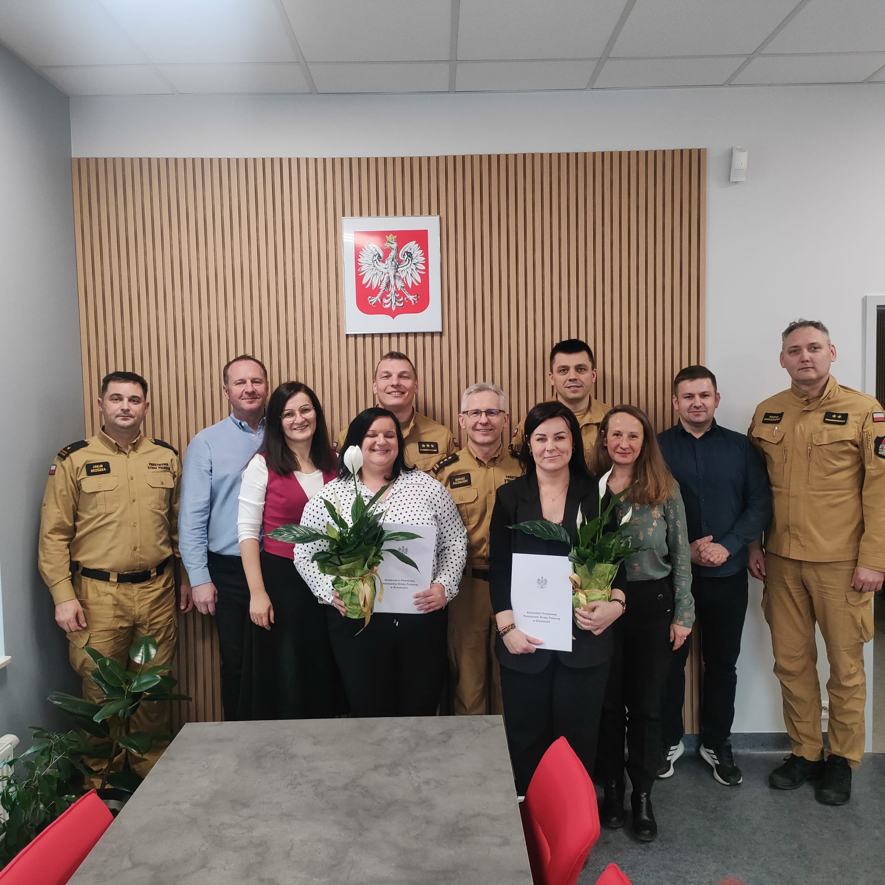 Podczas spotkania Komendant Powiatowy PSP w Brzezinach, st. bryg. Mariusz Kaczmarski, wraz z funkcjonariuszami komendy, złożył serdeczne życzenia i podziękowania Pani Karolinie Węziak-Tomeckiej oraz Pani Justynie Malesa za ich profesjonalizm, zaangażowanie i codzienny wkład w sprawne funkcjonowanie komendy oraz w bezpieczeństwo mieszkańców powiatu brzezińskiego.