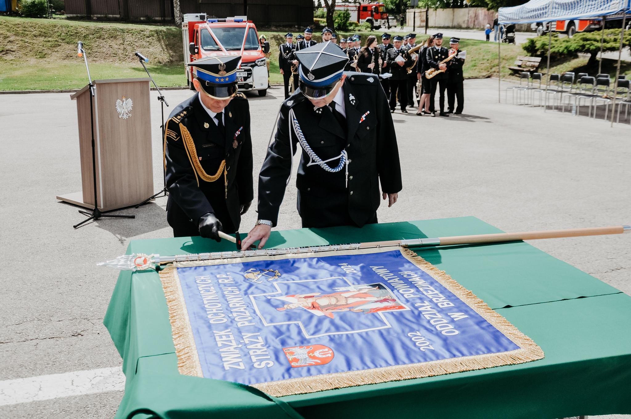 Jednym z kluczowych momentów uroczystości było nadanie sztandaru Oddziałowi Powiatowemu Związku OSP RP w Brzezinach wraz z symbolicznym wbiciem gwoździ i poświęceniem sztandaru.