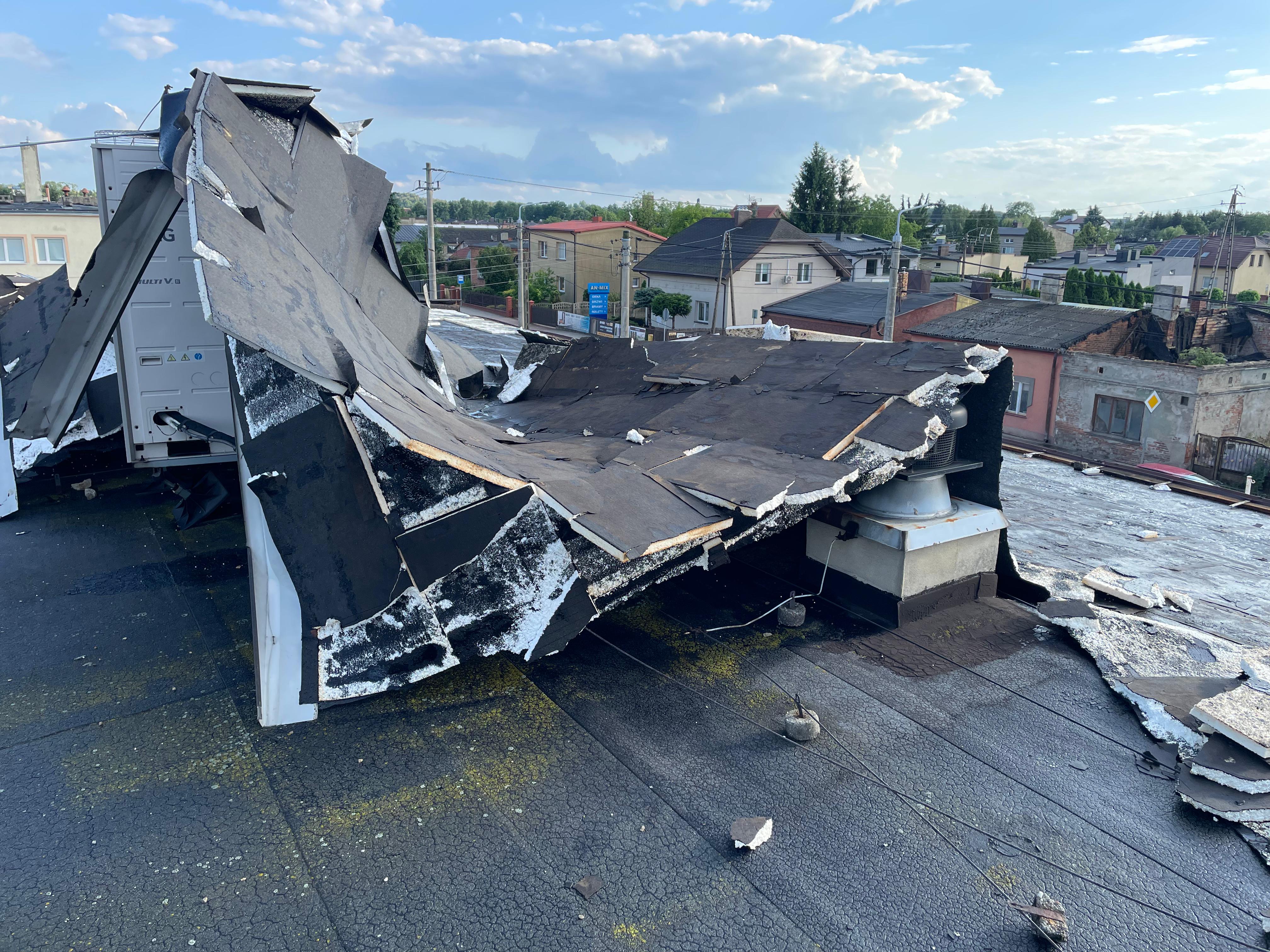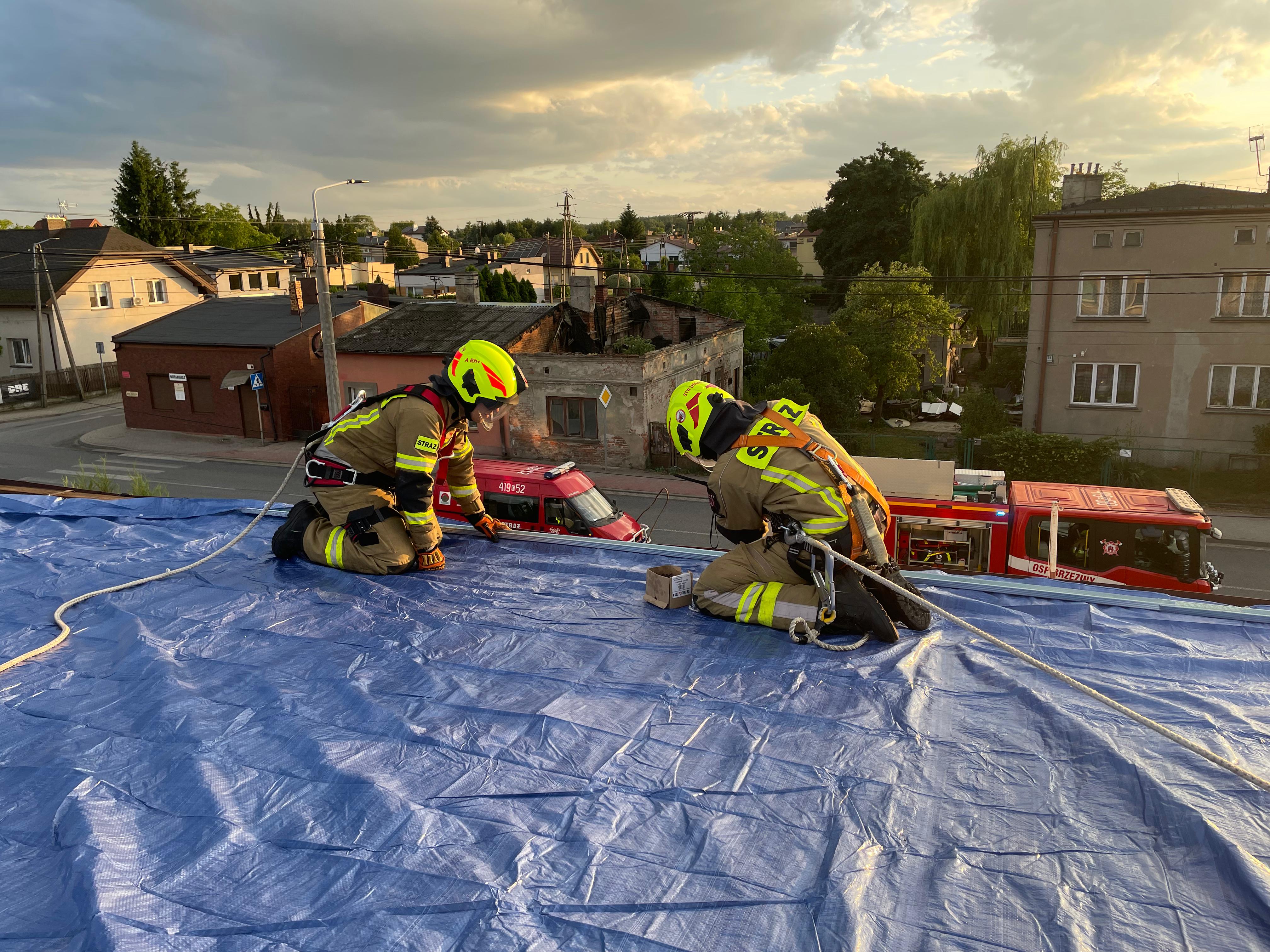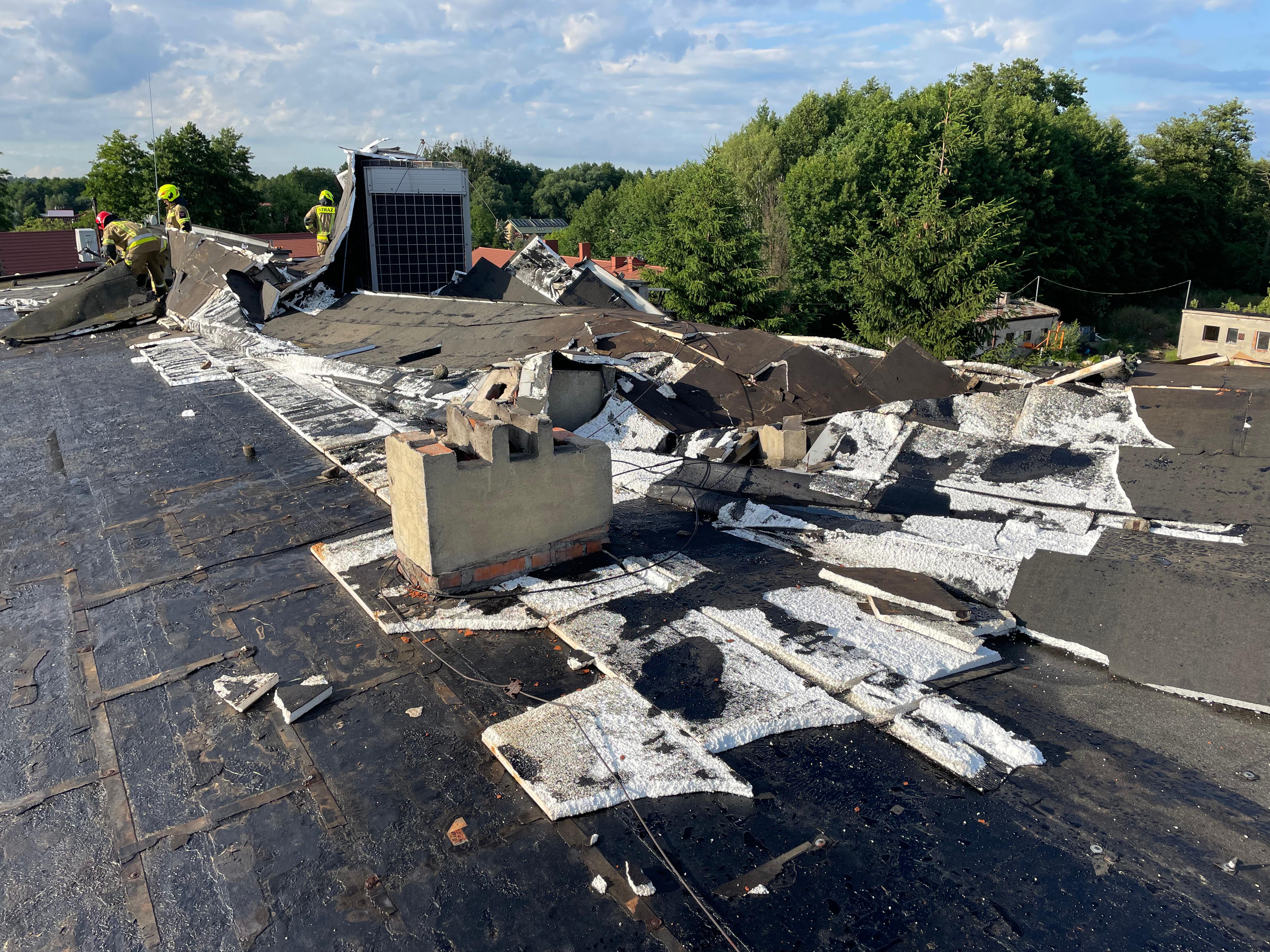 Działania ratownicze prowadzone przez przybyłych na miejsce strażaków polegały m.in. na zabezpieczeniu miejsca zdarzenia, ocenie stanu konstrukcji budynku, usunięciu luźnych elementów pokrycia dachowego przy pomocy podręcznego sprzętu burzącego i podnośnika SHD 25, wykonaniu doraźnego zabezpieczenia uszkodzonej powierzchni dachu za pomocą plandek, pozyskanych z magazynu Powiatowego Centrum Zarządzania Kryzysowego.