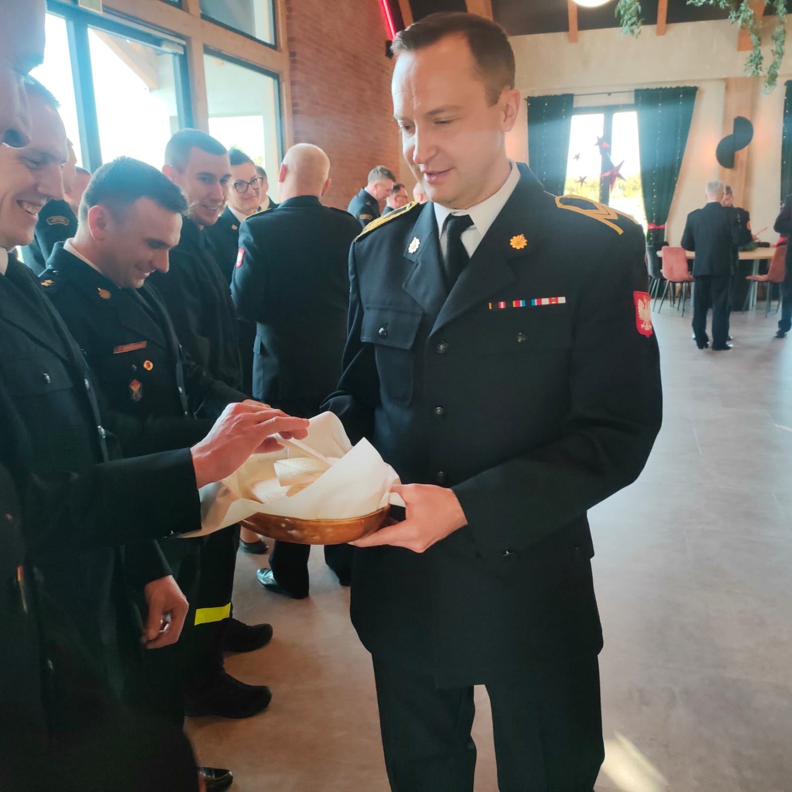 Podczas spotkania Komendant Powiatowy PSP w Brzezinach st. bryg. Mariusz Kaczmarski wraz z pozostałymi gośćmi złożyli życzenia wszystkim funkcjonariuszom i pracownikom cywilnym z okazji zbliżających się Świąt Bożego Narodzenia oraz nadchodzącego Nowego Roku. Następnie, po odczytaniu Ewangelii przez ks. Kapelana, wszyscy obecni przełamali się opłatkiem i usiedli do wspólnej wieczerzy.