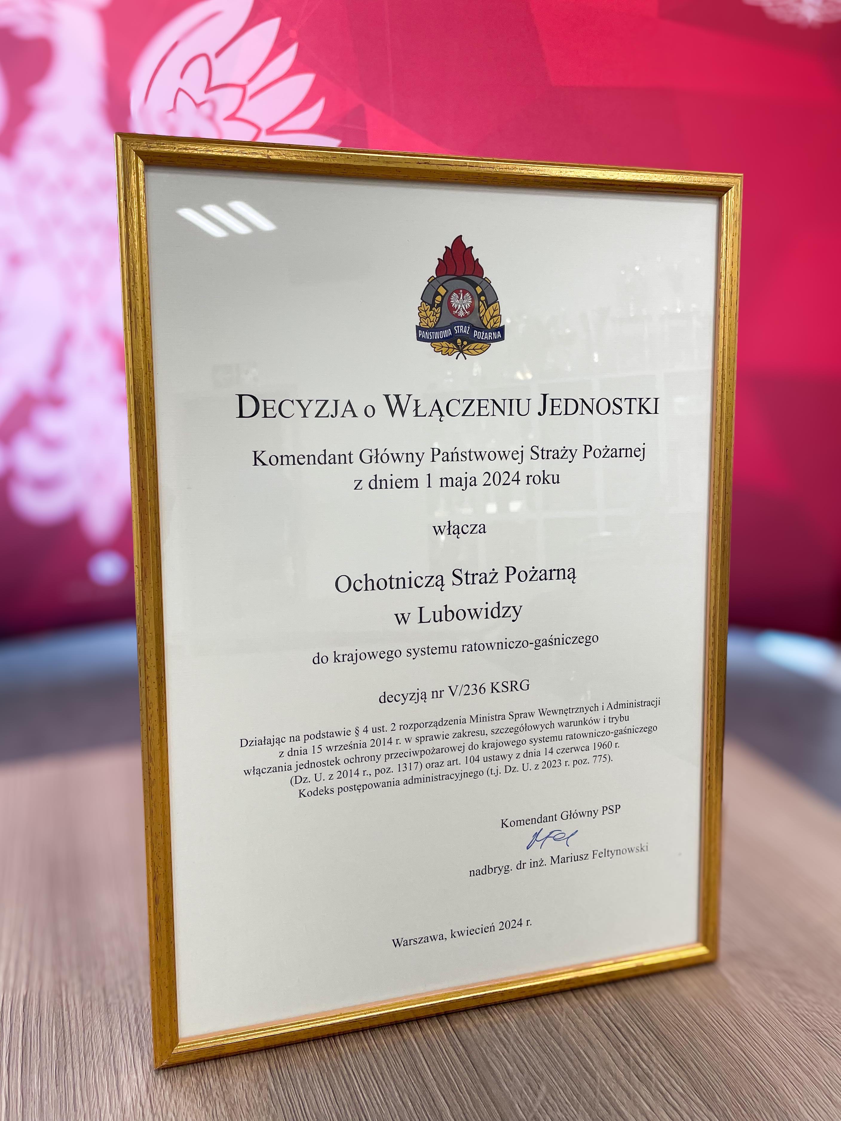 Nr V/236 KSRG włączył jednostkę Ochotniczej Straży Pożarnej w Lubowidzy do Krajowego Systemu Ratowniczo-Gaśniczego.