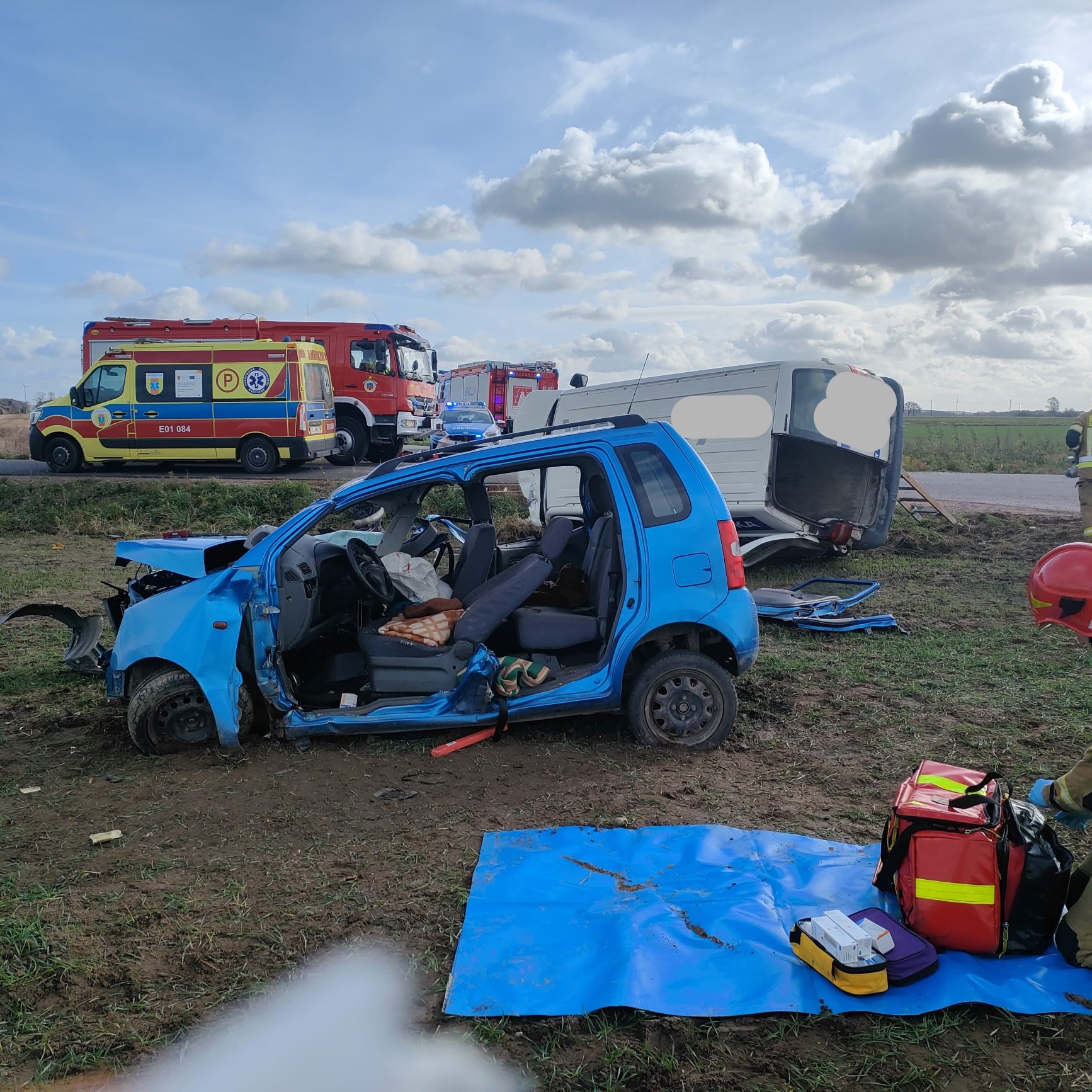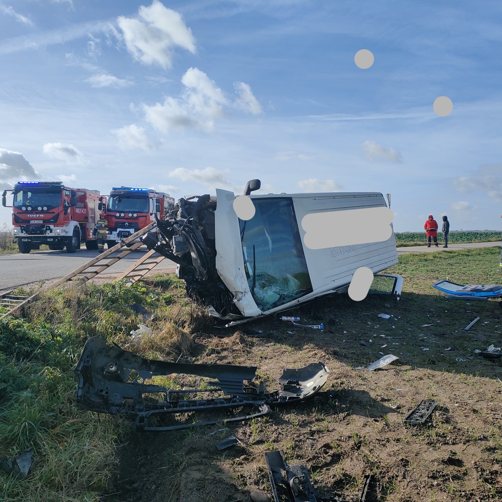 Dwie osoby poszkodowane po wykonanej diagnostyce na miejscu zdarzenia przez załogę Zespołu Ratownictwa Medycznego zostały przetransportowane do Jednostek Ochrony Zdrowia, niestety osoby, która wypadła z samochodu nie udało się uratować. W trakcie działań ruch na drodze powiatowej był całkowicie zablokowany. W działaniach ratowniczych udział brały cztery zastępy jednostek ochrony przeciwpożarowej.