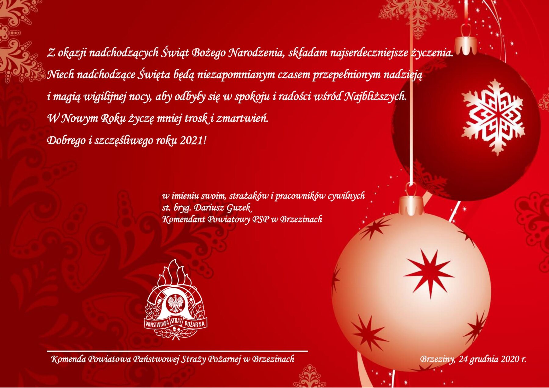 Życzenia Bożonarodzeniowe Komendanta Powiatowego PSP w Brzezinach 24.12.2020 Zdjęcia (1) Pokaż zdjęcie 1 z galerii.
