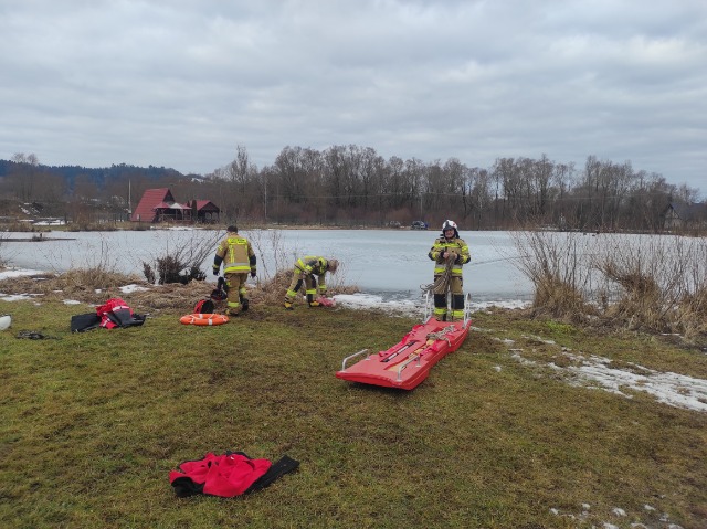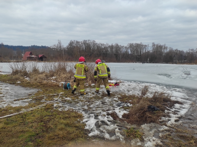 Akcja ratownicza na zalodzonym stawie w Temeszowie